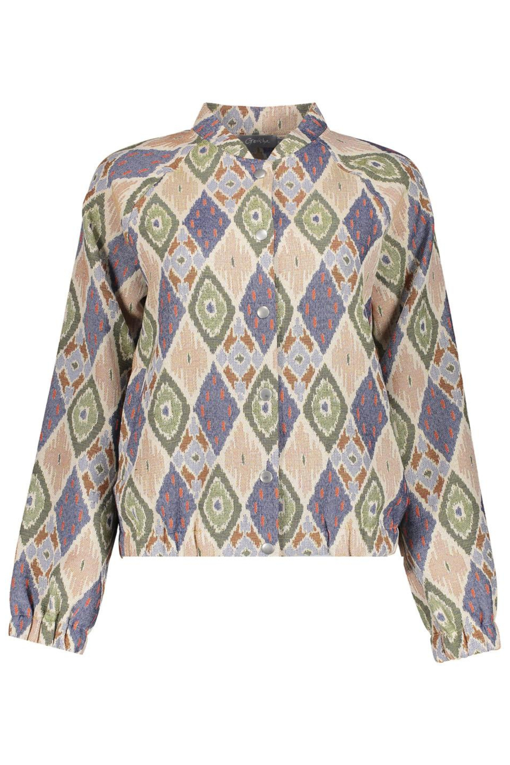 Deze casual damesjas van Geisha is een echte blikvanger in je garderobe. Gemaakt van een mix van 67% polyester en 33% katoen, biedt deze jas een duurzame en comfortabele pasvorm. Met zijn regelmatige pasvorm en lange mouwen, is deze jas ideaal voor de lente. De grafische print in stijlvolle kleuren zoals olijfgroen, indigo en zand geeft de jas een unieke uitstraling die makkelijk te combineren is met de rest van je kleding. Uitgerust met praktische steekzakken en een drukknoopsluiting, past deze Geisha jas perfect bij een relaxte, casual stijl. De ronde halslijn voegt een subtiele, vrouwelijke touch toe, terwijl de korte lengte een moderne flair geeft. Deze jas is perfect voor een informele dag in de stad of een ontspannen middag in het park. Of je nu een wandeling maakt of met vrienden afspreekt, deze jas maakt je look compleet en comfortabel. Meer informatie: De totale lengte is 53 cm bij maat S/36.
