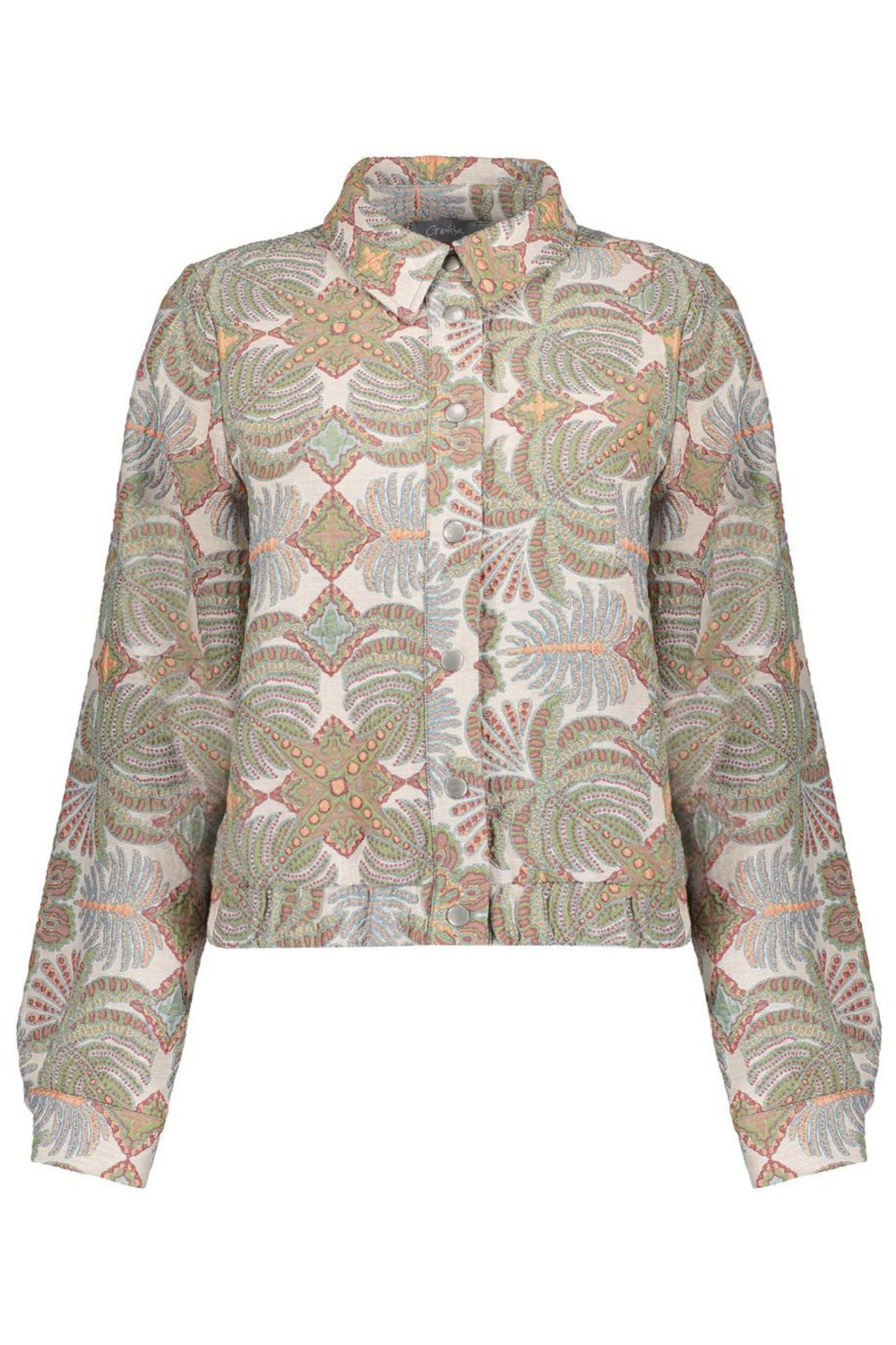 Deze Geisha damesjas is een verfijnde keuze voor de lente. Met zijn grafische patroon in kit- en olijftinten brengt hij kleur en stijl naar je garderobe. De jas heeft een regelmatige pasvorm en is voorzien van een drukknoopsluiting, wat een casual uitstraling geeft. Het ontwerp heeft een puntkraag en lange mouwen, waardoor het veelzijdig te combineren is met verschillende outfits. Of je nu een dagje de stad ingaat of een informele ontmoeting hebt, deze jas biedt comfort en stijl. De kortere lengte van deze Geisha jas maakt hem ideaal voor een gelaagde look. De unieke grafische print geeft een speelse touch, terwijl de zachte kleuren makkelijk matchen met diverse items in je kledingkast. Draag hem over een basic top of combineer met een lichte blouse voor een frisse voorjaarslook. Laat dit stijvolle item jouw dagelijkse avonturen vergezellen. Meer informatie: De totale lengte is 51 cm bij maat S/36.