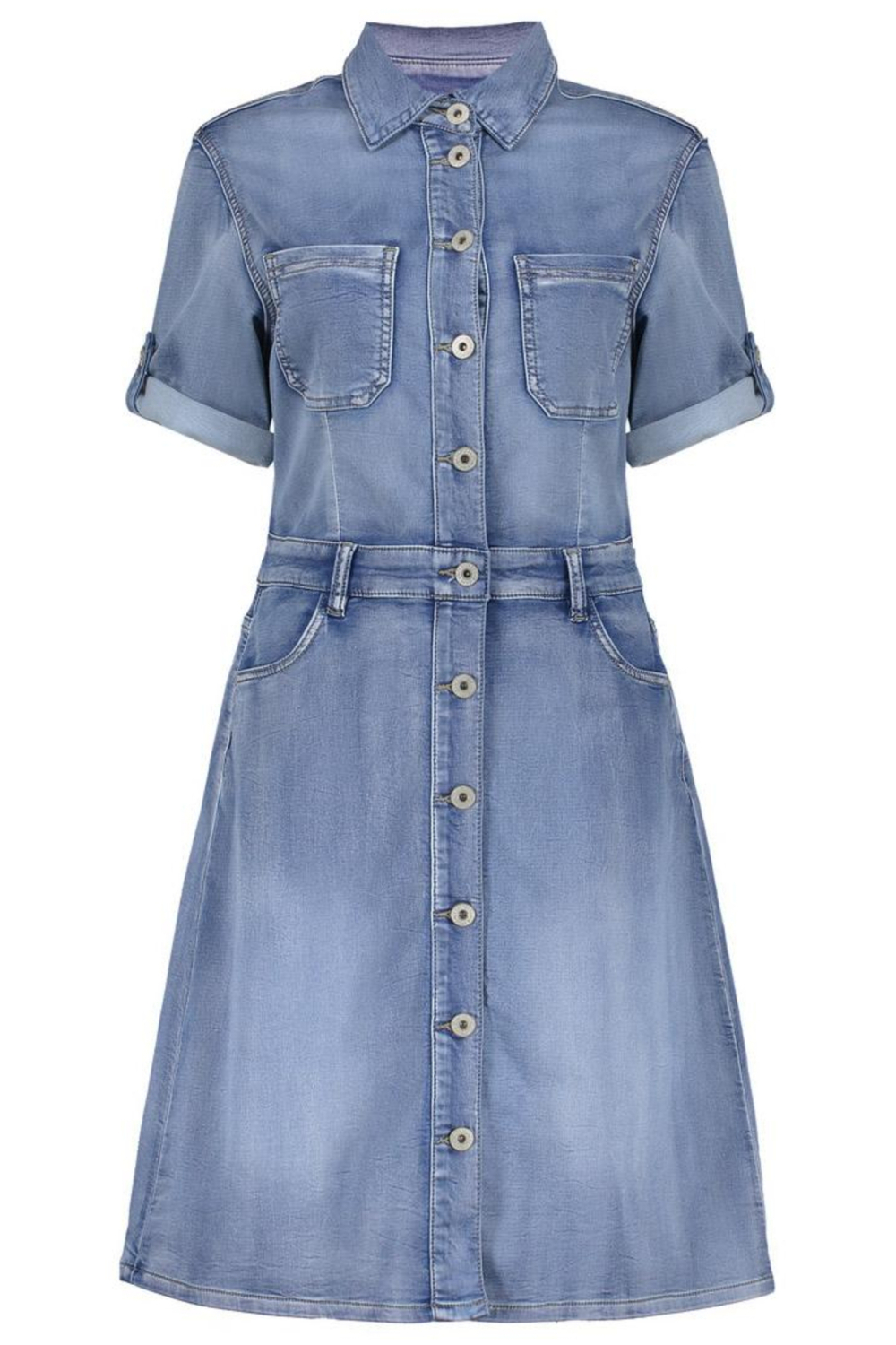 De Geisha denim jurk in mid blue denim biedt een tijdloze uitstraling die veelzijdig inzetbaar is. Het stonewash design en de halflange lengte zorgen voor een casual doch stijlvolle look, ideaal voor informele gelegenheden of een dagje uit. Met een puntkraag en een knoopsluiting, biedt deze jurk een klassieke touch aan je outfit. Dankzij de regular fit pasvorm blijf je comfortabel, terwijl het zachte materiaal van 83% katoen, 15% polyester, en 2% elastaan zorgt voor de nodige bewegingsvrijheid en duurzaamheid. De korte mouwen en steekzakken voegen praktische details toe, waardoor deze Geisha jurk niet alleen stijlvol maar ook functioneel is. Draag het met sneakers voor een ontspannen dagje winkelen of combineer met hakken voor een avondje uit. De veelzijdige toepassing van deze denim jurk maakt het een waardevolle aanvulling op je garderobe. Of je nu naar een casual lunch gaat of een middagje doorbrengt in de stad, met deze jurk ben je altijd goed gekleed. Meer informatie: De totale lengte is 98 cm bij maat S/36.