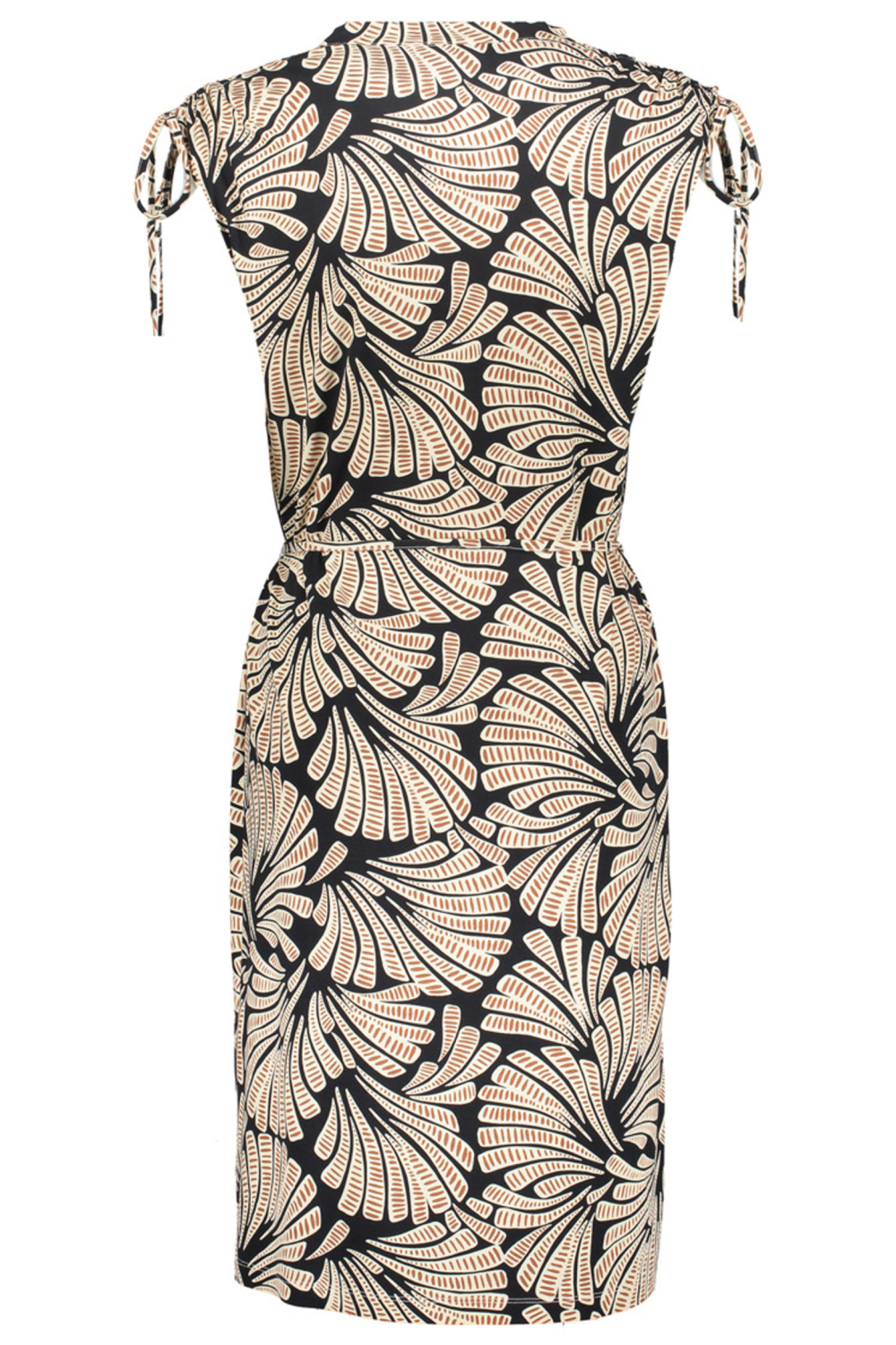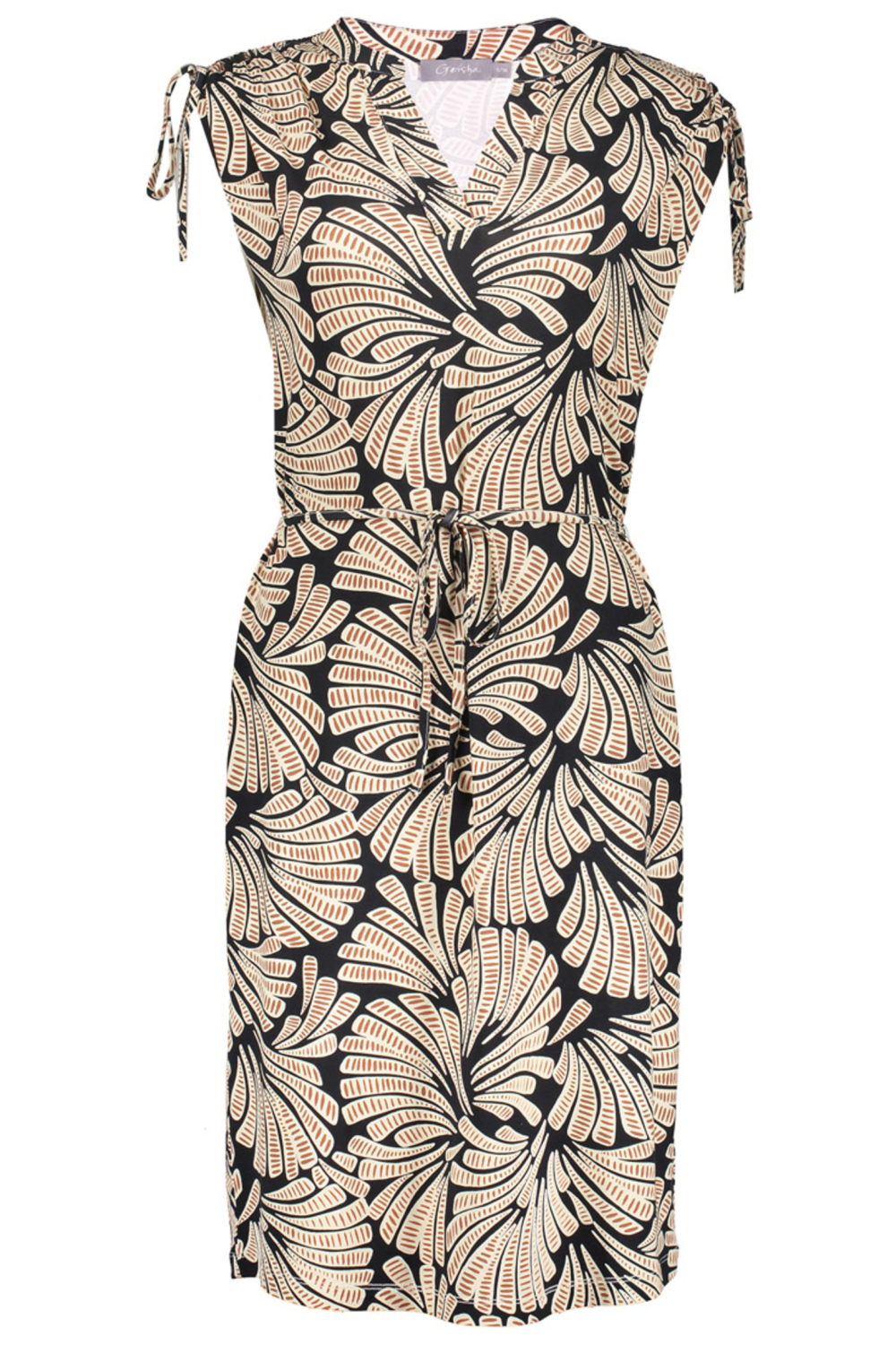 De Geisha jurk voor dames is een stijlvolle toevoeging aan je zomergarderobe. Deze jurk is gemaakt van 97% viscose en 3% elastan, wat zorgt voor een comfortabele en soepele pasvorm. De opvallende grafische print in zwart en bruin geeft deze jurk een unieke uitstraling, perfect voor een casual zomerlook. De V-hals voegt een elegant detail toe, terwijl de kapmouwen zorgen voor een luchtige en moderne uitstraling. Met een lengte van 7/8 valt de jurk net boven de knie, wat het geschikt maakt voor zowel een informele dag als een diner in de zomeravond. Draag deze Geisha jurk naar een dagje uit of combineer hem met je favoriete sandalen voor een ontspannen middag. De regular fit pasvorm maakt het makkelijk te dragen voor verschillende lichaamstypes, terwijl het strikdetail op de schouders een speelse touch toevoegt. Het ademende materiaal maakt deze jurk ideaal voor warme dagen, terwijl de stijlvolle print en snit je een verzorgde en modieuze look geven. Of je nu een zomerfeestje bijwoont of naar het terras gaat, deze jurk is een geweldige keuze die je eenvoudig kunt stylen. Meer informatie: De totale lengte is 101 cm bij maat S/36.