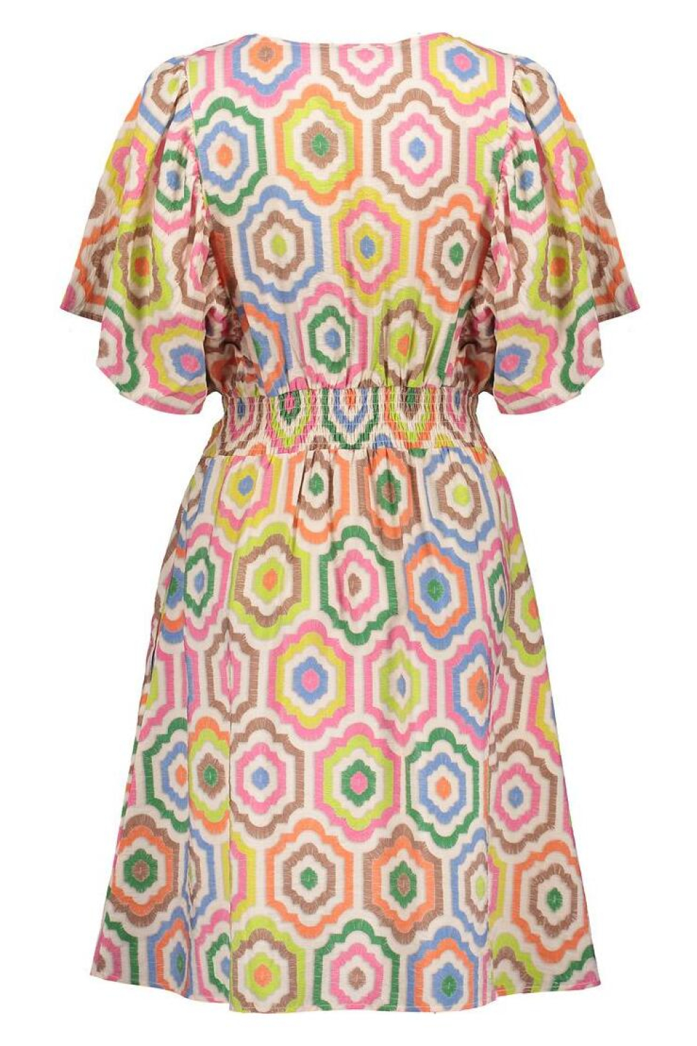 Deze kleurrijke jurk van Geisha is een opvallende toevoeging aan je zomergarderobe. Met een grafisch patroon vol levendige kleuren zoals roze, groen en blauw, straal je een vrolijke en eigentijdse stijl uit. De jurk heeft een flatterende V-hals en korte mouwen, wat hem ideaal maakt voor warme zomerdagen. Gemaakt van 83% viscose en 17% polyamide, biedt hij een lichte en ademende stof die comfortabel draagt. De halflange lengte en regular fit zorgen voor een tijdloze pasvorm die geschikt is voor uiteenlopende gelegenheden. Draag deze jurk tijdens een ontspannen dagje uit of een zomerse barbecue. Dankzij de elastische tailleband accentueert hij je silhouet op een subtiele manier, terwijl de steekzakken een praktisch element toevoegen. Of je hem nu combineert met sandalen voor een casual look of met hakken voor een iets formelere uitstraling, deze Geisha jurk is een veelzijdige keuze voor iedere zomerse dag. Meer informatie: De totale lengte is 97 cm bij maat S/36.