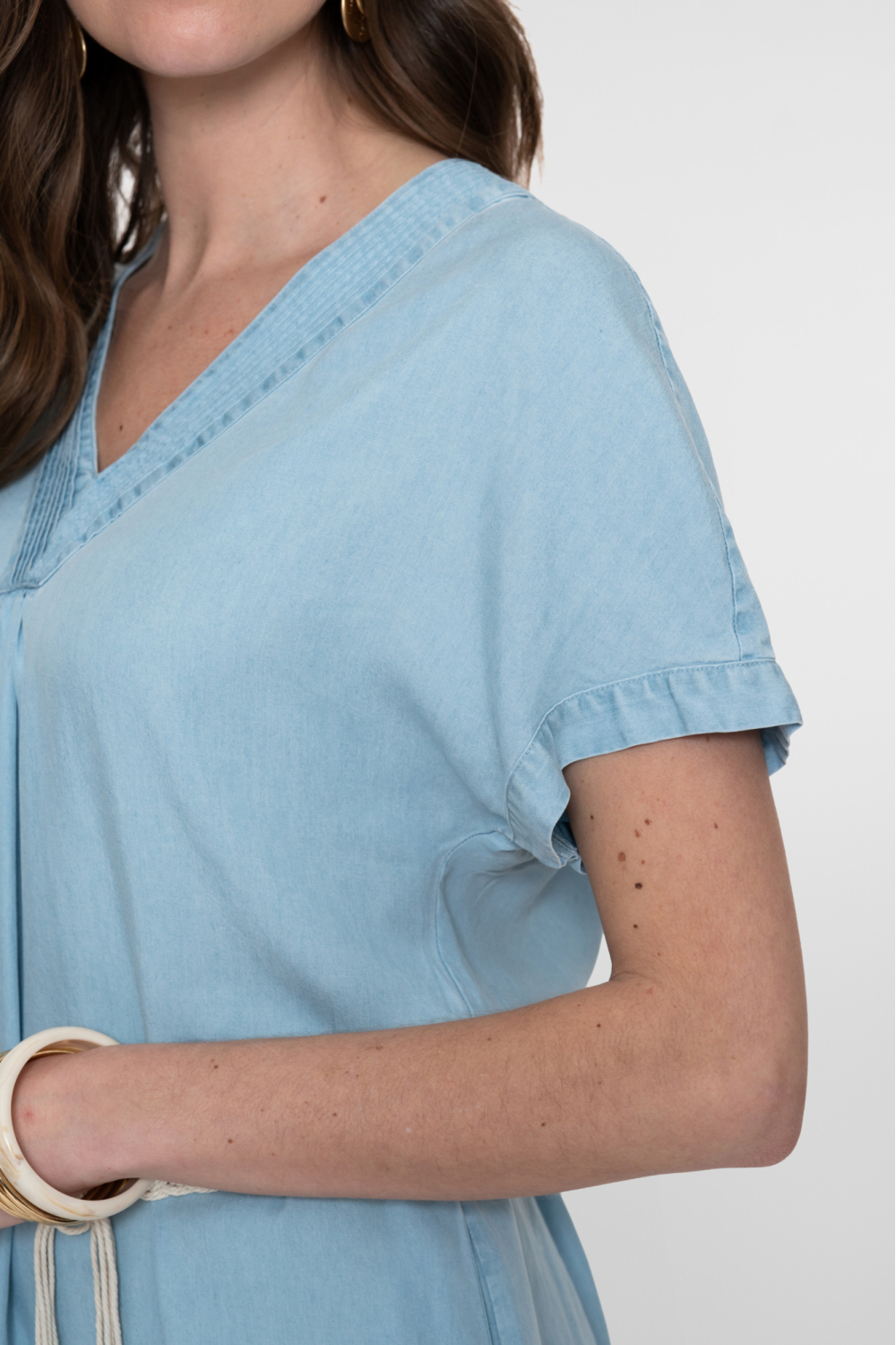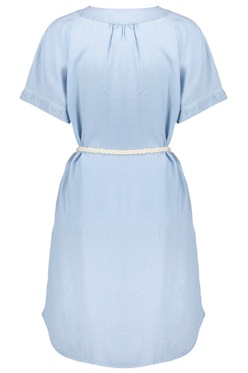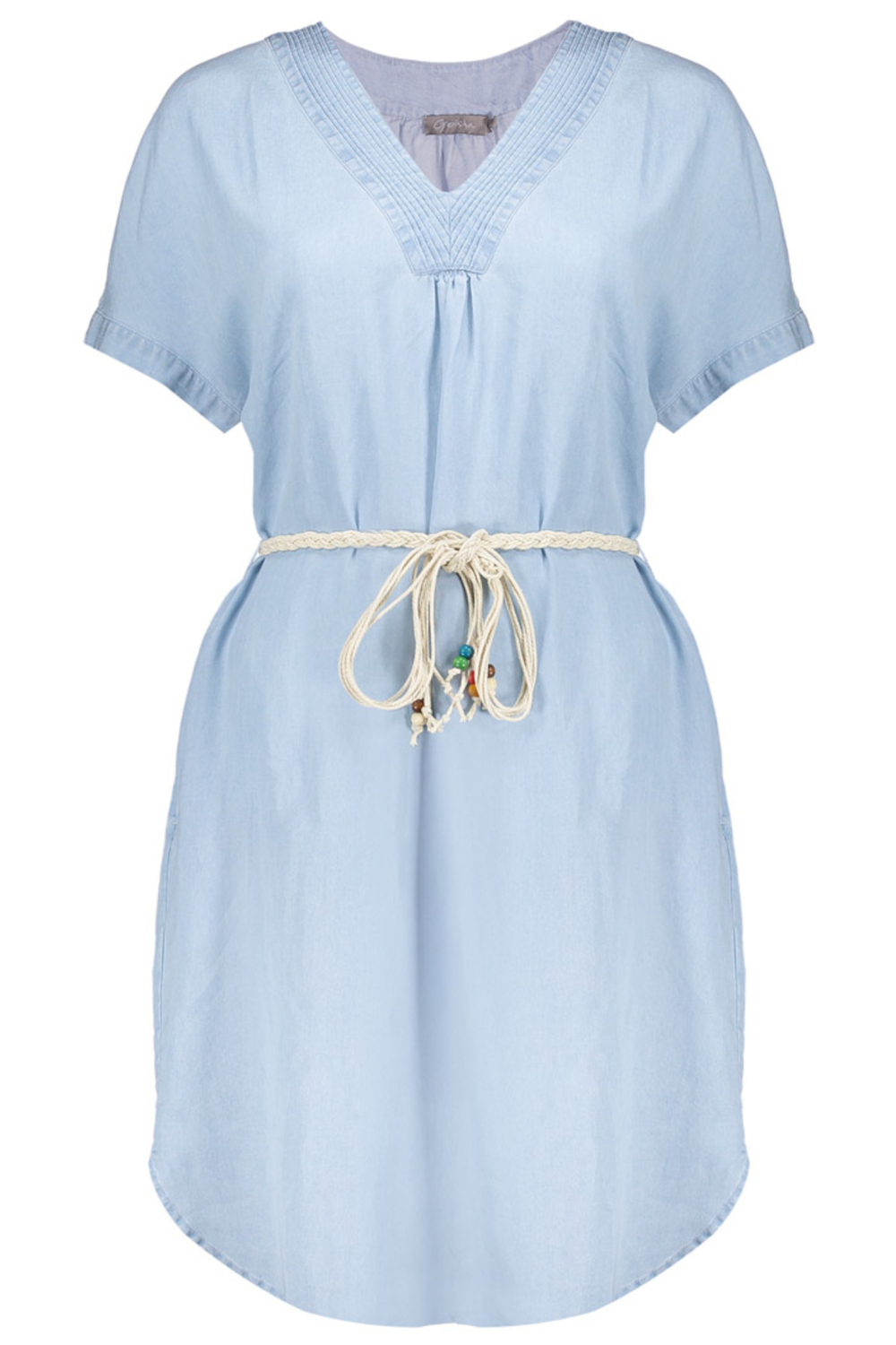 Deze denim jurk van Geisha is een stijlvolle keuze voor de zomer. Gemaakt van 100% lyocell, biedt de jurk een comfortabele en luchtige pasvorm die perfect is voor warme dagen. De bleached denim kleur en V-halslijn geven een frisse, moderne uitstraling. Met korte mouwen en een halflange lengte is deze jurk ideaal voor een ontspannen dagje uit of een casual diner. De jurk heeft stijlvolle steekzakken en wordt geaccentueerd met een gevlochten riem die je vrouwelijke silhouet benadrukt. De regular fit zorgt ervoor dat je je vrij kunt bewegen, terwijl het zachte materiaal een gevoel van luxe biedt. Combineer deze jurk met je favoriete sandalen voor een moeiteloze en chique look. Of je nu een dag op het strand doorbrengt of een lunchafspraak hebt, de Geisha denim jurk is zowel veelzijdig als elegant. Meer informatie: De totale lengte is 95 cm bij maat S/36.
