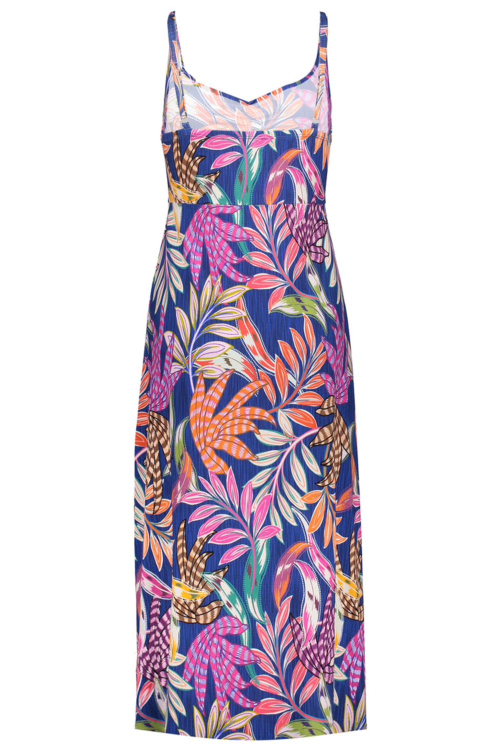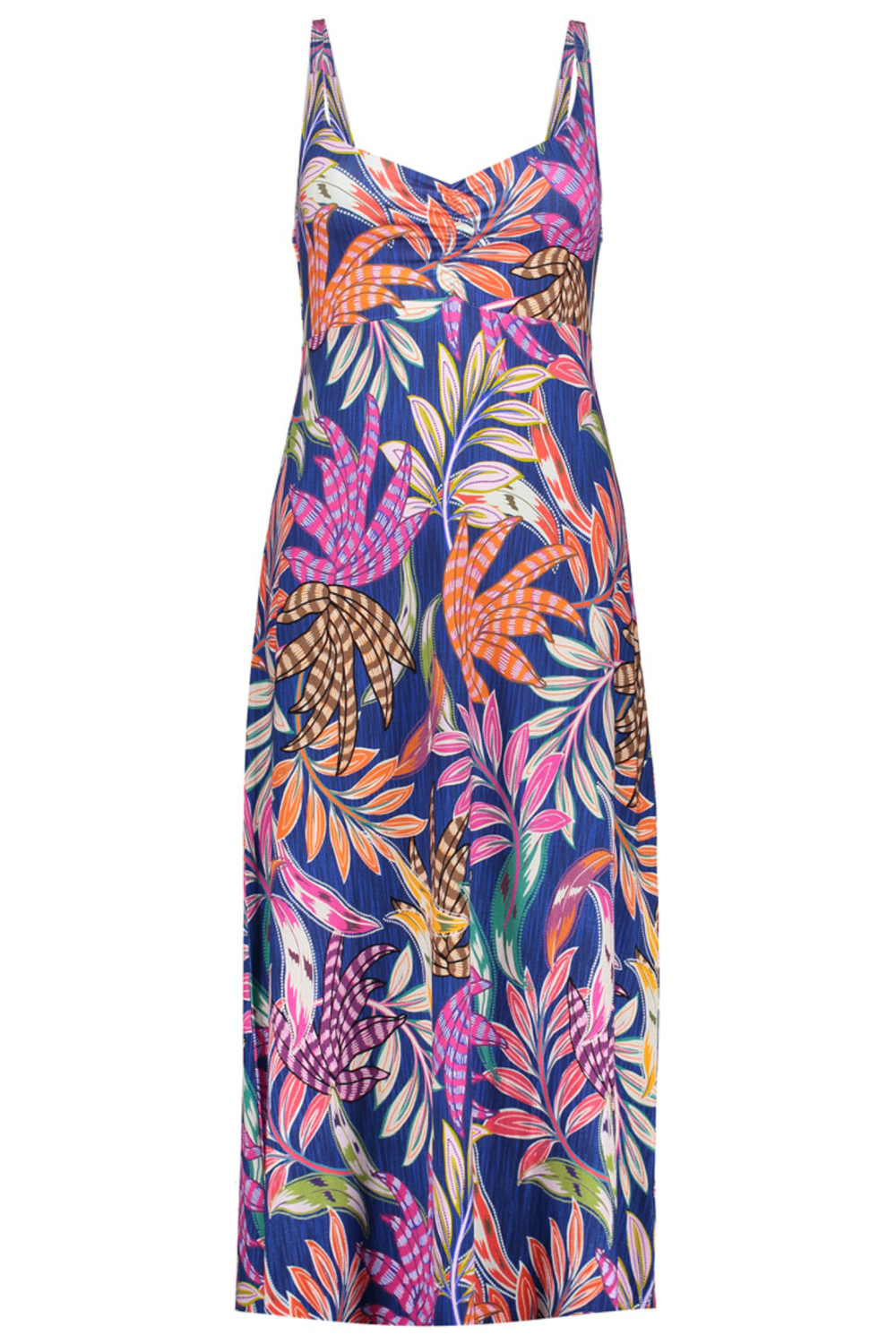 Deze opvallende bloemenjurk van Geisha is een prachtige aanwinst voor jouw zomergarderobe. Met een levendig bloemenpatroon op een diepblauwe achtergrond, biedt deze jurk een perfecte balans tussen stijl en comfort. Dankzij de soepel vallende halflange zoom en spaghettibandjes is dit ontwerp ideaal om je te vergezellen tijdens warme, zonnige dagen. De V-hals voegt een elegante touch toe, terwijl de lichte stoffensamenstelling van 95% viscose en 5% elastan zorgt voor een aangename pasvorm. Deze casual Geisha jurk is veelzijdig en kan gedragen worden bij diverse gelegenheden. Of je nu een ontspannen wandeling maakt over een boulevard of geniet van een weekendbrunch met vrienden, deze jurk past perfect bij elke zomerse setting. Combineer met sandalen en minimalistische accessoires voor een moeiteloze, stijlvolle look. Met de regular fit blijf je comfortabel en vrij in beweging, wat deze jurk een praktische keus maakt voor elke dag. Meer informatie: De totale lengte is 112 cm bij maat S/36.