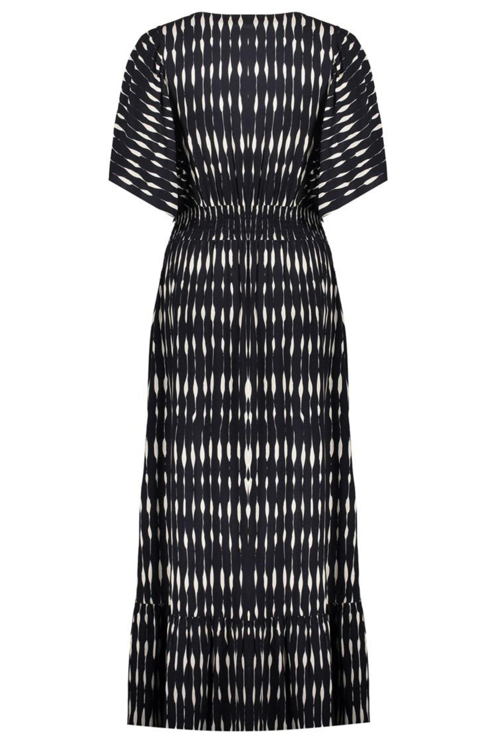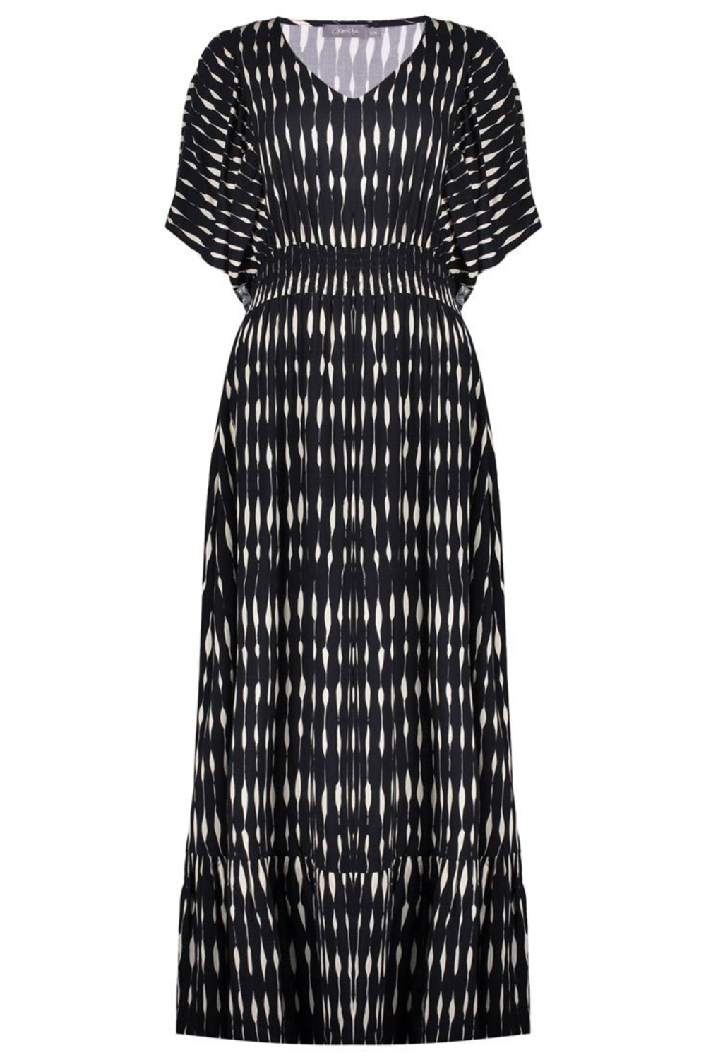 Deze stijlvolle lange jurk van Geisha is een perfecte keuze voor de lente. Het grafische patroon in zwart en ecru geeft een moderne touch aan je dagelijkse look. De jurk is gemaakt van 100% viscose, wat een zachte en vloeiende pasvorm biedt. De regular fit en korte mouwen maken het een comfortabele optie voor een casual dagje uit. De V-hals voegt een subtiele elegantie toe, zodat je met vertrouwen elke gelegenheid tegemoet treedt. Of je nu een wandeling door het park maakt of een informeel diner hebt, deze Geisha jurk past bij zowel ontspannen als meer geklede settings. De langere lengte en de flatterende pasvorm zorgen ervoor dat je stijlvol voor de dag komt. Combineer met je favoriete accessoires voor een persoonlijke touch. Deze jurk is een veelzijdige aanvulling op je garderobe, geschikt voor diverse gelegenheden waarbij comfort en stijl hand in hand gaan. Meer informatie: De totale lengte is 144 cm bij maat S/36.