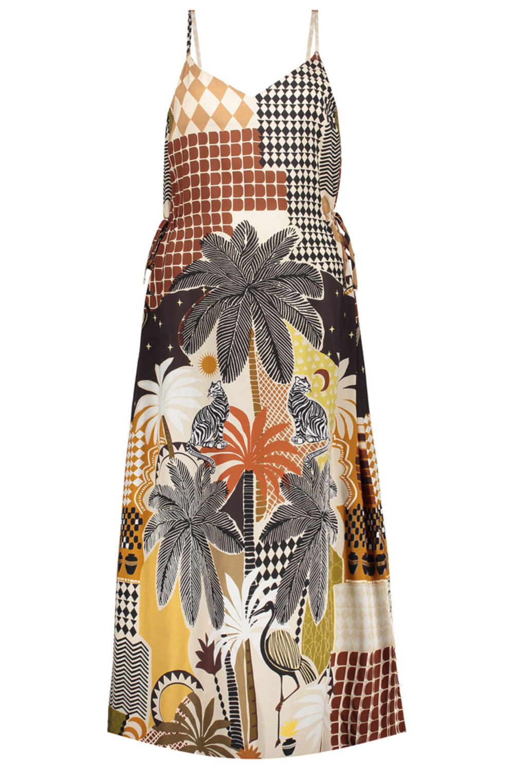 Deze zomerse Geisha jurk is een stijlvolle keuze voor elke casual gelegenheid. Gemaakt van 100% viscose, biedt de jurk een lichte en luchtige stof die ideaal is voor warme dagen. Het grafische patroon onderscheidt zich met contrasterende geometrische vormen en botanische prints, waardoor je outfit een unieke uitstraling krijgt. De jurk heeft een lange lengte en een regular fit, wat zorgt voor een comfortabele pasvorm die je figuur op een elegante manier accentueert. De V-hals en de verfijnde spaghettibandjes geven een vrouwelijke touch, perfect voor een dagje aan het strand of een zomerse picknick. Met praktische steekzakken is de jurk zowel functioneel als modieus. Draag deze Geisha jurk met je favoriete sandalen voor een relaxte look, of combineer hem met hakken voor een verfijnde avonduitstraling. Deze jurk is een veelzijdige aanvulling op je zomergarderobe en biedt zowel comfort als stijl in één kledingstuk. Meer informatie: De totale lengte is 130 cm bij maat S/36.