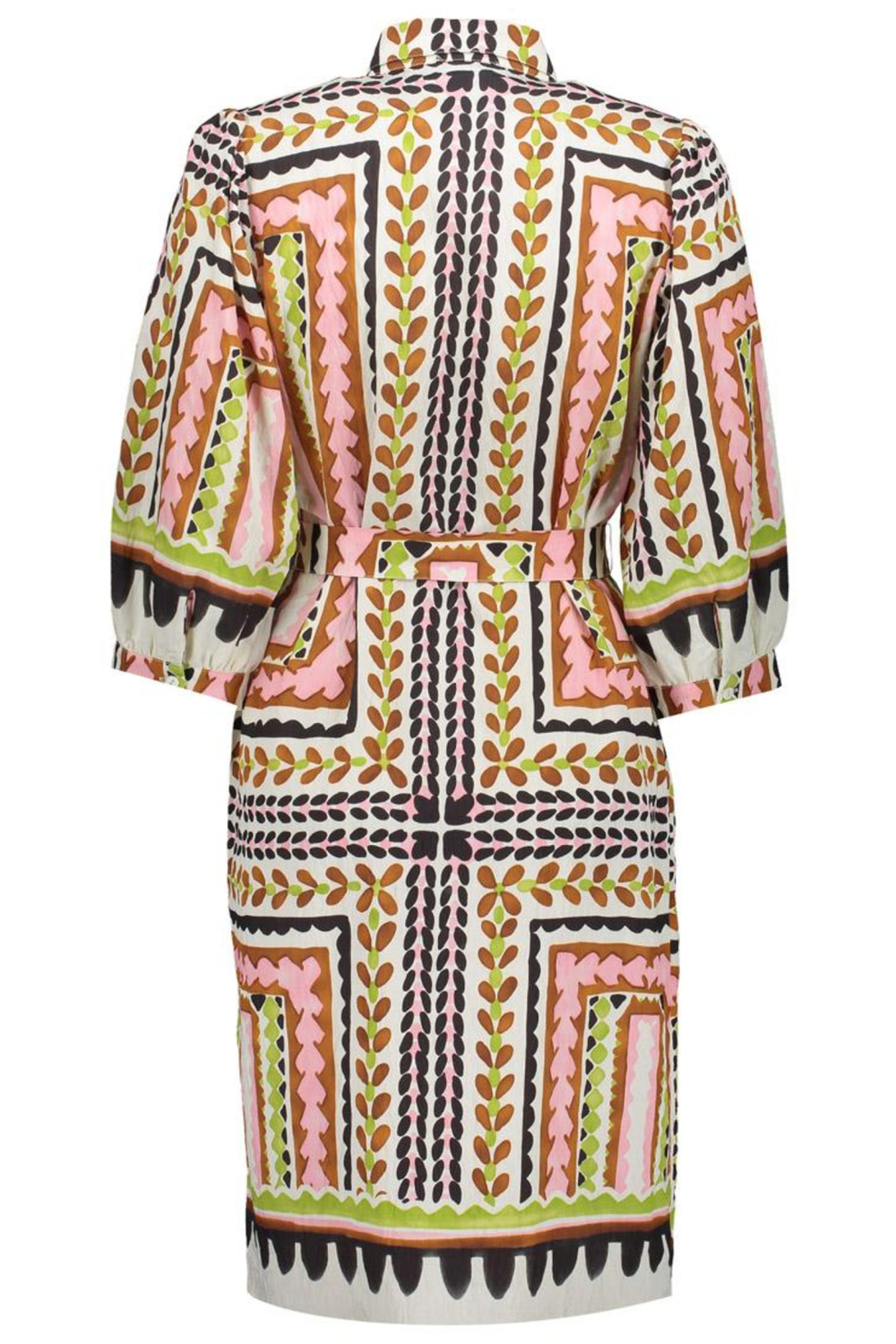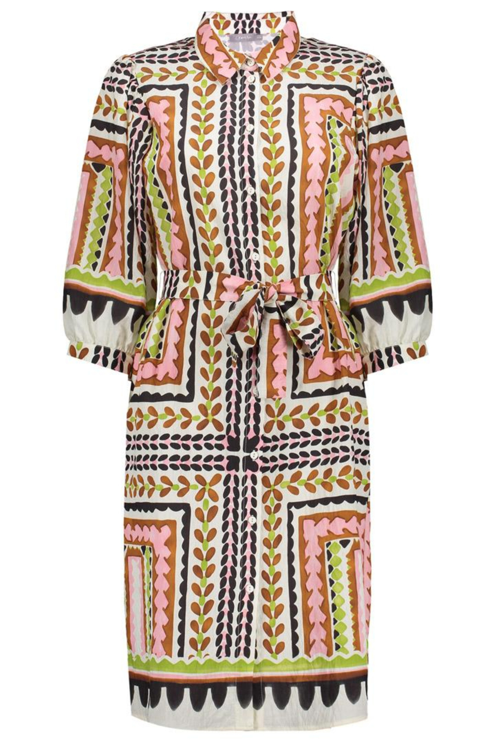 Deze kleurrijke jurk van Geisha is een veelzijdige toevoeging aan jouw lentegarderobe. Met zijn opvallende grafische patroon in warme tinten, maak je gegarandeerd een statement. De 7/8 lengte en 3/4 mouwen maken het een perfecte keuze voor zowel casual als semi-formele gelegenheden. De zachte puntkraag en de knoopsluiting voegen een klassieke touch toe, terwijl de regular fit zorgt voor een comfortabele pasvorm. Dankzij de samenstelling van 83% viscose en 17% polyamide, voelt de stof prettig aan op de huid. De jurk is uitstekend geschikt voor diverse settings. Of je nu een dagje uit gaat of een informele bijeenkomst hebt, deze jurk biedt de juiste balans tussen gemak en stijl. Het opvallende ontwerp maakt het eenvoudig om jouw persoonlijke flair te laten zien. Combineer het met simpele accessoires en laat de jurk de show stelen. Met deze Geisha jurk ben jij verzekerd van een modieuze look die bij elke gelegenheid past. Meer informatie: De totale lengte is 102 cm bij maat S/36.