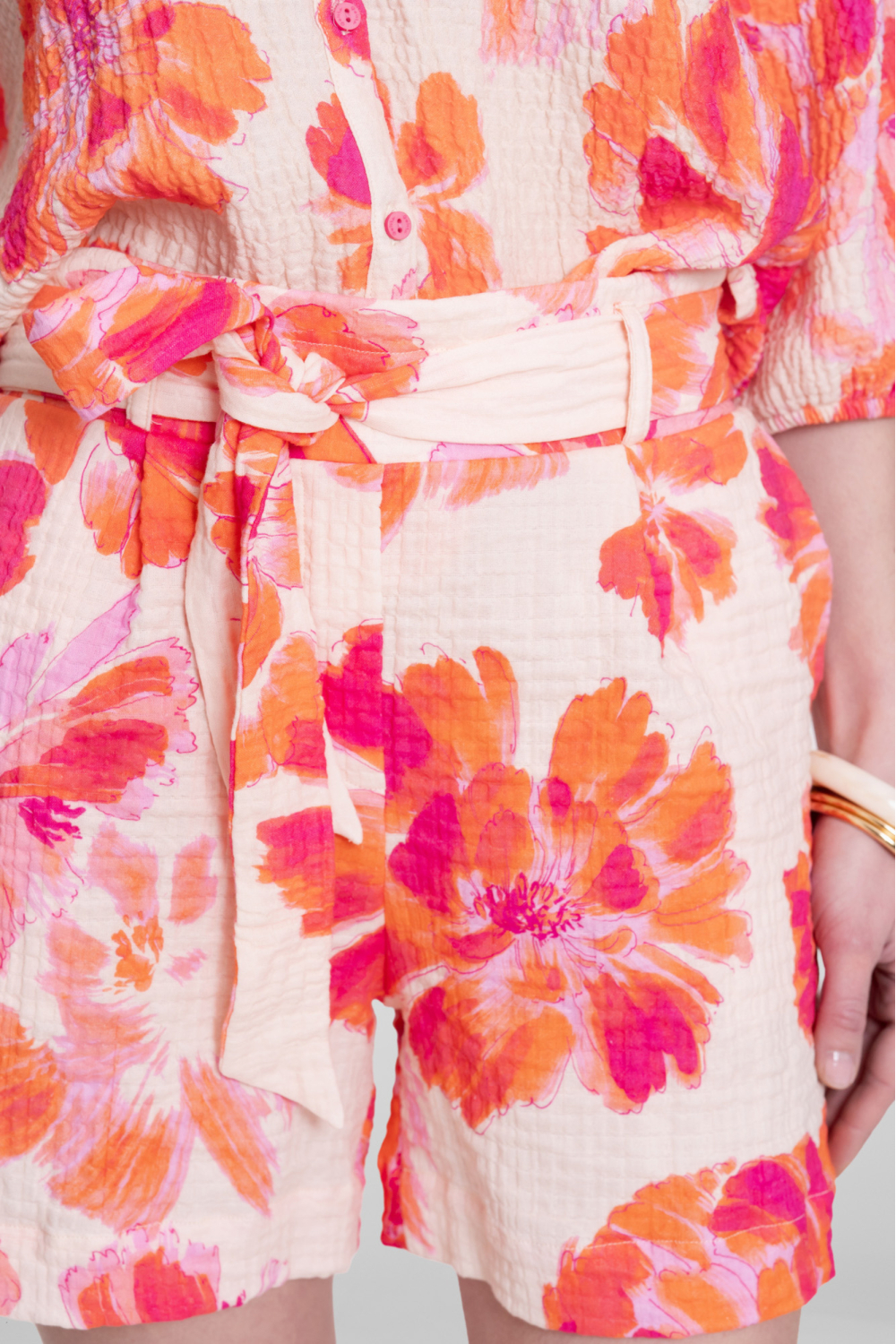 Deze casual korte broek van Geisha is een frisse toevoeging aan je zomergarderobe. De kleurrijke bloemenprint in levendige oranje en roze tinten maakt het een opvallend stuk, perfect voor zonnige dagen. Dankzij de regular fit biedt de broek een comfortabele pasvorm die eenvoudig te combineren is met verschillende tops. De elastische boord zorgt voor extra draaggemak, terwijl het materiaal van 98% katoen en 2% elastan een ademende en flexibele draagervaring biedt. Met de normale lengte en stijlvol strikdetail rond de taille is deze korte broek ideaal voor diverse zomeractiviteiten, van een dagje strand tot een informele lunch. De subtiele structuur in de stof geeft het geheel een elegante touch, terwijl de regular waist zorgt voor een flatterende look voor elke gelegenheid. Deze Geisha korte broek is niet alleen een praktische keus, maar voegt dankzij het levendige ontwerp ook een speelse flair toe aan jouw outfit.