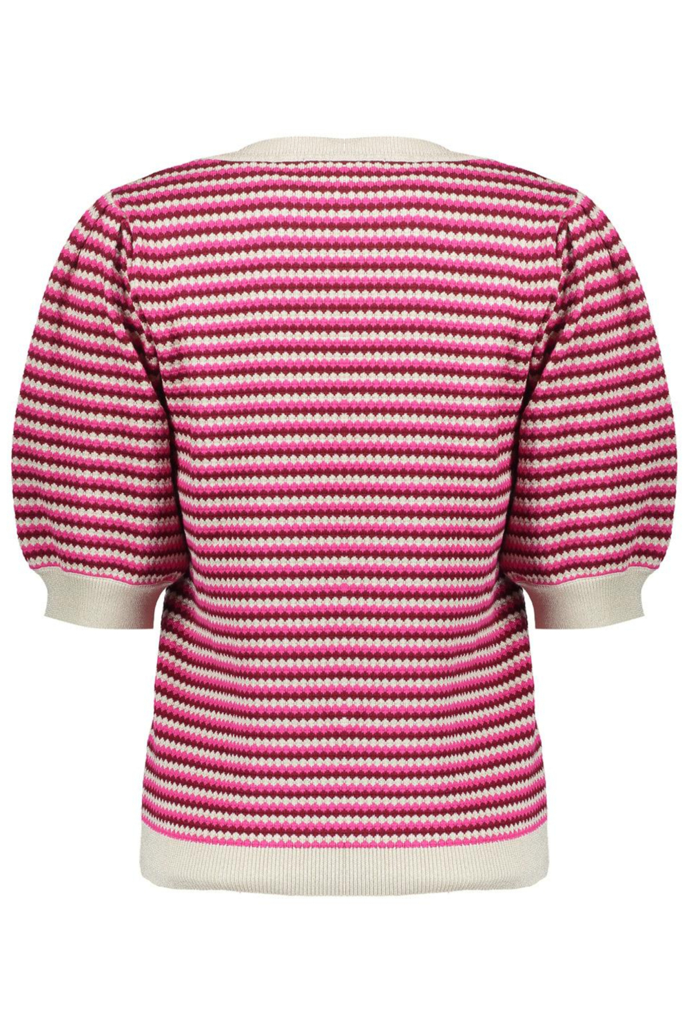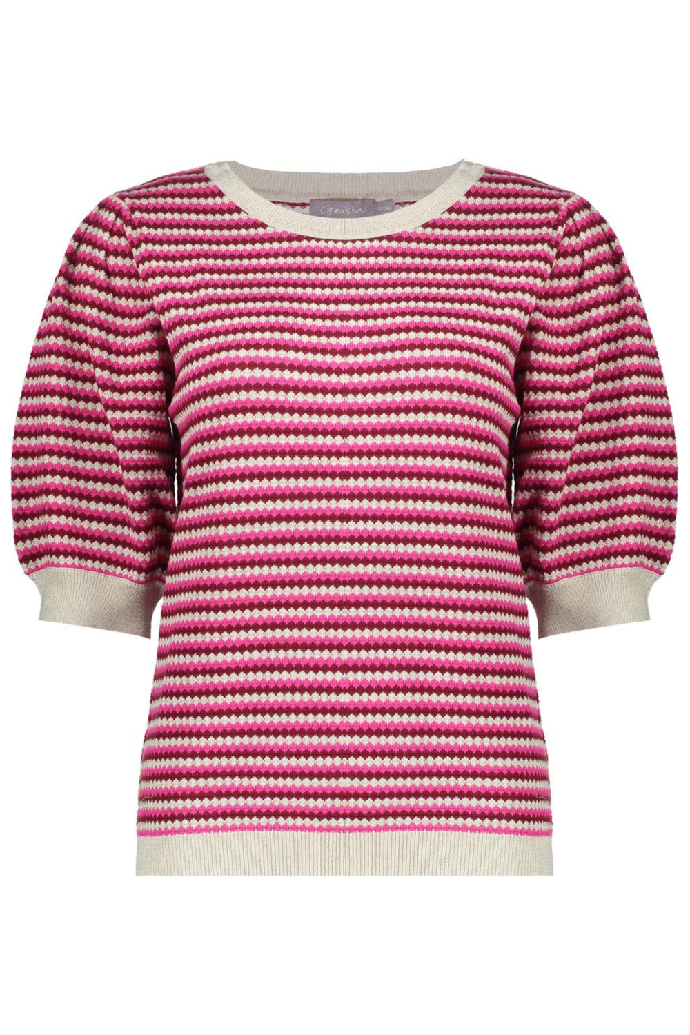 Dit opvallende dames T-shirt van Geisha biedt een combinatie van comfort en stijl die perfect aansluit bij de lente. Gemaakt van een zachte mix van 77% viscose, 19% polyamide en 4% metaalgaren, voelt het materiaal comfortabel aan op je huid. De reguliere pasvorm zorgt ervoor dat het T-shirt zowel elegant als ontspannen valt. De korte mouwen en de speels glinsterende glitterpatroon geven het een unieke uitstraling, ideaal voor een casual dagje winkelen of een ontspannen lunch met vrienden. De ronde hals en de kleurrijke strepen geven dit Geisha T-shirt een modieus karakter, dat makkelijk te combineren is met een nette broek of jeans. Het normale model biedt veelzijdigheid, waardoor het geschikt is voor verschillende gelegenheden, van een dag op kantoor tot een informeel samenzijn. De combinatie van kleuren en het ingebreide patroon zorgen voor een speelse look die in elk seizoen stijlvol oogt.