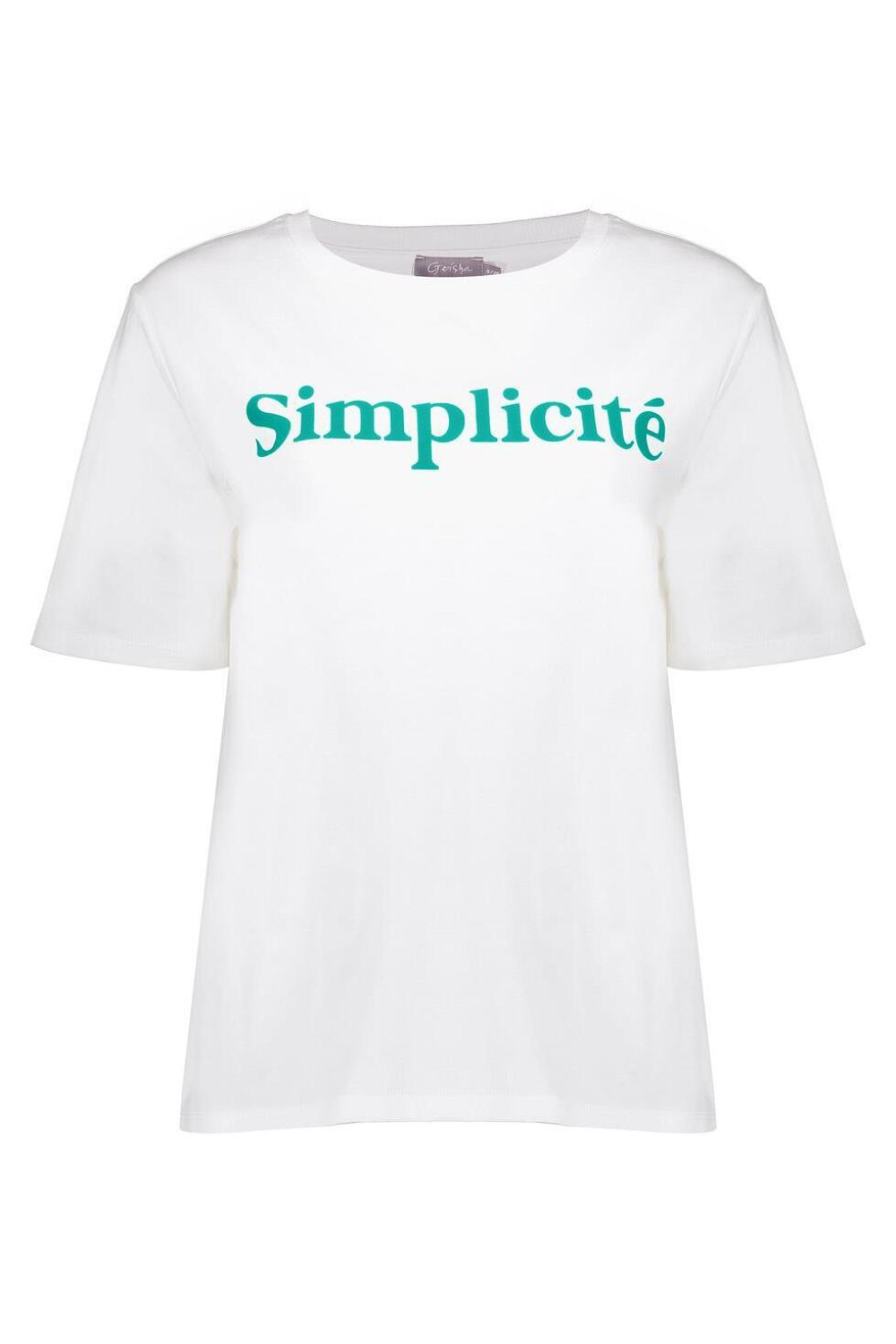 Dit casual dames T-shirt van Geisha is een fijne toevoeging voor je lente-garderobe. Gemaakt van 100% katoen, biedt het T-shirt met zijn zachte stof een aangename, luchtige pasvorm. De regular fit en korte mouwen zorgen voor een ontspannen look, perfect voor dagelijkse activiteiten. De witte basis wordt stijlvol aangevuld door de opvallende groene tekstprint die het woord "Simplicité" benadrukt. Deze subtiele details maken het T-shirt veelzijdig en passend voor zowel een ontspannen dagje thuis als een informele bijeenkomst met vrienden.