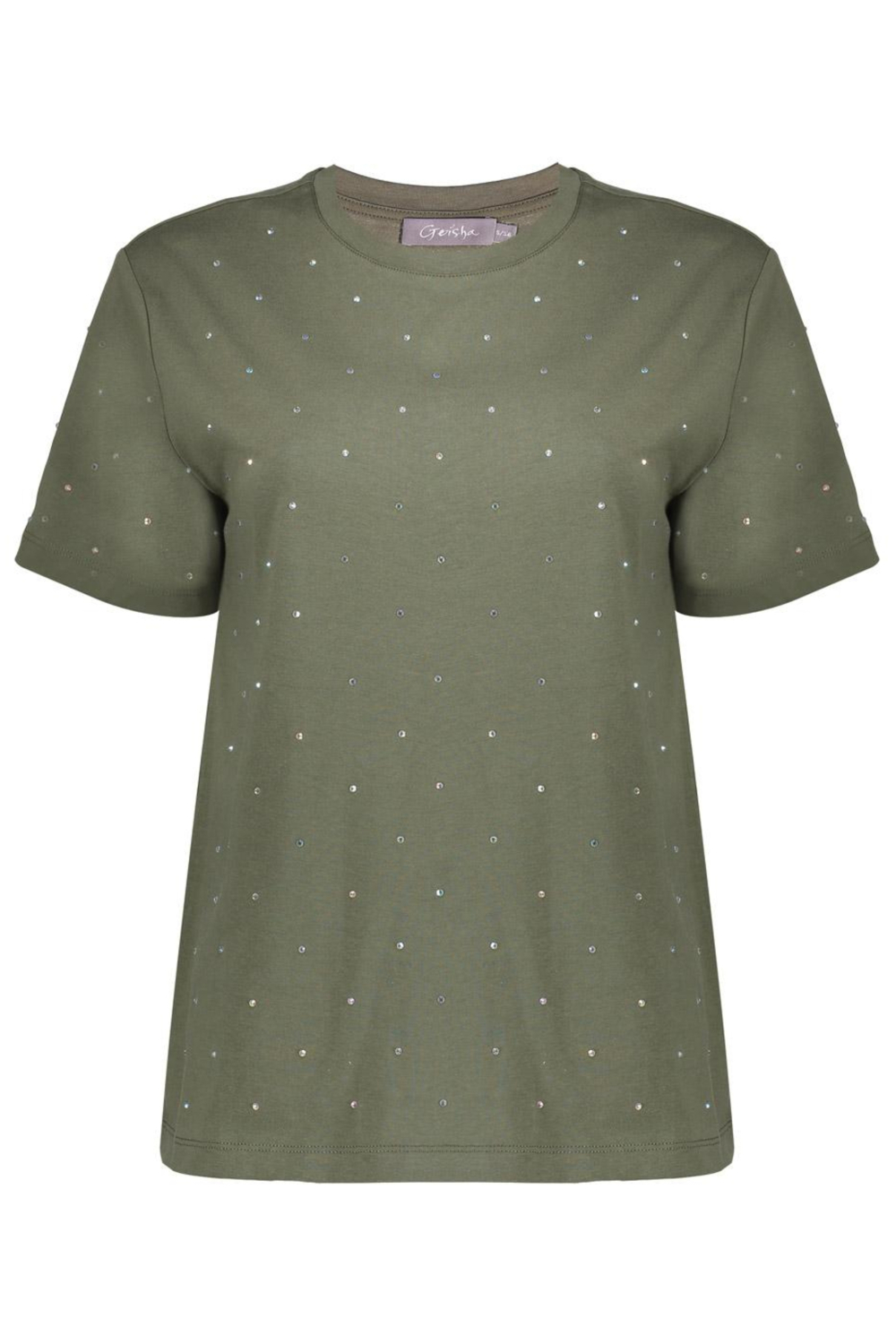 Dit dames T-shirt van Geisha in een subtiele groene tint is een aanvulling die zich moeiteloos aanpast aan je casual herfstgarderobe. Gemaakt van 100% katoen, biedt het je een natuurlijke zachtheid en ademend vermogen dat perfect is voor dagelijks gebruik. De sierlijke strassdetails over de gehele stof geven het T-shirt een verfijnde uitstraling, terwijl de ronde hals en regular fit pasvorm zorgen voor een comfortabele dag. De korte mouwen maken het geschikt voor een relaxte dag bij vrienden of een informele werkdag.Het T-shirt van Geisha combineert coolness met eenvoud, waardoor het een veelzijdig kledingstuk is voor verschillende gelegenheden. Draag het op je favoriete jeans voor een ontspannen koffiemiddag of combineer het met een rok voor een speelse, stijlvolle look. De normale lengte maakt het makkelijk om te dragen met verschillende lagen, van vesten tot jassen. Of je nu een dag de stad ingaat of thuis ontspant, dit T-shirt biedt je stijl zonder het comfort te vergeten.