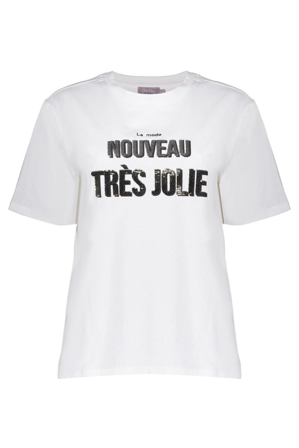 Dit casual dames T-shirt van Geisha is een comfortabele toevoeging aan je herfstgarderobe. Met zijn regular fit biedt het een relaxte pasvorm die niet alleen stijlvol maar ook bijzonder comfortabel is. Het T-shirt heeft een ronde hals en korte mouwen, perfect voor een veelzijdige look. De subtiel aangebrachte pailletten op het woord "Nouveau Très Jolie" geven het shirt een speelse en trendy uitstraling. Gemaakt van 100% katoen voelt het aangenaam zacht aan op de huid, ideaal voor dagelijks gebruik. Dankzij het off-white met zandkleurige tint is dit Geisha T-shirt gemakkelijk te combineren met verschillende outfits. Of je nu kiest voor een casual jeans of een nette rok, het T-shirt voegt een vleugje flair toe aan elke combinatie. Perfect voor informele gelegenheden, zoals een dagje uit of een ontspannen weekend. Met zijn normale lengte past het perfect bij de hedendaagse modetrends, terwijl het toch comfortabel blijft voor de hele dag. Dit T-shirt is een veelzijdige keuze die je garderobe compleet maakt.