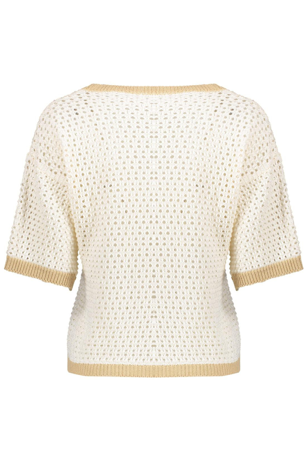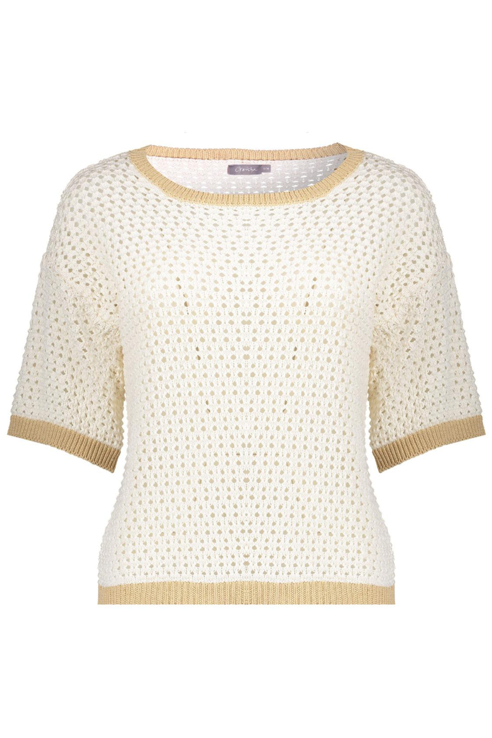 Deze stijlvolle off-white/beige trui van Geisha is een perfecte aanvulling op je zomergarderobe. De trui heeft een regular fit en is gemaakt van een comfortabele mix van 50% katoen en 50% acryl, wat zorgt voor een luchtige en lichte draagervaring. Met de ronde hals en korte mouwen creëert de trui een subtiele en elegante uitstraling. De opengewerkte structuur geeft een speels effect en maakt de trui ideaal voor warme dagen, terwijl de beige boord aan de mouwen en taille een verfijnd contrast biedt.