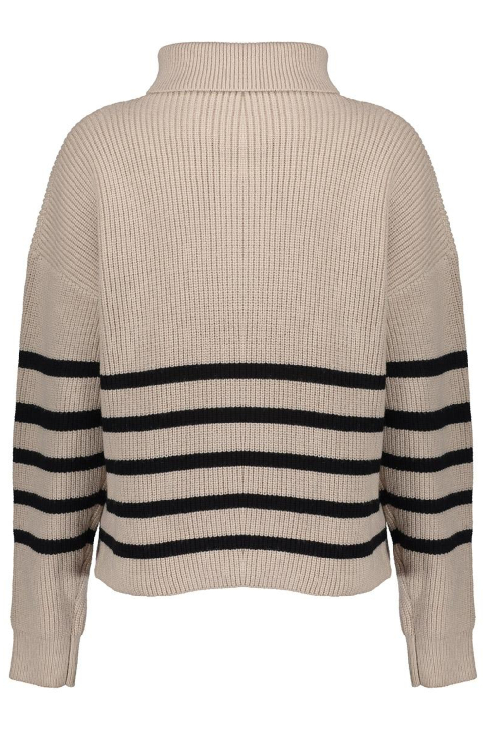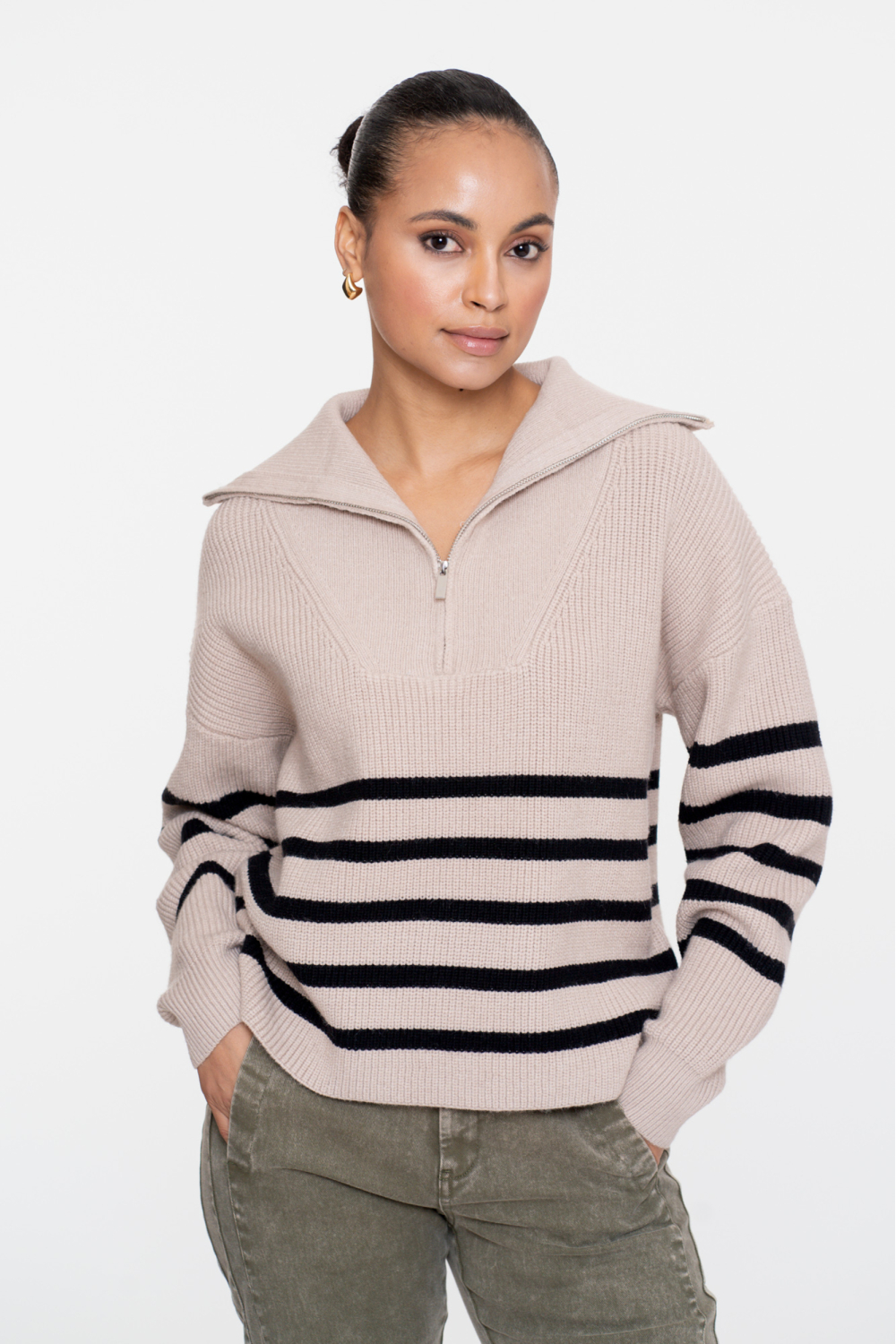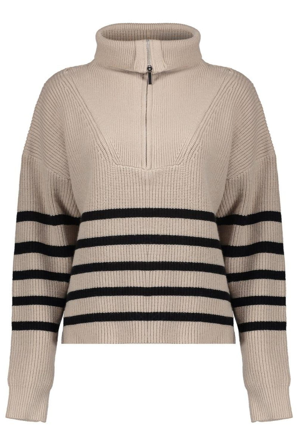 Deze Geisha trui in de kleur sand/black is een veelzijdige keuze voor je garderobe. De regular fit pasvorm zorgt voor een comfortabele ervaring, terwijl de lange mouwen en de normale lengte ervoor zorgen dat het perfect is voor dagelijks gebruik tijdens koelere dagen. De strepen in contrasterende kleuren voegen een speels element toe aan het ontwerp. Met een rits en een puntkraag biedt deze trui een moderne twist aan het klassieke knitwear model.