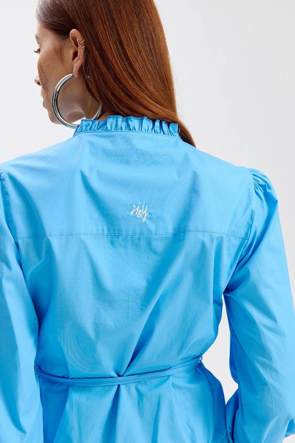 Deze blauwe damesblouse van Harper & Yve is een stijlvolle aanvulling op je garderobe. Het ontwerp valt op door de overslaghals en de speelse ruches die de blouse een elegante uitstraling geven. Deze blouse, gemaakt van 100% katoen, biedt een comfortabele pasvorm en is ideaal voor dagelijks gebruik. Dankzij het strikkoord kun je de taille accentueren, wat bijdraagt aan een flatterend silhouet. Met zijn frisse kleur en casual stijl is deze blouse perfect voor de lente. Combineer het met een lichte jeans voor een ontspannen look, of draag het met een nette broek voor een iets formelere setting. De lange mouwen maken het een veelzijdige keuze die geschikt is voor verschillende gelegenheden, of je nu een dag op kantoor hebt of een lunch met vrienden. Voeg een paar opvallende oorbellen toe voor een afwisselende en stijlvolle outfit.