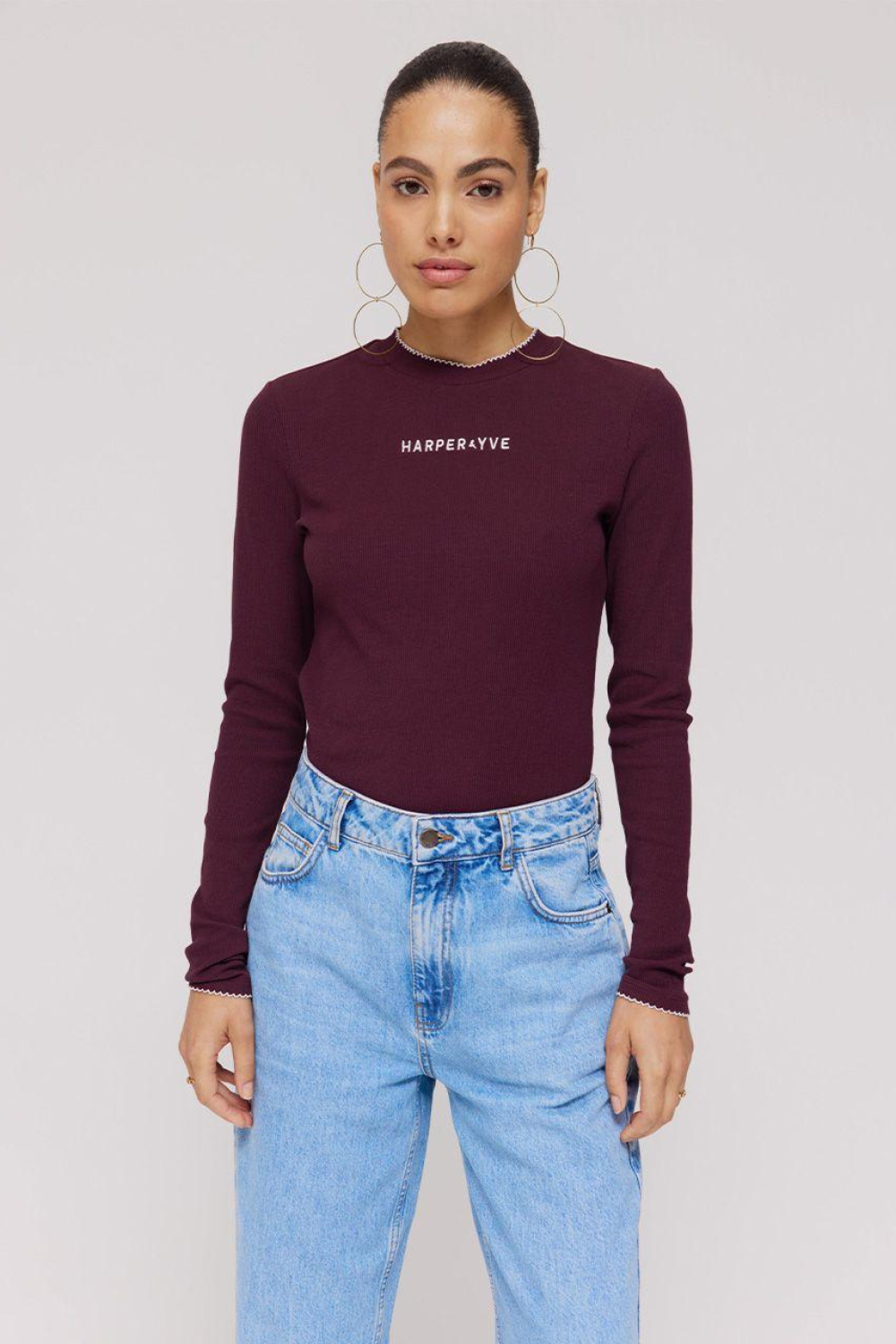 Dit stijlvolle rib T-shirt van Harper & Yve is een prachtige toevoeging aan je wintergarderobe. Gemaakt van 100% katoen, biedt dit shirt de perfecte balans tussen warmte en ademend vermogen. Dankzij de slim fit pasvorm sluit het mooi aan en accentueert het je silhouet. De diepe bordeauxrode kleur geeft een warme uitstraling, ideaal voor de koudere maanden. Met het subtiele Harper & Yve logo op de borst en de verfijnde afwerking bij de ronde hals is dit T-shirt een modieuze keuze voor elke casual outfit. De lange mouwen en normale lengte maken dit Harper & Yve T-shirt perfect geschikt voor allerlei gelegenheden. Combineer het met een comfortabele jeans voor een ontspannen dagje uit, of draag het onder een stijlvolle blazer voor een iets formelere look. Dit veelzijdige T-shirt is een must-have voor de modebewuste vrouw die houdt van een combinatie van comfort en stijl. Of je nu naar een middagborrel gaat of een informeel etentje hebt, met dit T-shirt kom je altijd goed voor de dag.
