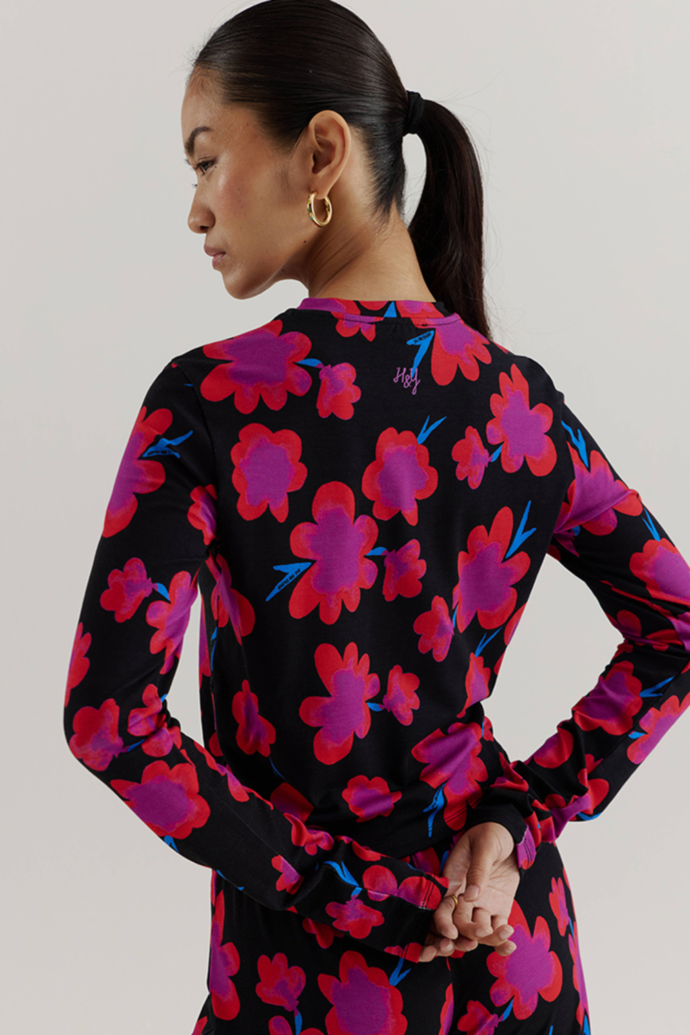 Dit trendy bloemen T-shirt van Harper & Yve is een opvallende toevoeging voor je garderobe. Met zijn levendige rode en paarse bloemendessin op een zwarte achtergrond, biedt het een speelse en moderne look. De ronde hals en lange mouwen maken het een perfecte keuze voor het herfstseizoen. De slim fit pasvorm accentueert je figuur en zorgt voor een elegante uitstraling, of je het nu draagt tijdens een ontspannen dagje uit of een informele bijeenkomst. Gemaakt van 92% viscose en 8% elastan, voelt het T-shirt zacht en soepel aan op de huid. Deze comfortabele mix maakt het makkelijk om de hele dag door te dragen. Combineer dit Harper & Yve T-shirt met een eenvoudige jeans of een stijlvolle rok voor verschillende gelegenheden. Dankzij de korte lengte kun je het ook makkelijk in een high-waisted broek dragen voor een moderne en casual outfit. Of je nu een dagje gaat winkelen of afspreekt met vrienden, met dit T-shirt maak je altijd een statement.