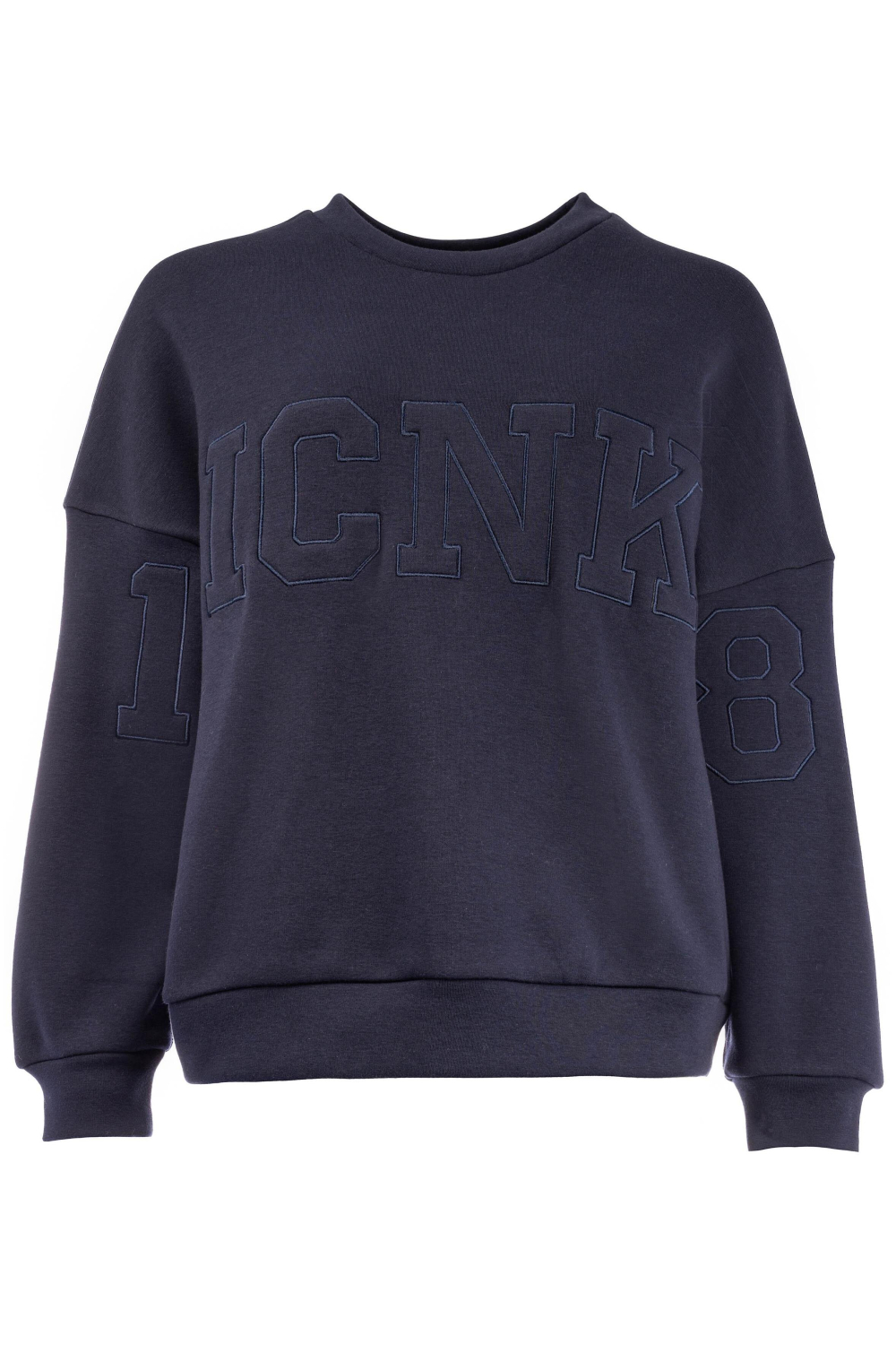 Deze navy I-coni-K sweater voor dames is een comfortabele en stijlvolle keuze voor jouw wintergarderobe. De oversized pasvorm en de zachte sweatstof bieden een relaxed gevoel, ideaal voor casual dagen. Gemaakt van een mix van 60% polyester, 36% katoen en 4% elastaan, voelt de sweater aangenaam aan op de huid. De fleecevoering zorgt voor extra warmte, waardoor deze trui perfect is voor koelere dagen. Een opvallend kenmerk is de grote tekstprint op de voorkant, waarmee je een stoere en moderne look creëert.