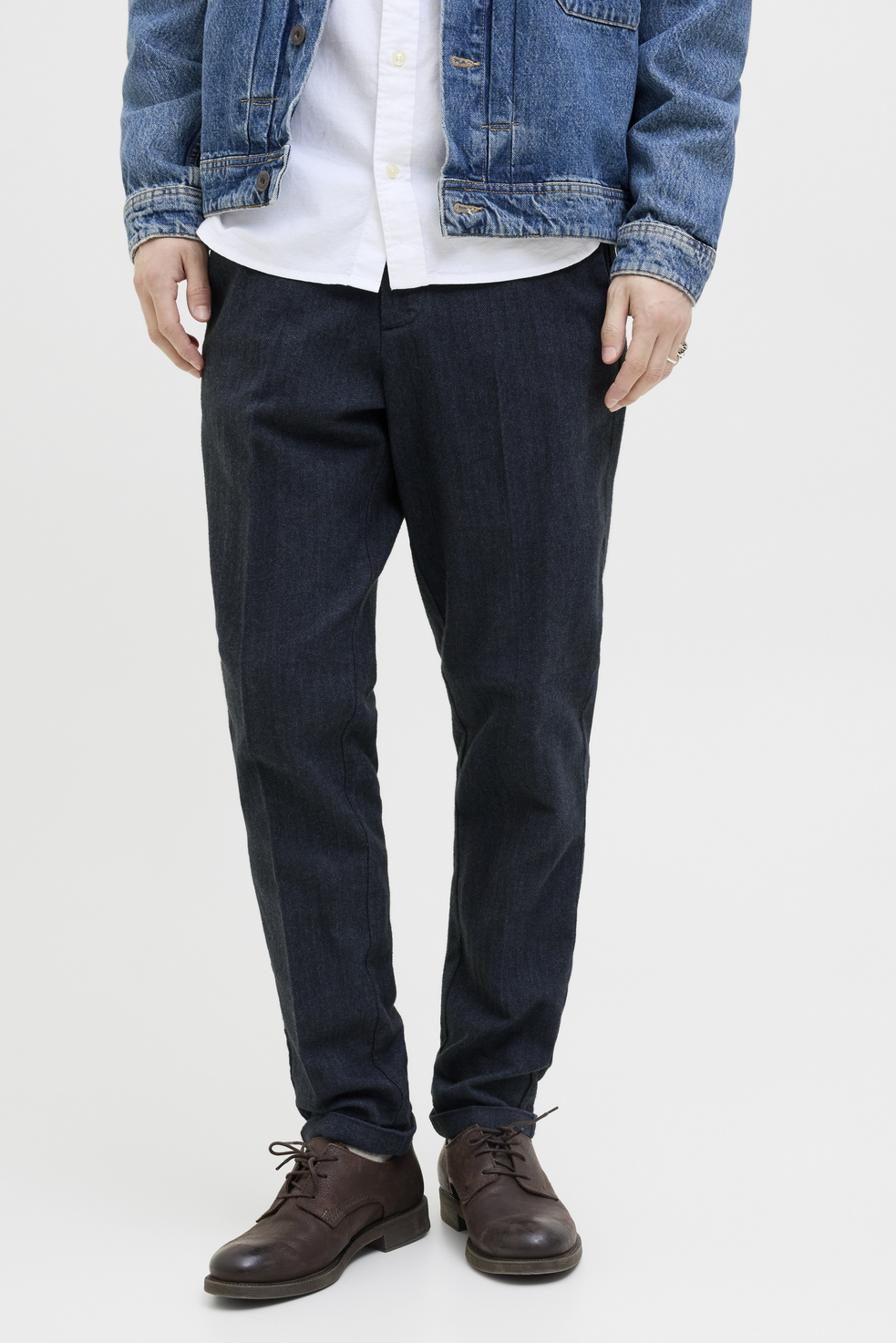 Deze stijlvolle broeken van Jack & Jones zijn een must-have voor je herfstgarderobe. Met een slim fit pasvorm en regular waist, sluit het ontwerp mooi aan op je lichaam, zonder in te leveren op comfort. De donkerblauwe kleur geeft het een moderne uitstraling, terwijl de subtiele visgraatprint net dat beetje extra elegantie biedt. De combinatie van een knoop- en ritssluiting zorgt voor een stevige afsluiting en maakt het aankleden eenvoudig en snel. Of je nu een casual dag op kantoor hebt of een avondje uit plant, deze broek past perfect bij diverse stijlen. Combineer hem met een nette blouse voor een meer formele uitstraling, of kies voor een casual look met een basic T-shirt. Dankzij de normale lengte is hij eenvoudig te matchen met verschillende soorten schoenen. Deze broek biedt niet alleen stijl, maar ook de duurzaamheid die je van Jack & Jones mag verwachten. Voeg deze veelzijdige broek toe aan je collectie voor een tijdloos en comfortabel kledingstuk.