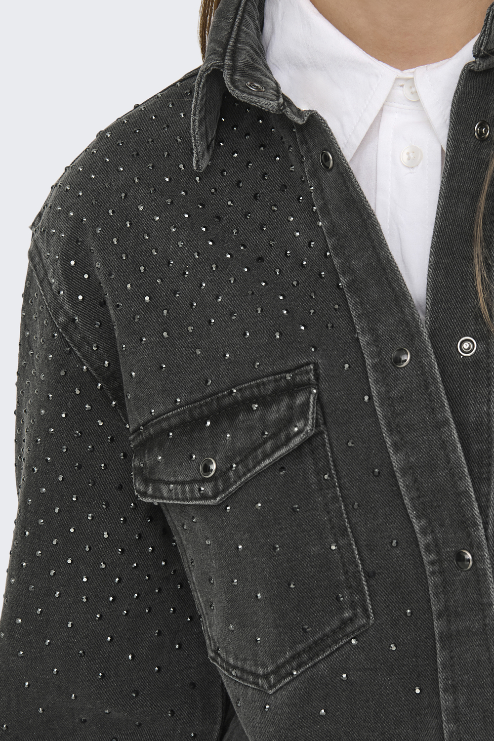 Deze zwarte denim blouse van Jacqueline de Yong is een stijlvolle toevoeging aan je wintergarderobe. Gemaakt van een duurzame mix van katoen, polyester en elastan, biedt het een comfortabele pasvorm die elke dag moeiteloos draagbaar is. De blouse heeft een regular fit en is verfraaid met strass-details die een subtiele glans toevoegen aan de zwarte denim stof. Met praktische borstzakken en een puntkraag behoudt deze blouse zijn klassieke uitstraling, terwijl de drukknoopsluiting een moderne twist geeft. De rinsewash afwerking benadrukt de diepte van de kleur, perfect om te combineren met zowel casual als chique outfits. Of je nu een dag op kantoor doorbrengt of een avondje uitgaat, deze blouse biedt veelzijdigheid en stijl. Draag het met een nette pantalon voor een elegante look, of combineer het met een spijkerbroek voor een meer ontspannen sfeer. Met lange mouwen en een normale lengte, blijft deze blouse een favoriet, ongeacht de gelegenheid. Voeg wat glitter toe aan je dagelijks leven met deze unieke strass-accenten.