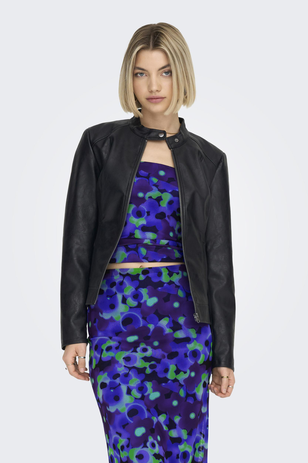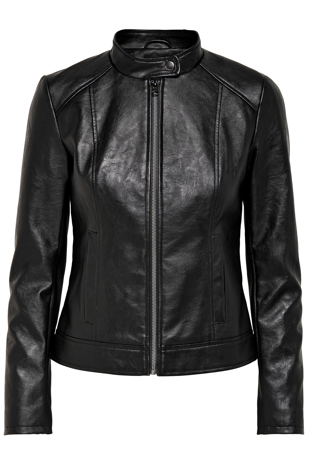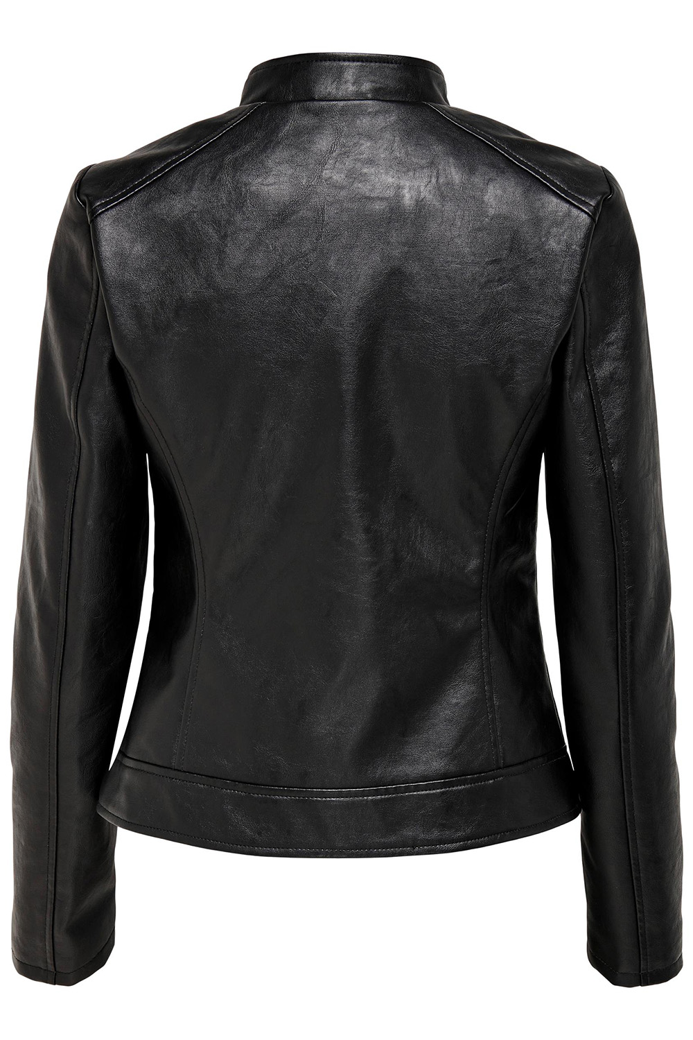 Mooi imitatieleren jasje van JDY met lange mouwen en ritssluiting. Dit model heeft een drukknoop bij de hals en twee schuine steekzakken aan de voorkant. Het geheel is voorzien van een polyester voering. Meer informatie: De totale lengte is 54 cm bij maat 36.