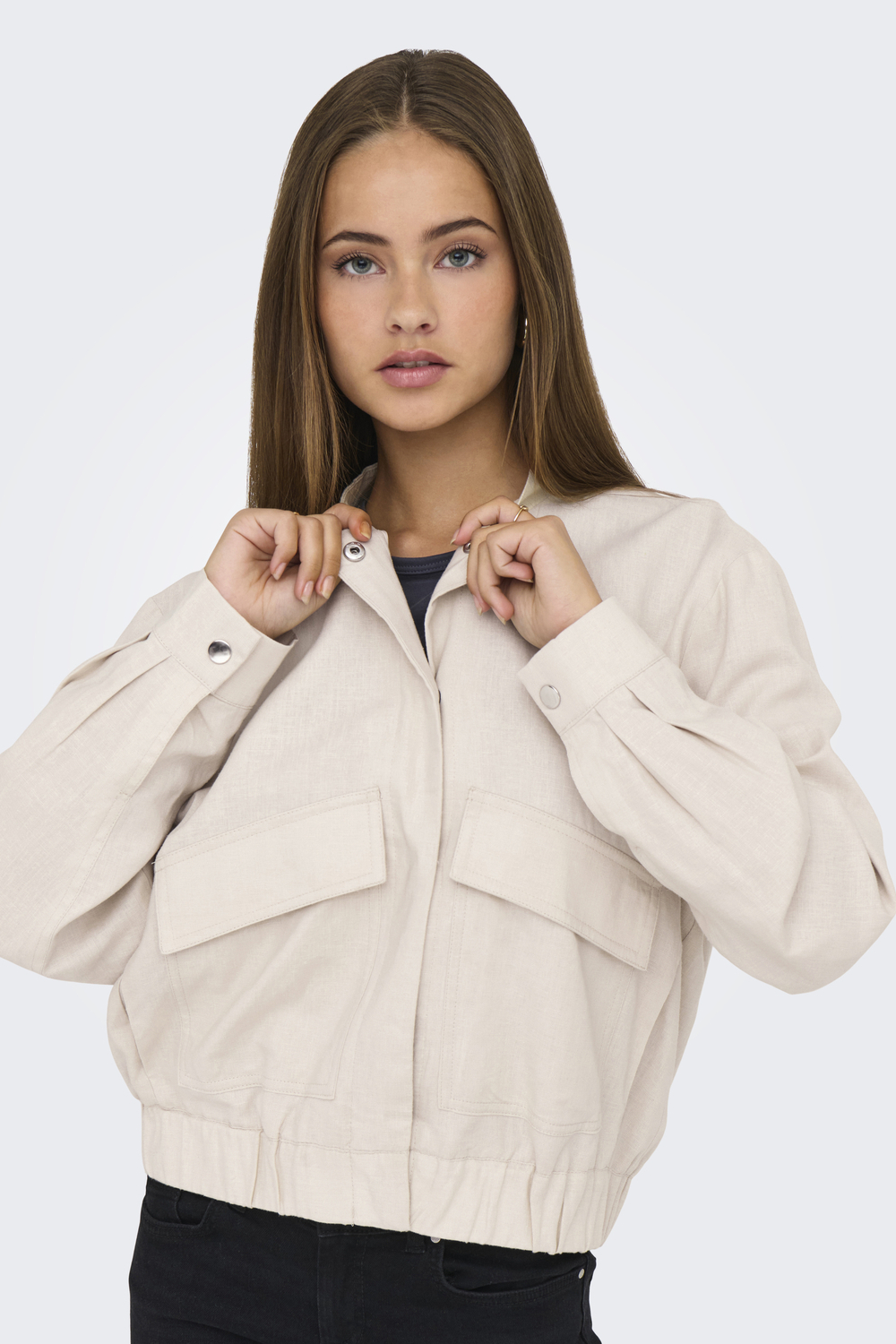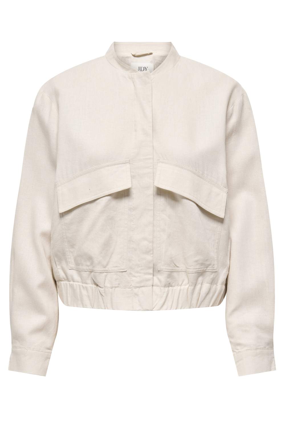 Deels linnen jasje van JDY met lange mouwen en een ronde hals. Dit model sluit met drukknopen en heeft twee grote klepzakken aan de voorkant. De totale lengte is 52 cm bij maat S.