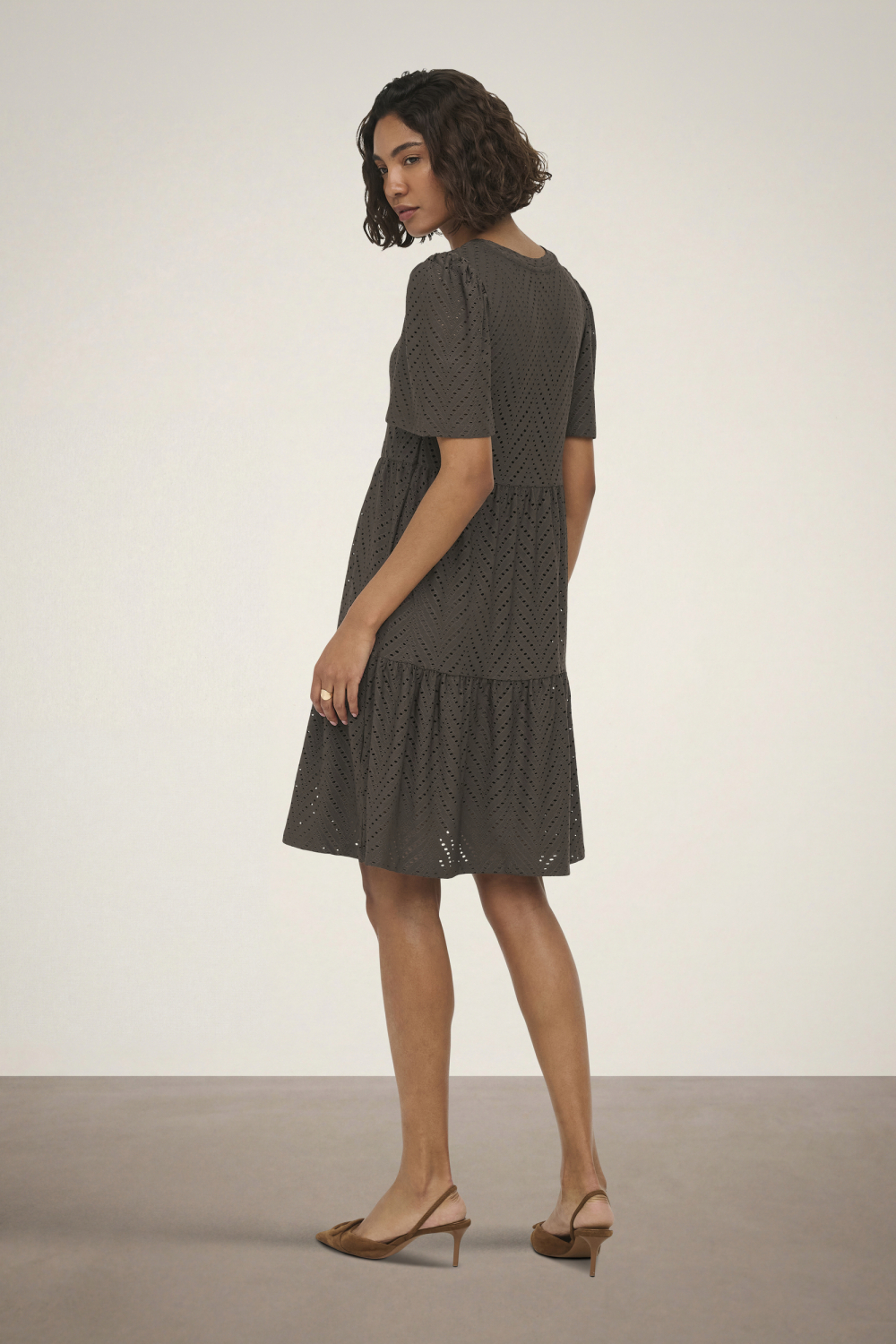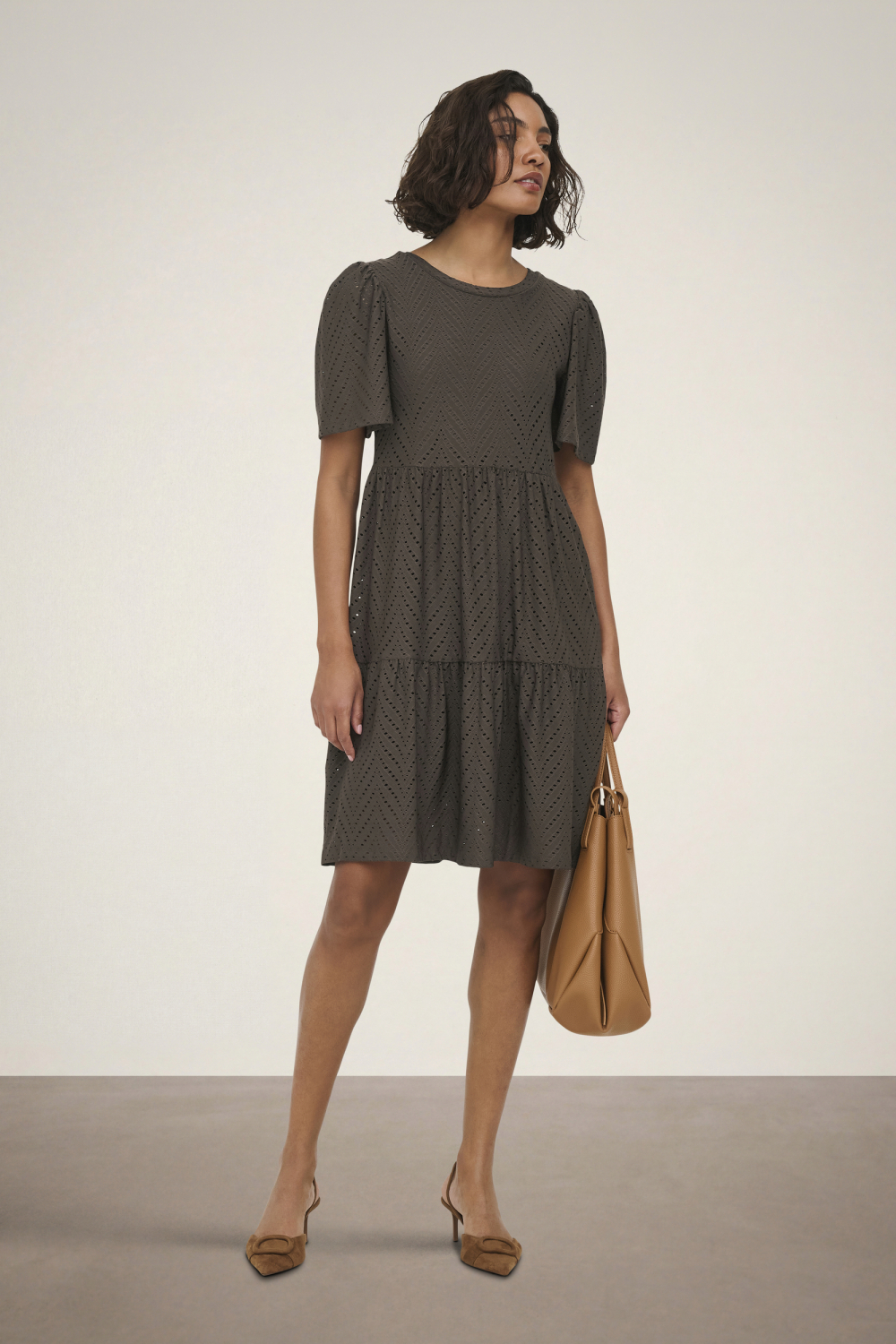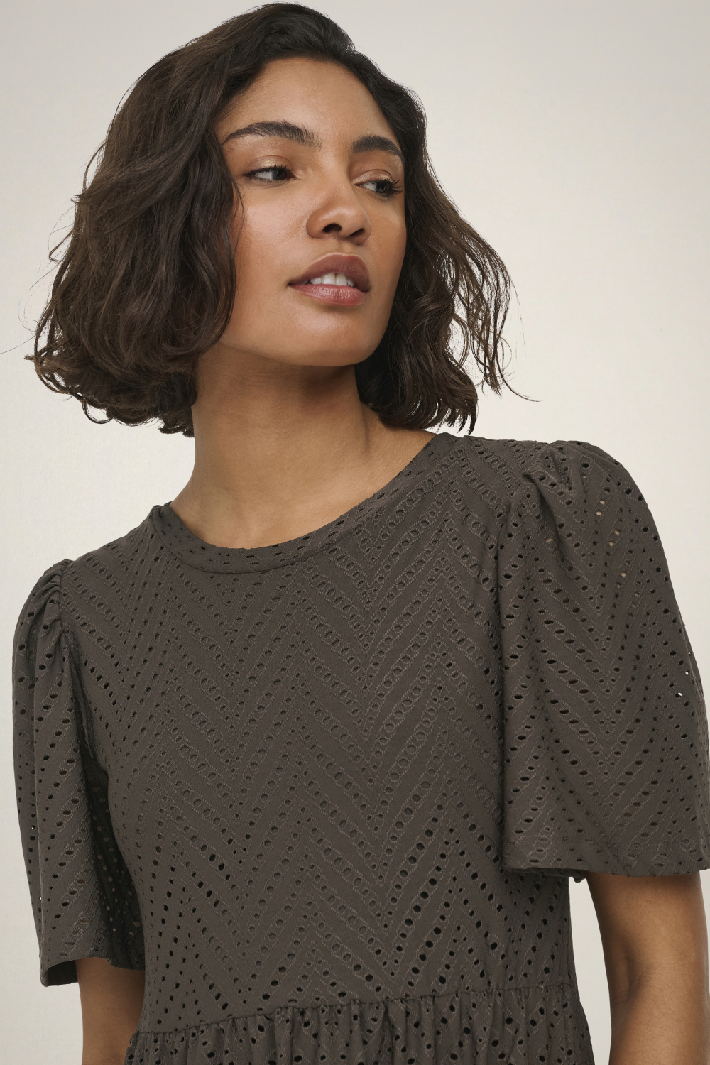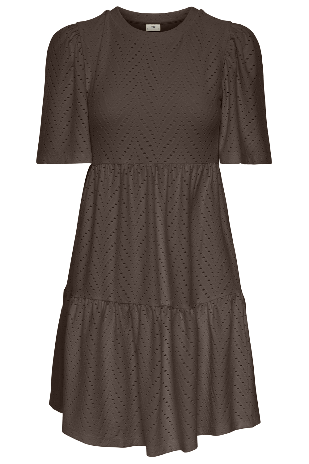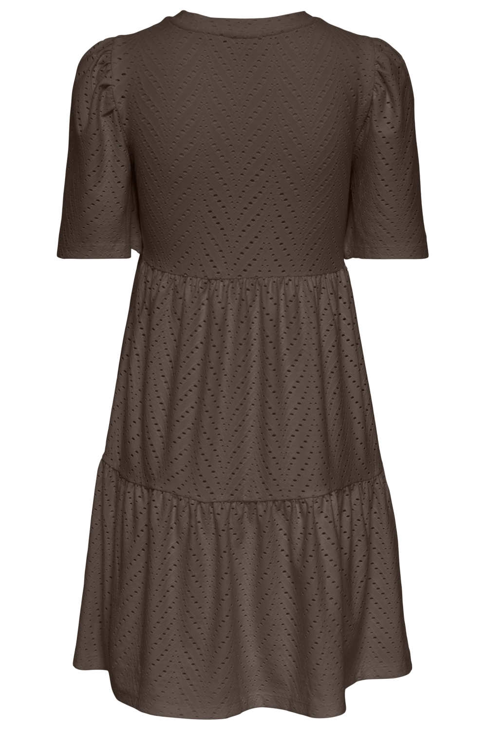 Deze flared jurk van Jacqueline de Yong is een elegante keuze voor de warme zomerdagen. In de chique kleur Chocolate Brown biedt de jurk een verfijnde uitstraling die zowel stijlvol als comfortabel is. Gemaakt van een soepele mix van 95% polyester en 5% elastan, sluit de jurk perfect aan terwijl de flared pasvorm je figuur flatteert. De ajourtextuur voegt een subtiel patroon toe dat het ontwerp net iets extra’s geeft. Met zijn ronde hals en korte mouwen is deze jurk ideaal voor een casual dagje uit of een ontspannen middag in het park. De lichte stof en normale lengte maken het een fijne keuze voor diverse gelegenheden, of je nu een wandeling maakt langs het strand of een lunch hebt met vrienden. Combineer deze jurk eenvoudig met sandalen of sneakers voor een complete look. Dankzij de veelzijdige stijl en kleur past deze Jacqueline de Yong jurk perfect in elke damesgarderobe. Meer informatie: De totale lengte is 90 cm bij maat S.