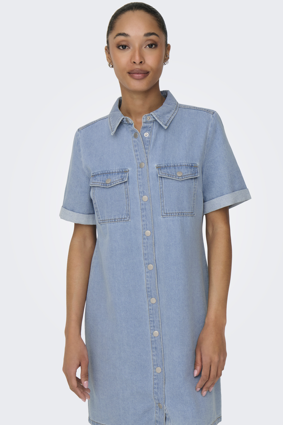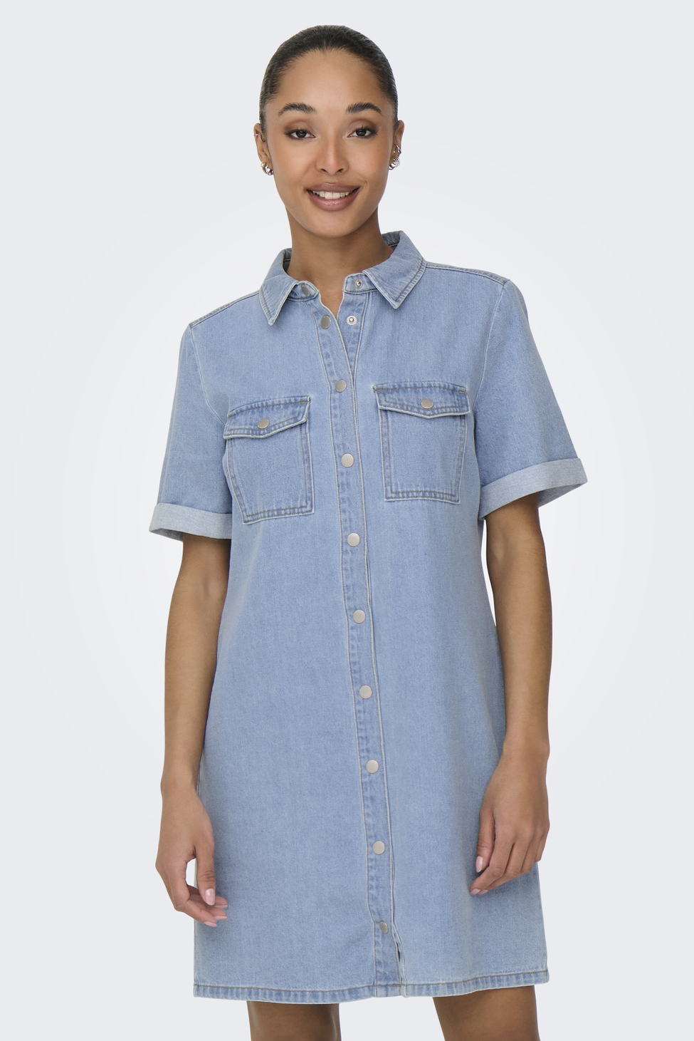 Deze lichte blauwe denim jurk van Jacqueline de Yong is een verfijnde en veelzijdige keuze voor elke zomerdag. Gemaakt van 100% katoen, zorgt dit kledingstuk voor optimaal comfort dankzij de zachte stof. De jurk heeft een regular fit en valt kort, waardoor hij perfect is voor informele gelegenheden of een dagje uit in de stad. Met de drukknoopsluiting en klassieke puntkraag krijgt de jurk een moderne, maar toch tijdloze uitstraling. De borstzakken geven niet alleen functionele extra's maar dragen ook bij aan de casual look. Deze Jacqueline de Yong denim jurk is eenvoudig te combineren met jouw favoriete accessoires en schoeisel, of je nu kiest voor nette sandalen of stoere sneakers voor een meer ontspannen stijl. De korte mouwen maken het een uitstekende optie voor warme dagen, terwijl de lichte bleached wash een frisse en luchtige look biedt. Of je nu een casual dag of een zomers feestje op de planning hebt, deze jurk is een stijlvolle en comfortabele keuze die makkelijk te matchen is met meerdere stijlen in je garderobe. Meer informatie: Totale lengte is 82 cm bij maat S.