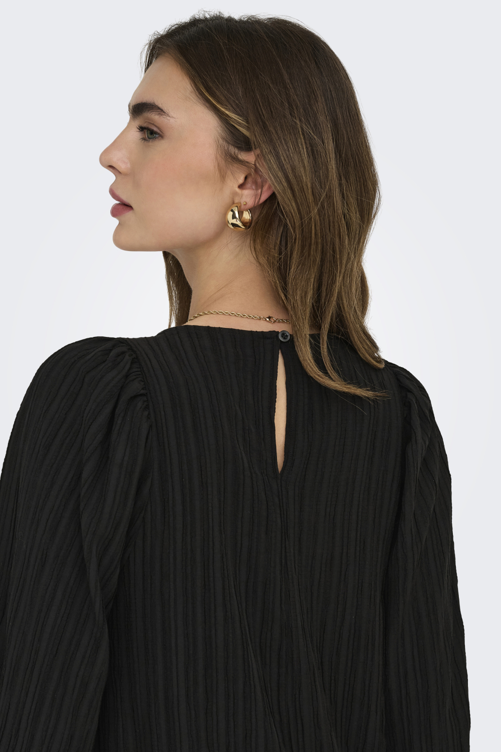 Deze zwarte plissé jurk van Jacqueline de Yong is een stijlvolle keuze voor je feestjes en bijeenkomsten. Het ontwerp kenmerkt zich door een regular pasvorm, waardoor je vrij kunt bewegen zonder in te boeten op stijl. Deze jurk heeft een verfijnde ronde hals en een subtiele knoopsluiting aan de achterkant, wat de elegante look compleet maakt. Gemaakt van een mix van viscose, gerecycled polyester en een beetje elastan, voelt de jurk comfortabel aan en sluit hij mooi aan bij je contouren. De lange mouwen met een lichte pof geven deze winterse partyjurk een unieke uitstraling. Met de kortere lengte en het opvallende plissépatroon heb je een eigentijdse look die je makkelijk kunt combineren met een paar hakken. Of je nu een chique avondje uit plant of een informele bijeenkomst bijwoont, deze jurk is een veelzijdige keuze voor elke gelegenheid. Voeg dit tijdloze stuk toe aan je garderobe en je bent altijd klaar voor een feestje. Meer informatie: De totale lengte is 88 cm bij maat S.
