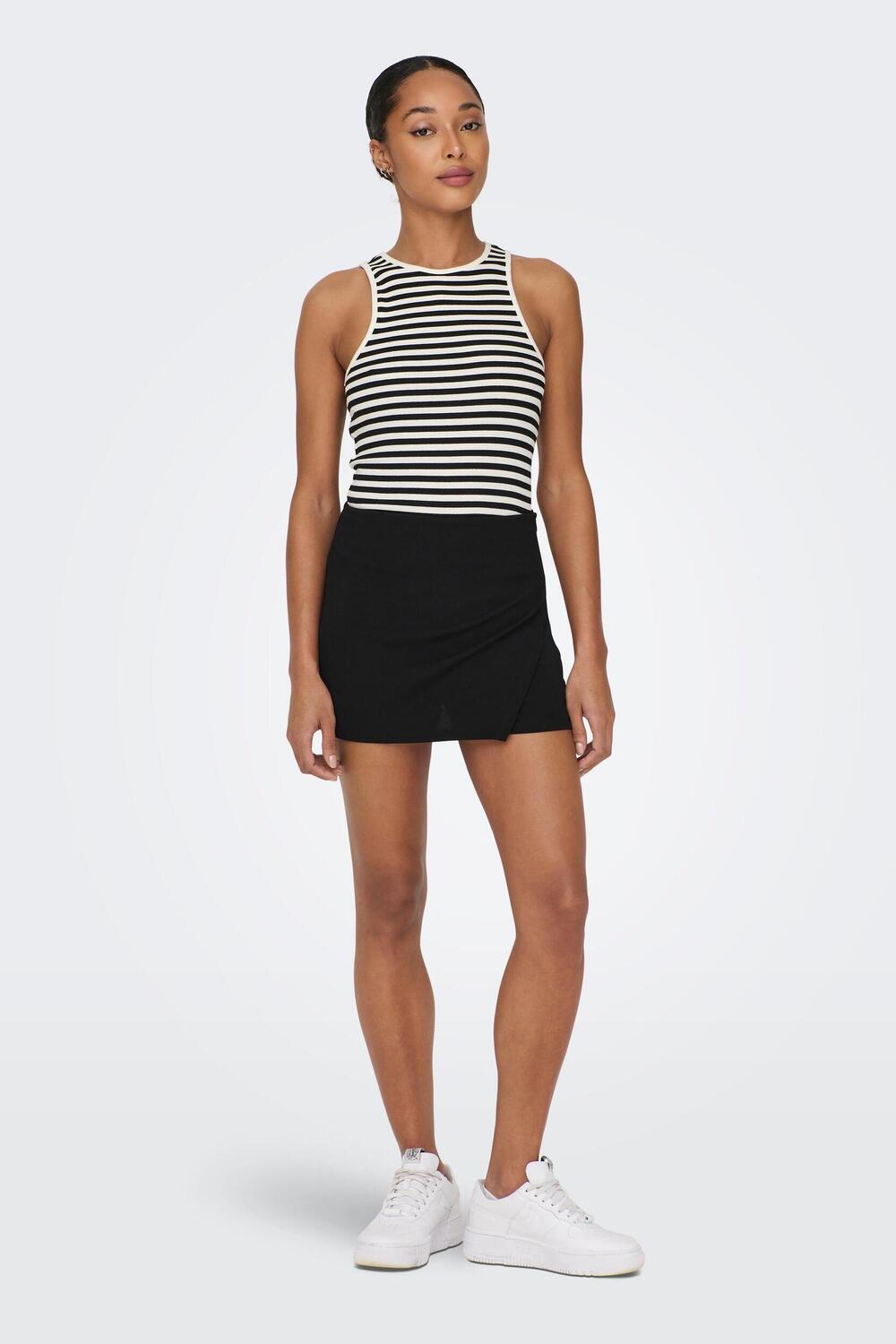 Deze zwarte korte broek van Jacqueline de Yong is een must voor je zomergarderobe. Gemaakt van een comfortabele mix van 95% polyester en 5% elastaan, biedt de stof elasticiteit en een soepele pasvorm. De regular fit en normale taillehoogte zorgen ervoor dat deze broek heerlijk zit en geschikt is voor dagelijks gebruik. Met een blinde ritssluiting en een elegante wrap-look aan de voorkant, straalt deze short eenvoud en stijl uit. Ideaal te combineren met een luchtige top of blouse, maakt deze korte broek het gemakkelijk om een casual, maar stijlvolle outfit te creëren voor een dagje uit of een relaxte middag in het park. Dankzij het tijdloze ontwerp en het ontbreken van zakken, biedt deze broek een gestroomlijnde look die je soepel van dag naar avond kan brengen. De veelzijdigheid van deze basis zwarte kleur verzekert dat je hem keer op keer kunt dragen met verschillende accessoires en schoenen.