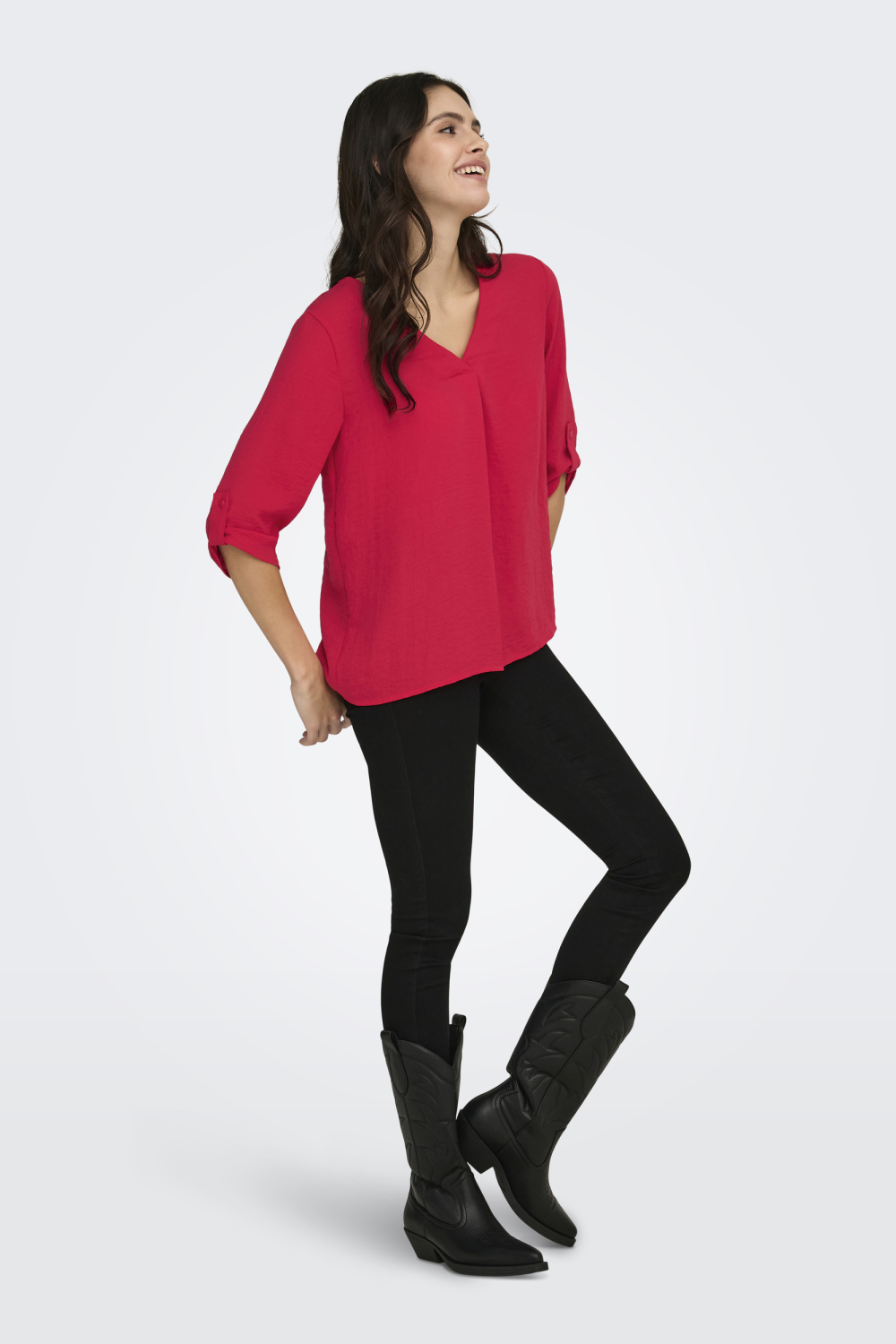 Dit casual T-shirt van Jacqueline de Yong in de opvallende kleur Ski Patrol is een stijlvolle aanvulling op je wintergarderobe. Gemaakt van 51% gerecycled polyester en 49% polyester, biedt het een duurzame keuze zonder concessies te doen aan stijl. De V-hals en 3/4 mouwen geven het T-shirt een moderne uitstraling, ideaal voor een informele of dagelijkse setting. De regular fit zorgt voor een comfortabele pasvorm die je figuur flatteert. Met zijn tijdloze ontwerp is dit T-shirt een veelzijdige optie voor diverse gelegenheden. Draag het met je favoriete jeans voor een ontspannen dagje uit, of combineer het met een nette rok voor een casual-chique look. De normale lengte maakt het makkelijk te combineren met verschillende kledingstukken en stijlen. Of je nu een avond met vrienden hebt gepland of gewoon een dag thuis doorbrengt, dit T-shirt biedt de perfecte balans tussen comfort en stijl.