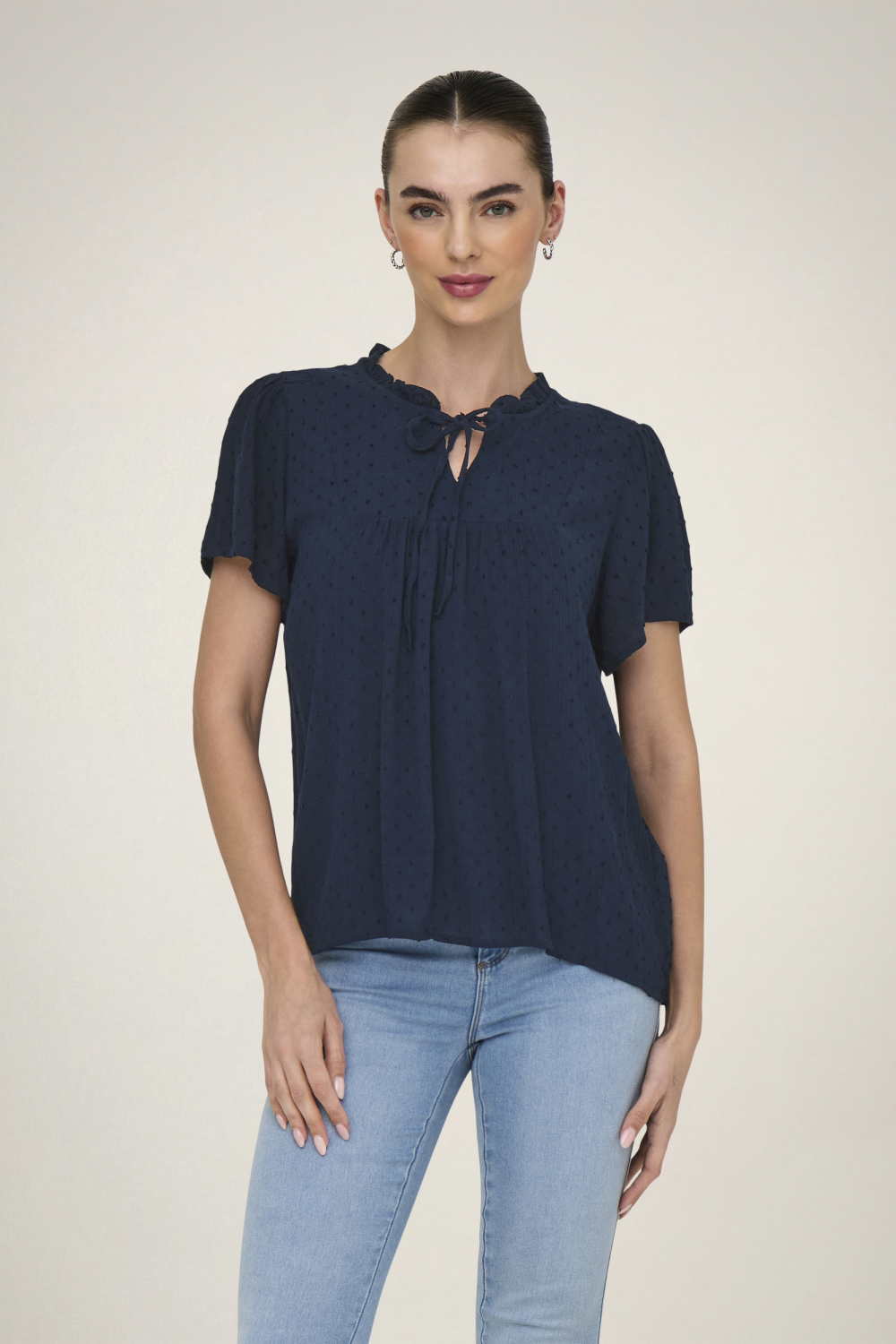 Dit casual T-shirt van Jacqueline de Yong, uitgevoerd in de kleur Black Iris, is een elegante toevoeging aan je voorjaarsgarderobe. Gemaakt van duurzaam 100% Viscose Livaeco by Birla Cellulose, biedt het een ademende en milieubewuste optie voor alledaags dragen. De structuur van de stof geeft het T-shirt een subtiele, doch verfijnde uitstraling. Met een V-hals die wordt geaccentueerd door een strikkoorddetail, krijg je een speelse twist die zowel stijlvol als veelzijdig is. De regular fit pasvorm en korte mouwen maken dit T-shirt een ideaal kledingstuk voor informele gelegenheden, lunches met vrienden, of een dagje uit in de stad. Combineer het met een lichte jeans of een rok voor een moeiteloze, maar toch modieuze look. De normale lengte en comfortabele pasvorm zorgen ervoor dat je je vrij kunt bewegen, terwijl de kwaliteitsmaterialen langdurig draagplezier garanderen zonder afbreuk te doen aan de stijl. Voeg deze tijdloze essential toe aan je collectie voor een look die altijd van pas komt.