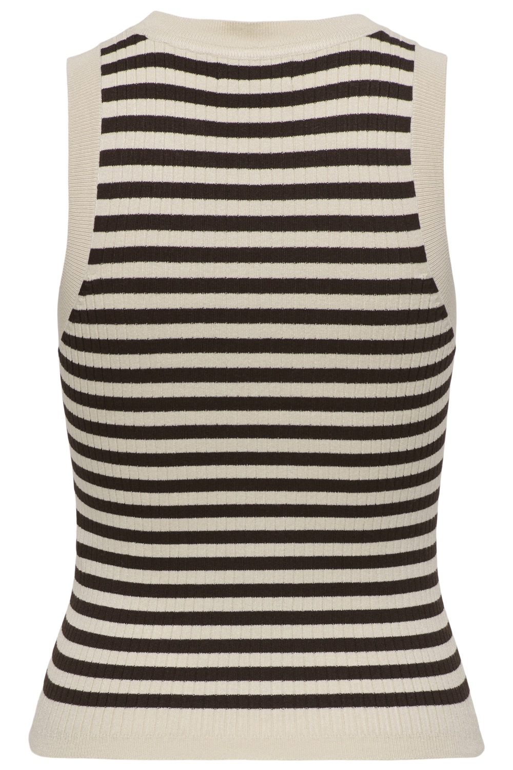 De Jacqueline de Yong top is een stijlvolle aanvulling op je zomergarderobe. Deze mouwloze knitwear top heeft een regular fit pasvorm en is gemaakt van een comfortabele mix van 80% viscose en 20% nylon. Het opvallende streeppatroon in contrasterende kleuren zorgt voor een moderne en frisse uitstraling. De ronde halslijn voegt een klassieke touch toe aan het geheel, waardoor de top veelzijdig te combineren is. Deze top biedt een aangename draagsensatie en is ideaal voor warme zomerdagen. Dankzij het luchtige ontwerp is deze Jacqueline de Yong top perfect voor casual gelegenheden, zoals een dagje uit in de stad of een ontspannen middag in de zon. Draag hem met een lichte jeans of een kleurrijke rok voor een speelse look. De normale lengte maakt het gemakkelijk om de top in verschillende stijlen te dragen, afhankelijk van de gelegenheid. Met zijn tijdloze design en de kwalitatieve materiaalmix, blijft deze top seizoen na seizoen een favoriet in je kledingkast.