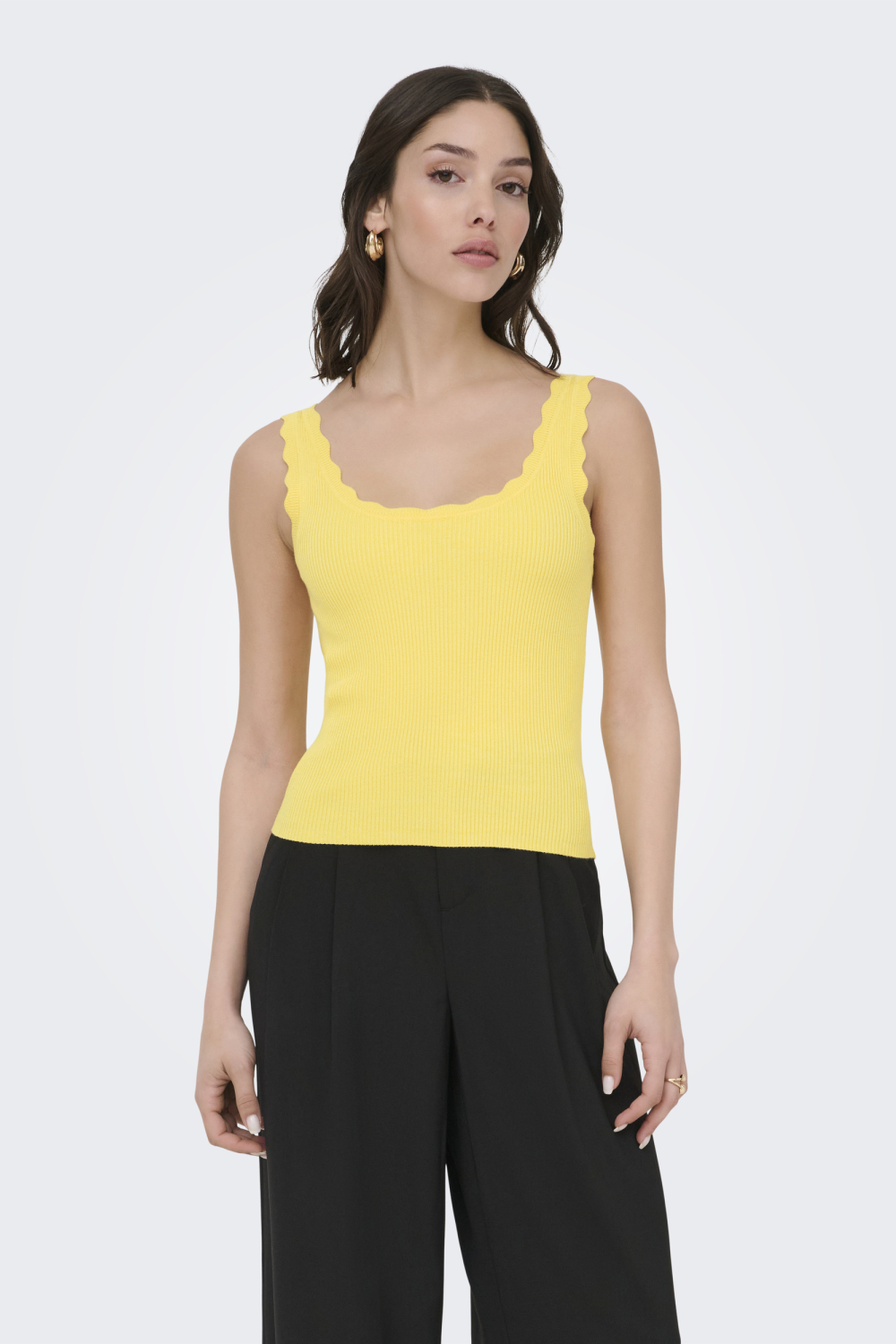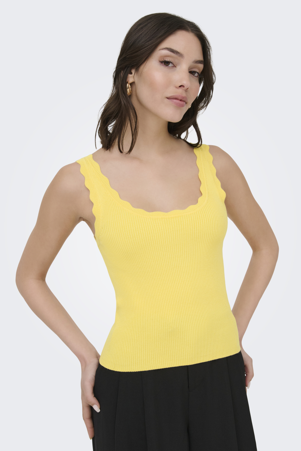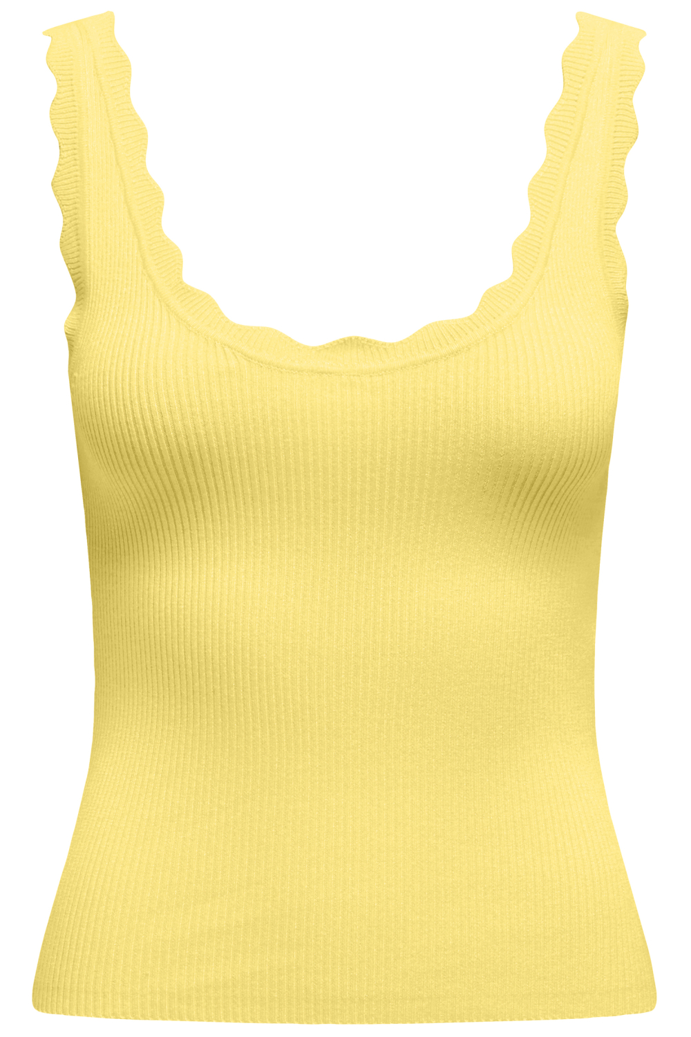 De Jacqueline de Yong top is een veelzijdige aanvulling voor je garderobe. Met z'n zachte pale banana-kleur en ribpatroon valt deze top op in elke setting. De ronde hals en de golvende schouderbanden geven de top een elegante uitstraling, terwijl de regular fit zorgt voor een comfortabele pasvorm. Gemaakt van 80% viscose en 20% nylon, voelt deze knitwear licht aan op je huid, ideaal voor dagelijks gebruik. Deze mouwloze top leent zich perfect voor zowel casual als formele gelegenheden. Draag hem met een losse broek voor een ontspannen look, of combineer met een nette rok voor een avond uit. Dankzij de normale lengte kun je hem eenvoudig overal in stoppen of los dragen. Of je nu naar een lunchafspraak gaat of een dag op kantoor doorbrengt, met deze Jacqueline de Yong top maak je steeds weer een stijlvolle indruk.