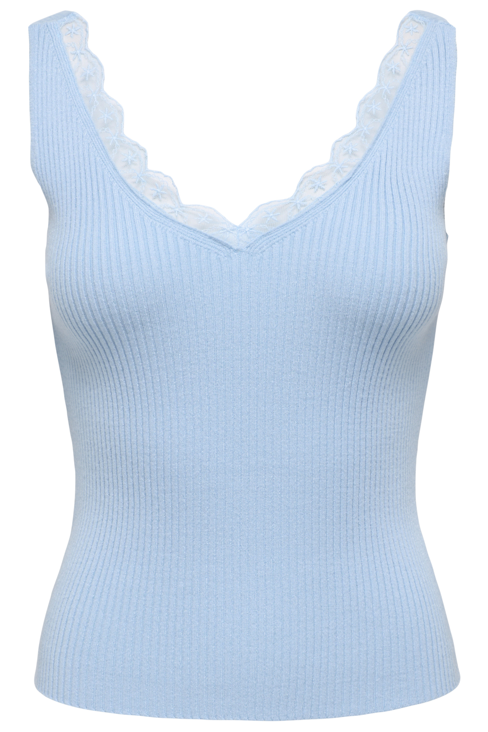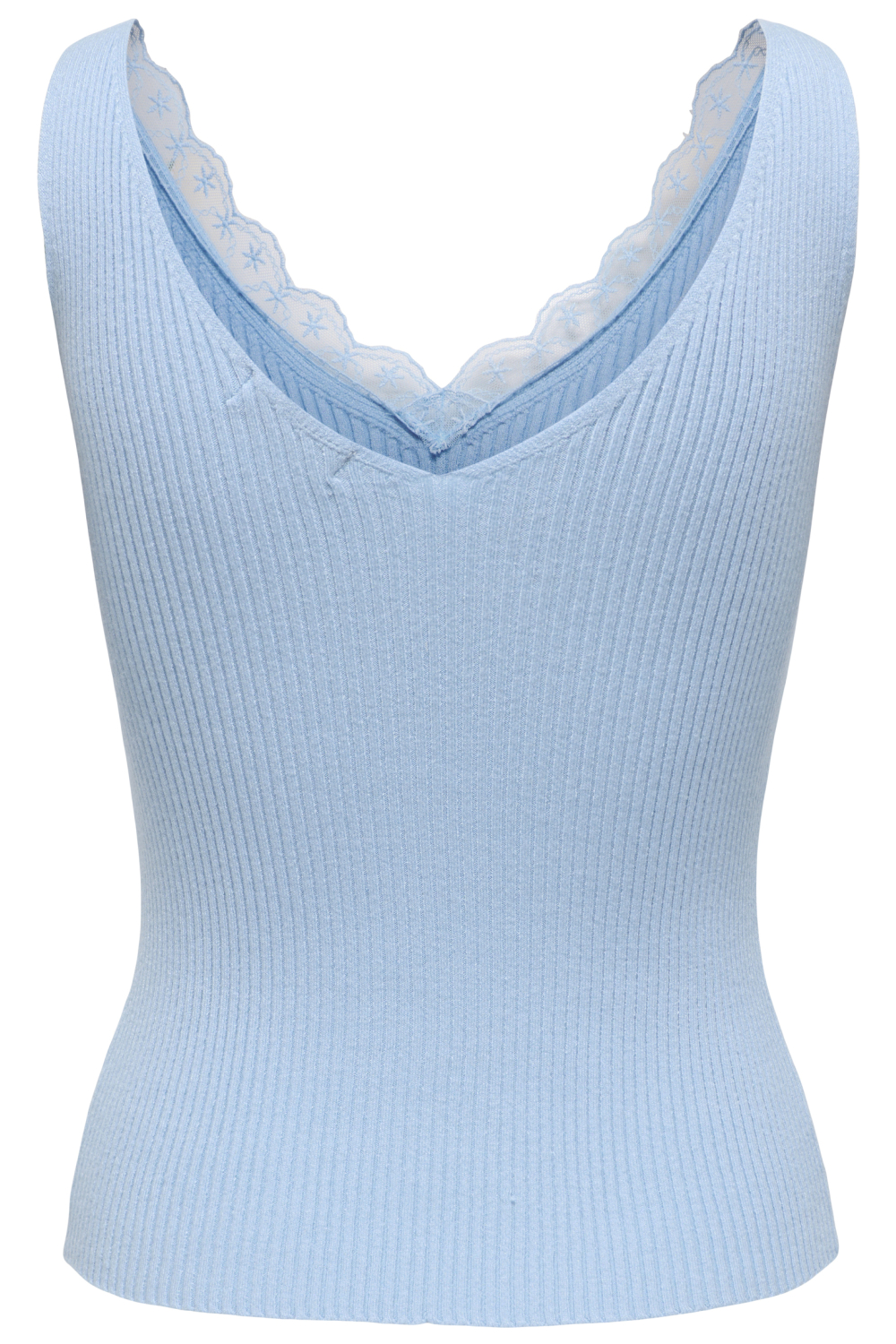 Deze cashmere blauwe top van Jacqueline de Yong is een elegante toevoeging aan je lentegarderobe. Met een regular fit en een verfijnde V-hals, biedt deze mouwloze top zowel comfort als stijl. De top is vervaardigd uit een zachte mix van 80% viscose en 20% nylon, en heeft een delicaat kanten patroon dat een romantische touch geeft. De ribstructuur en het subtiele kantdetail aan de halslijn zorgen voor een charmante uitstraling die je gemakkelijk kunt combineren met andere kledingstukken. Deze casual top is perfect voor uiteenlopende situaties. Combineer hem met een lichte jeans voor een ontspannen dagje uit, of draag hem onder een blazer voor een meer verfijnde look. De normale lengte zorgt ervoor dat hij gemakkelijk in of over een broek gedragen kan worden, waardoor je flexibel bent in je kledingkeuze. Met deze Jacqueline de Yong top ben je klaar voor elke gelegenheid, van een casual brunch tot een zomerse avondwandeling.