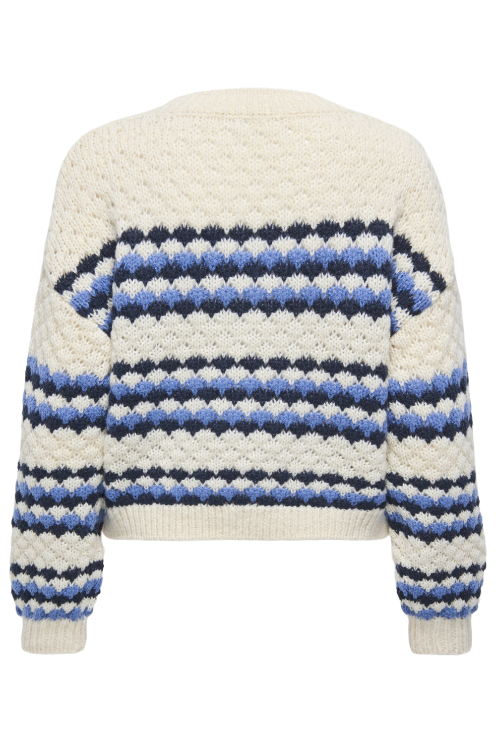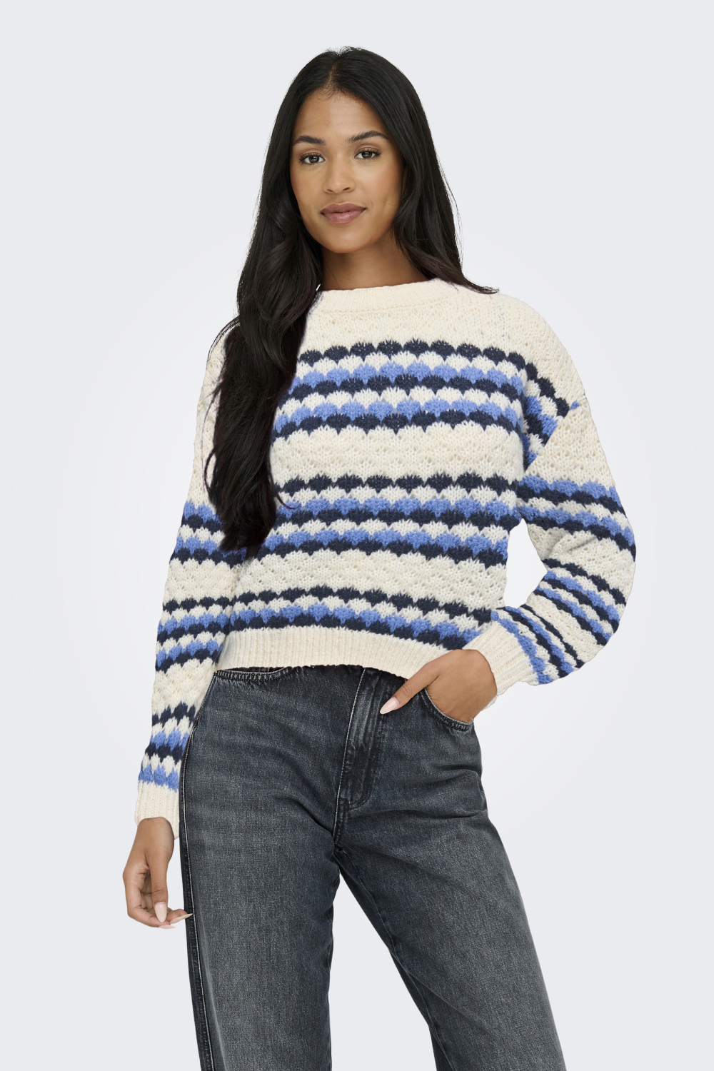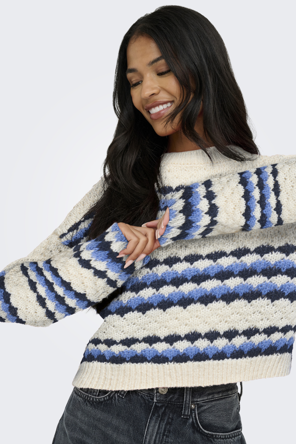 Deze kleurrijke trui van Jacqueline de Yong voegt een speels element toe aan je herfstgarderobe. Met een opvallend strepenpatroon in blauwtinten en crème, gemaakt van een duurzame mix van 50% polyester en 50% gerecycled polyester, biedt deze trui niet alleen stijl, maar ook comfort. De regular fit en de ronde hals zorgen voor een ontspannen pasvorm die gemakkelijk te combineren is met de rest van je kledij. De trui is perfect voor casual dagen of een relaxte avond met vrienden. De lange mouwen en normale lengte maken het een veelzijdig stuk dat je warm houdt op koelere dagen. Draag het met een jeans voor een ontspannen look of combineer het met een rok voor een verfijndere outfit. Deze Jacqueline de Yong trui is een ideale keuze voor iedereen die zowel stijlvol als milieubewust wil zijn.