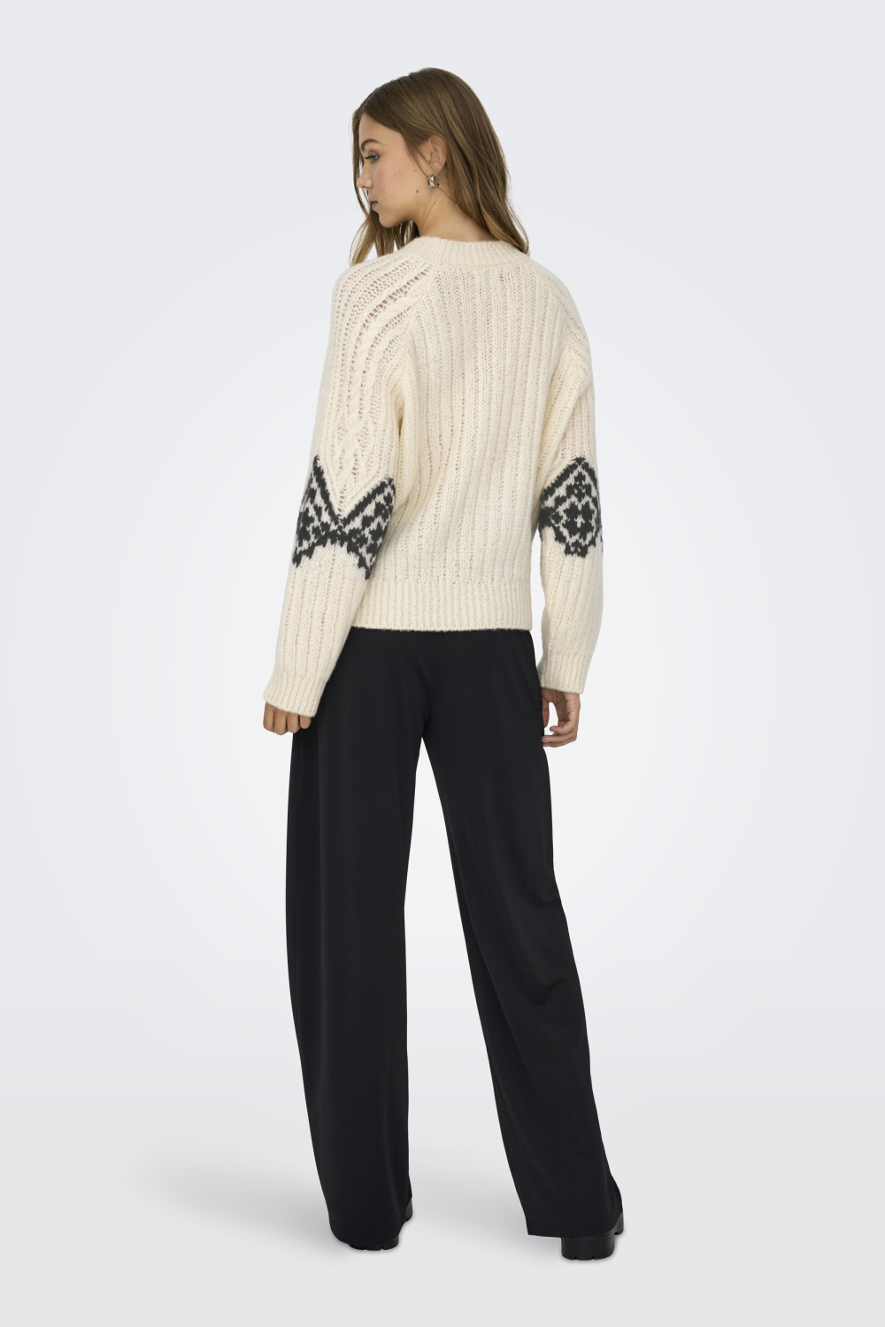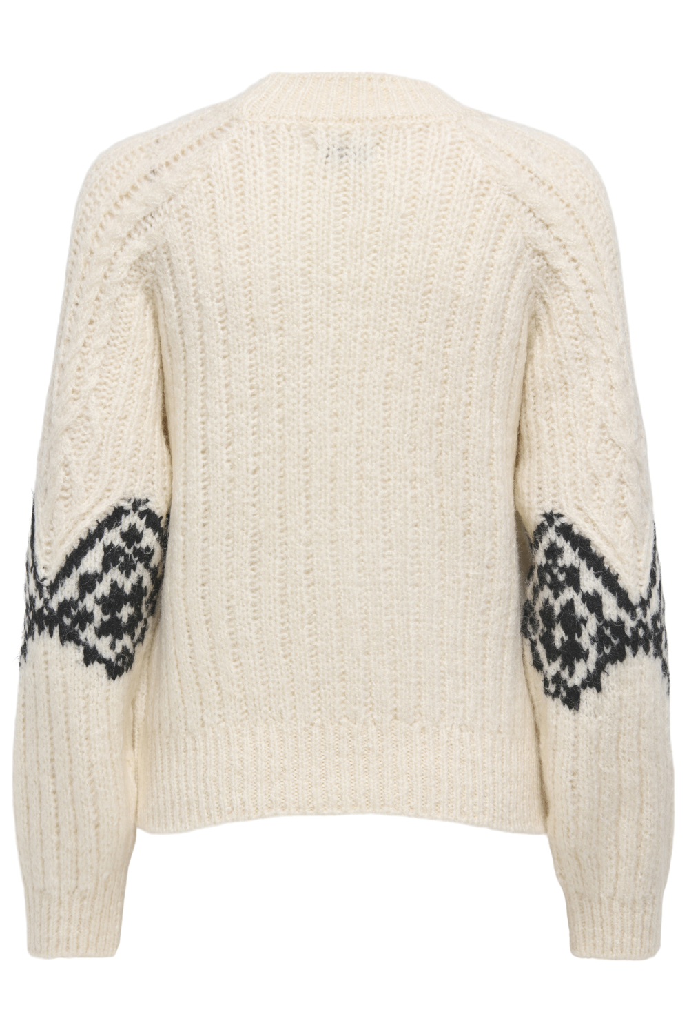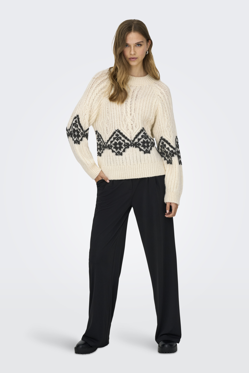 Deze stijlvolle trui van Jacqueline de Yong is een prachtige aanvulling voor je wintergarderobe. Met zijn rijke kabelpatroon in crèmekleur, krijgt de trui een klassieke uitstraling die goed combineerbaar is met diverse stijlen. De contrasterende zwarte patronen rond de borst en mouwen voegen een uniek detail toe, waardoor de trui net dat beetje extra heeft. Gemaakt van 80% acryl en 20% polyester, biedt de trui een comfortabele regular fit, perfect voor dagelijks gebruik. De lange mouwen en de ronde hals zorgen voor extra warmte op koude dagen. Deze trui is ideaal voor casual dagen of een ontspannen avond thuis, maar past ook uitstekend bij een nette broek voor een meer formele uitstraling. Met zijn normale lengte kan de trui makkelijk in laagjes worden gedragen, waardoor je veelzijdig kledingstukken kunt combineren. Een must-have voor de koude seizoenen die niet mag ontbreken in je garderobe.