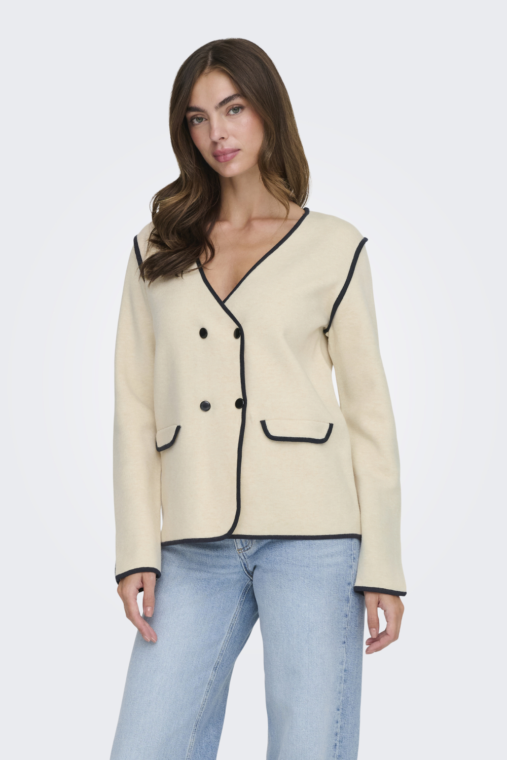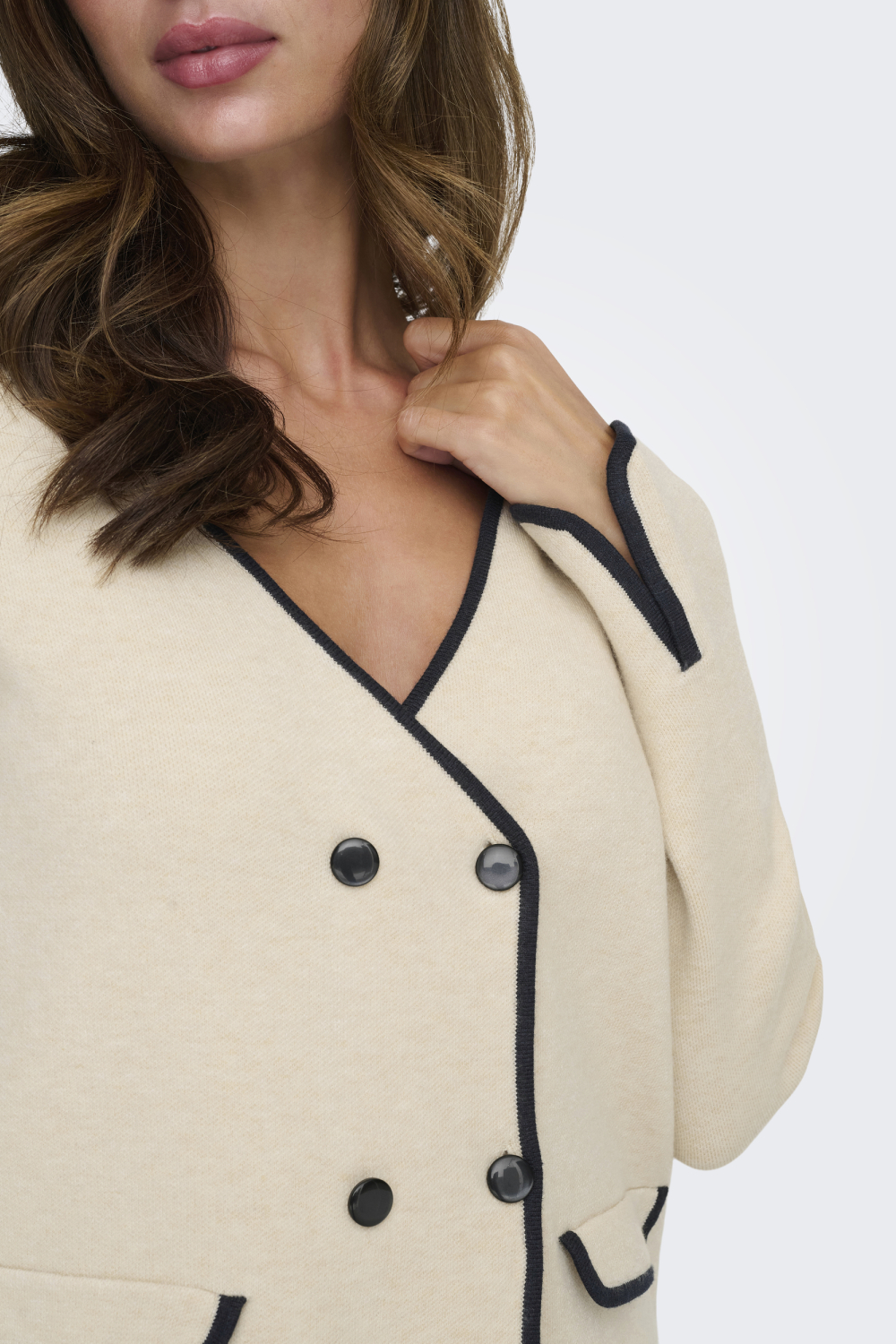 Deze elegante beige vest van Jacqueline de Yong is een onmisbare aanvulling op je herfstgarderobe. De V-hals en de tweerijige knoopsluiting geven het vest een stijlvolle en tijdloze uitstraling. De zwarte bies zorgt voor een subtiel contrast tegen de neutrale kleur, wat net dat beetje extra verfijning geeft. Dit vest is gemaakt van zacht knitwear materiaal dat comfortabel aanvoelt en een regular fit biedt, zodat je altijd stijlvol voor de dag komt. Het Jacqueline de Yong vest is perfect voor meerdere gelegenheden. Combineer het met een spijkerbroek voor een casual look tijdens een dagje uit, of draag het over een blouse voor een meer zakelijke touch tijdens een vergadering. De normaal vallende lengte en lange mouwen maken het ideaal voor de koelere dagen van het jaar. Met dit vest ben je verzekerd van een veelzijdige en duurzame keuze voor elke situatie.