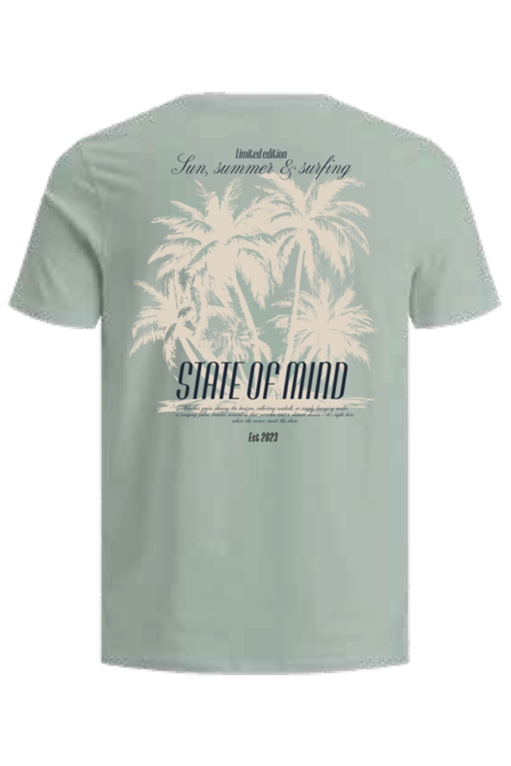 Dit casual aqua grijze T-shirt voor heren van JJ Rebel is een fijne keuze voor de lente. De 100% katoenen stof voelt zacht aan op de huid en biedt ademend comfort tijdens warmere dagen. Met een regular pasvorm en korte mouwen is het ideaal voor een ontspannen dagje uit, of je nu een wandeling maakt langs het strand of een koffie pakt in de stad. De ronde hals geeft een klassieke uitstraling die moeiteloos past bij elke casual outfit. Op de achterkant van het T-shirt prijkt een opvallend ontwerp met palmbomen en de tekst "State of Mind", wat zorgt voor een zomerse vibe en een vleugje originaliteit. Dit maakt het shirt niet alleen een geweldige toevoeging aan je casual garderobe, maar ook perfect voor festivals of een dagje naar het park. Combineer het eenvoudig met shorts of jeans, en creëer een relaxte look die klaar is voor elk avontuur. Voeg dus een fris en stijlvol item toe aan je kledingkast met dit JJ Rebel T-shirt.