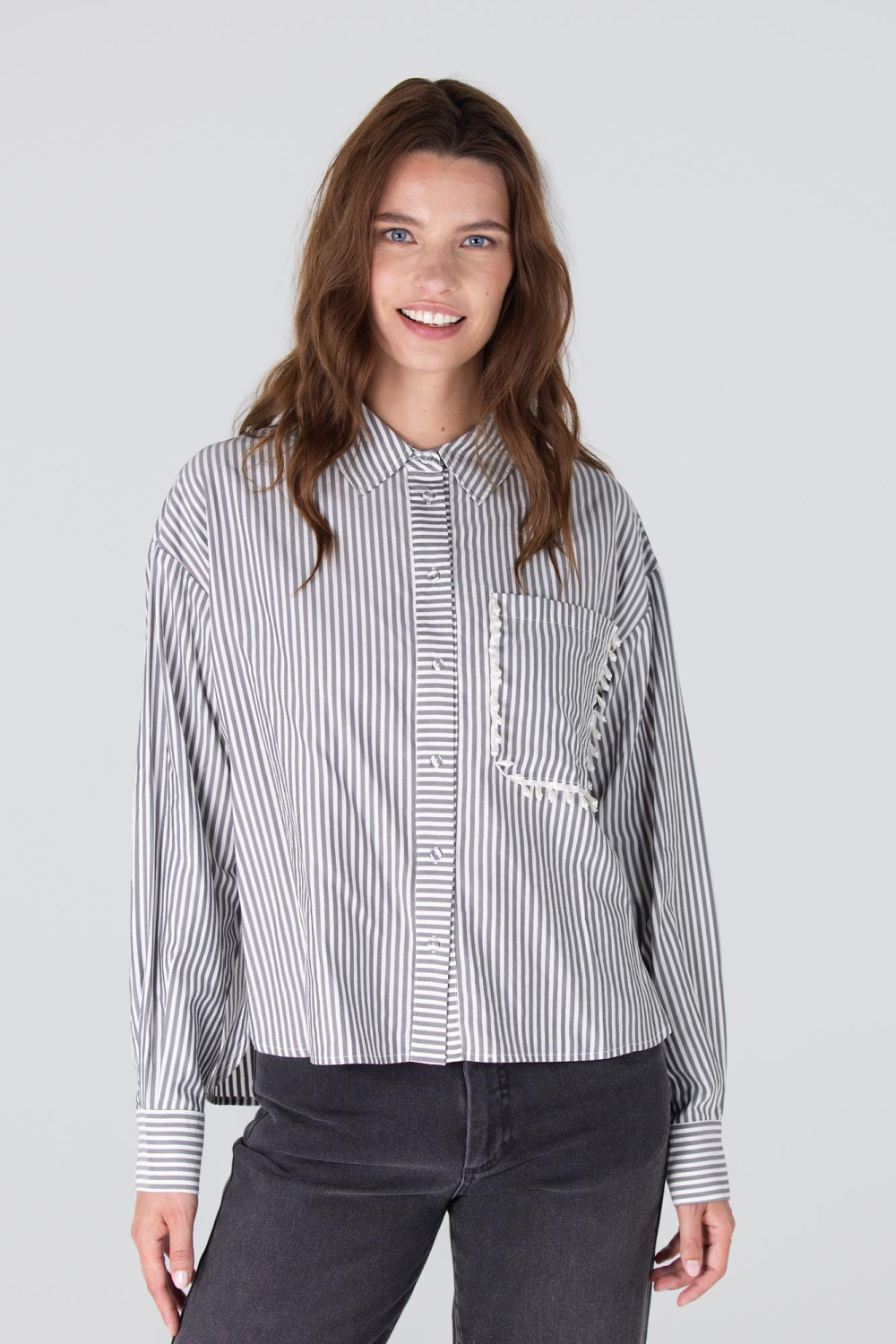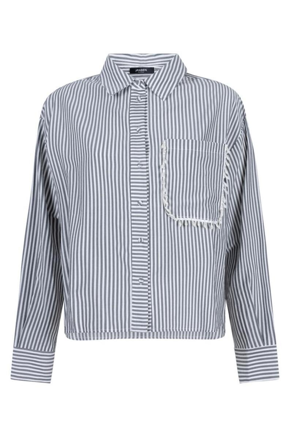 Deze casual blouse van Juffrouw Jansen is een aangename aanvulling voor je herfstgarderobe. Het regular fit ontwerp zorgt voor een comfortabele pasvorm, terwijl de fijne streepjes en de elegante parelversiering bij de borstzakken een verfijnde uitstraling geven. Met de knoopsluiting en de klassieke puntkraag is deze blouse zowel stijlvol als functioneel. De antracietkleurige stof straalt subtiliteit uit, wat het een ideale keuze maakt voor zowel informele als meer geklede gelegenheden. De blouse is ontworpen met lange mouwen en een normale lengte, waardoor hij veelzijdig te combineren is. Draag hem met een donkere jeans voor een trendy, casual look of combineer hem met een nette rok voor een meer geraffineerde uitstraling. Dankzij de stijlvolle details en het comfortabele ontwerp kun je deze blouse moeiteloos dragen op kantoor, tijdens een brunch met vrienden, of gewoon voor een ontspannen dagje uit.