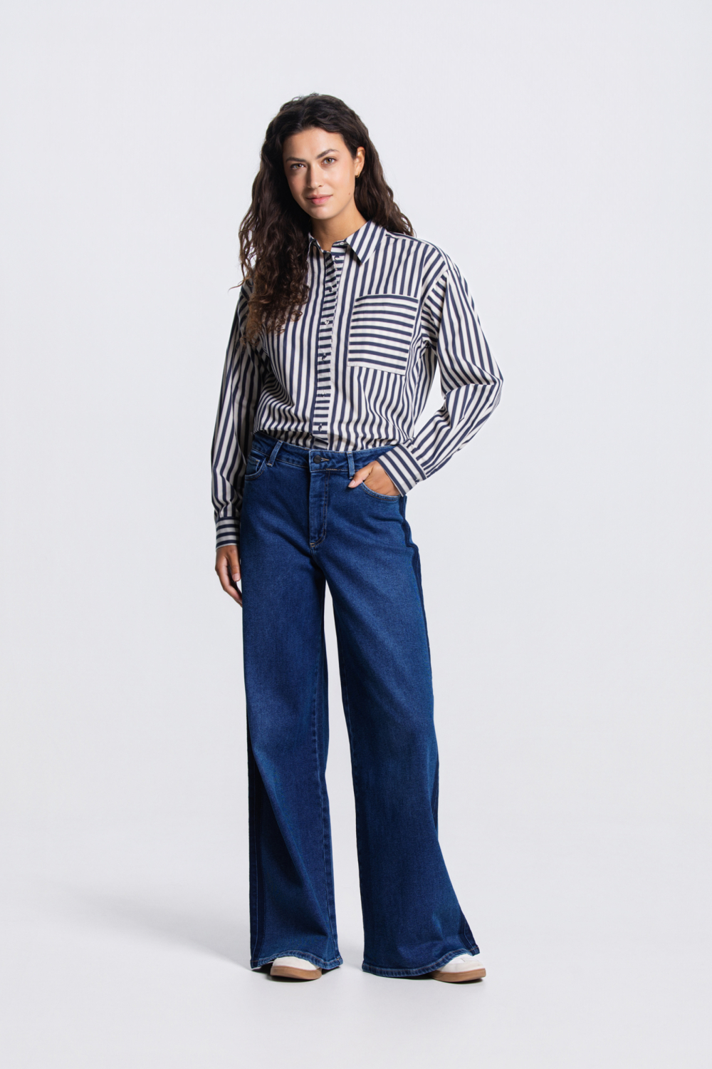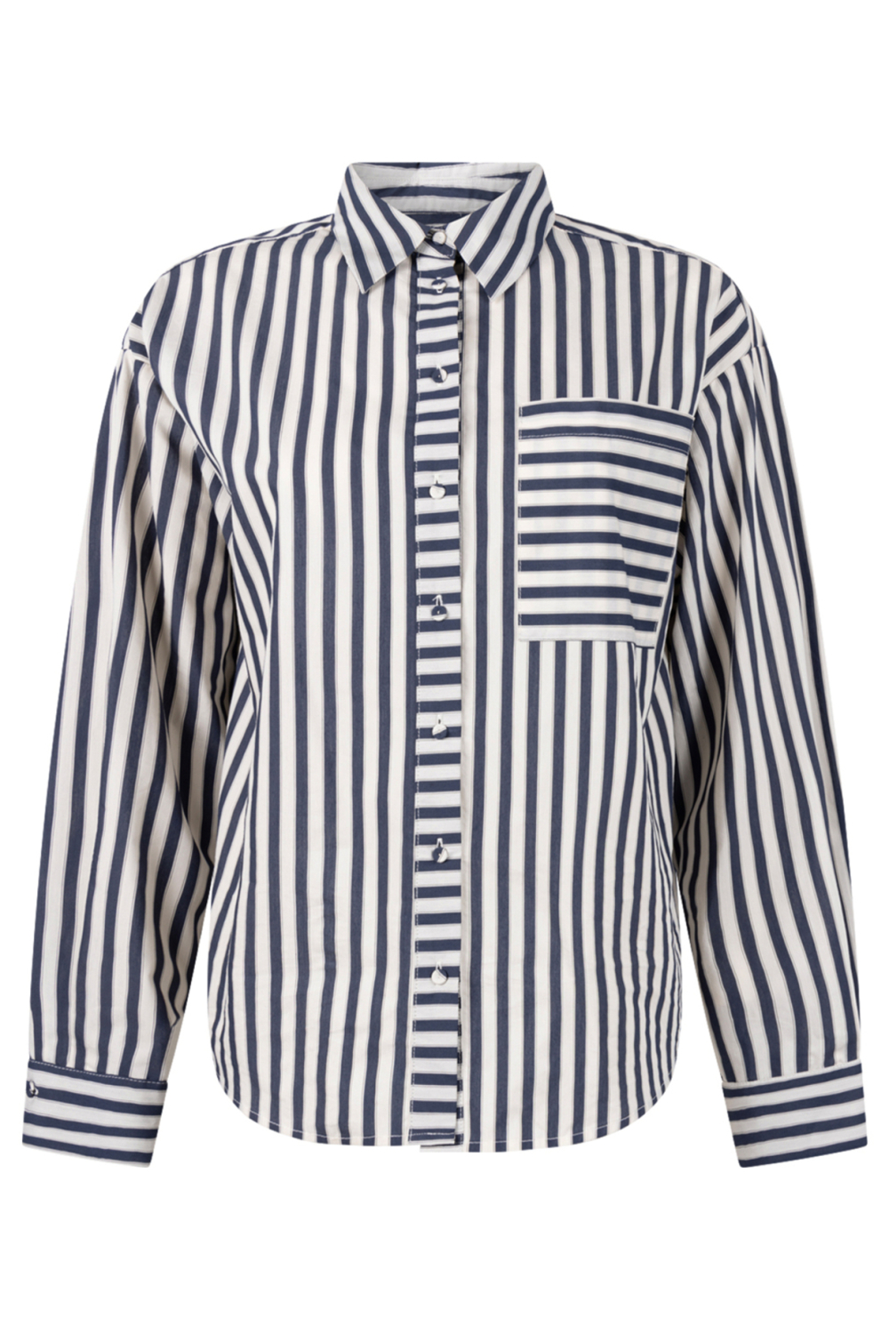 Deze stijlvolle Juffrouw Jansen blouse is een fantastische aanvulling voor je lente garderobe. Met zijn oversized pasvorm biedt deze damesblouse niet alleen comfort, maar ook een moderne, casual uitstraling. Het opvallende streeppatroon in donkerblauw voegt een speelse twist toe, terwijl de knoopsluiting en de puntkraag zorgen voor een klassieke touch. De borstzakken maken het ontwerp niet alleen stijlvol, maar ook praktisch. De blouse is perfect voor diverse gelegenheden. Of je nu een dag op kantoor doorbrengt of een ontspannen middag in de stad plant, hij past bij elke setting. Combineer hem met een stijlvolle jeans voor een casual look, of draag hem met een nette broek voor een wat formelere uitstraling. De lange mouwen maken hem ideaal voor de nog frisse lentedagen. Deze blouse is een duurzame keuze voor de modebewuste vrouw die houdt van veelzijdigheid en klasse.