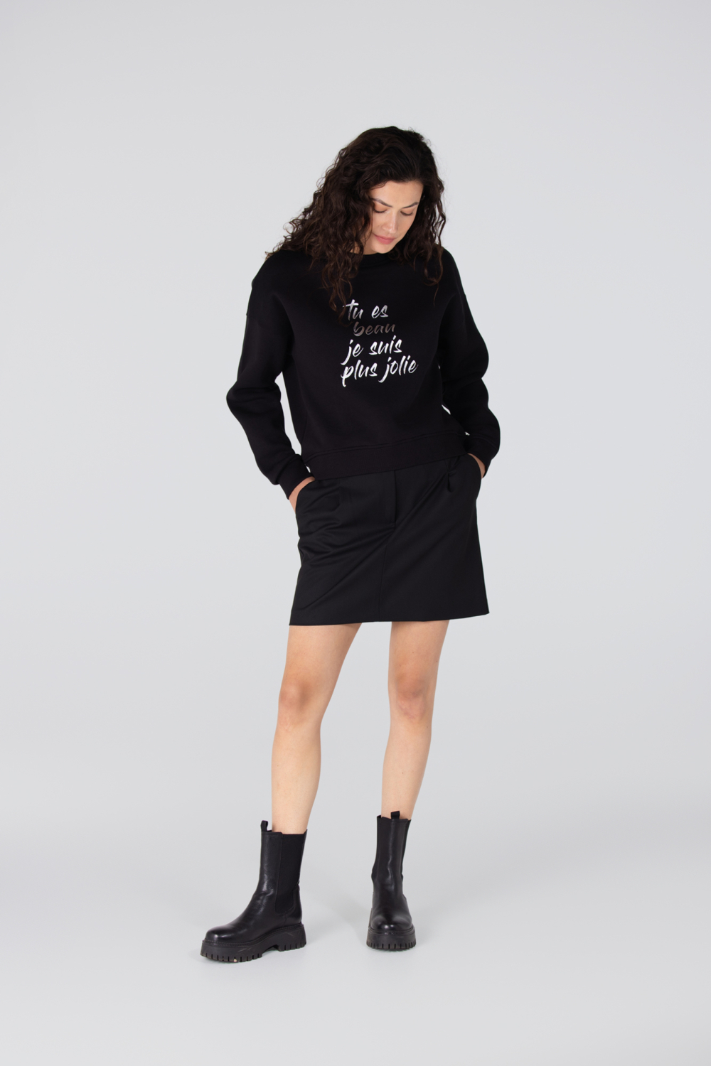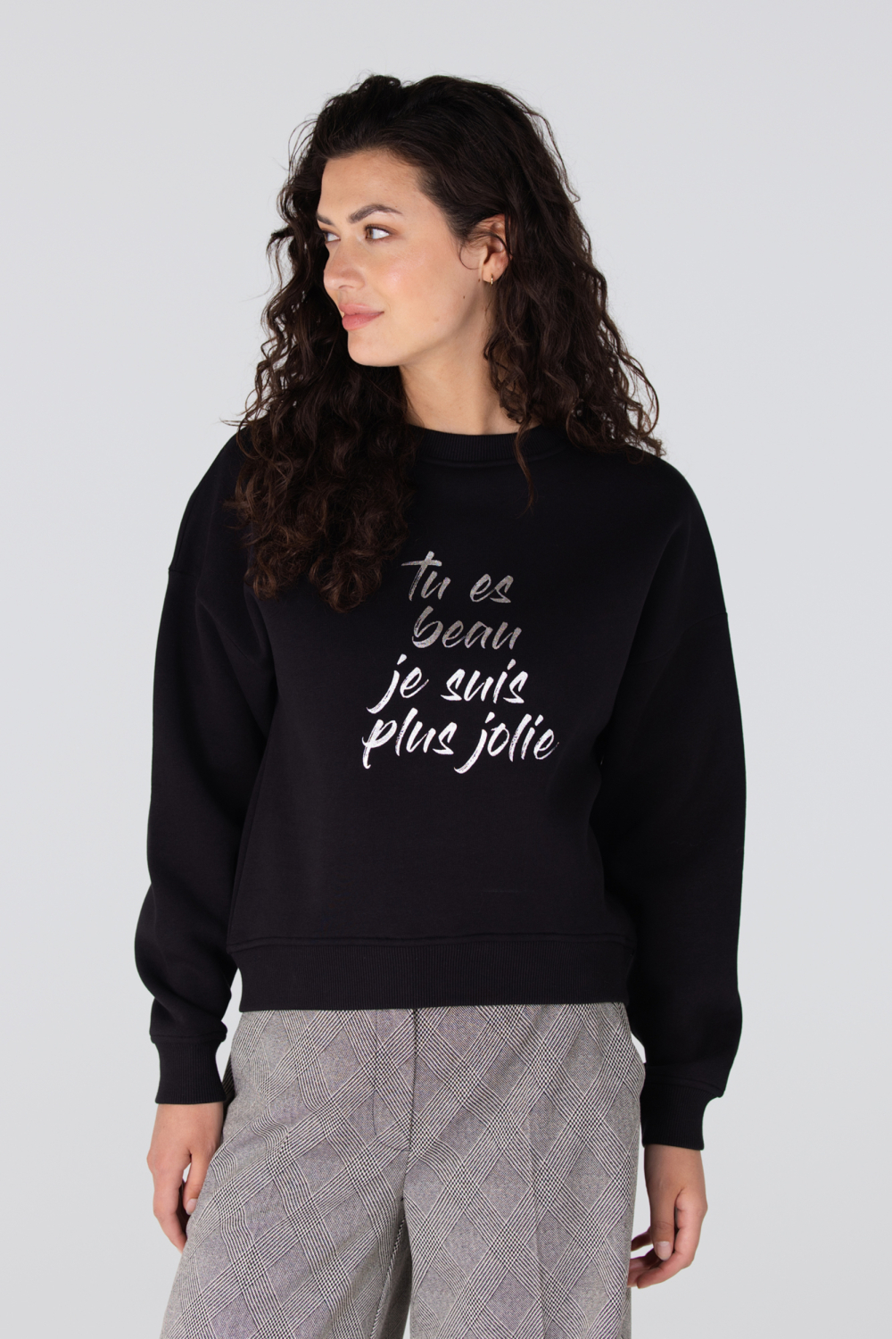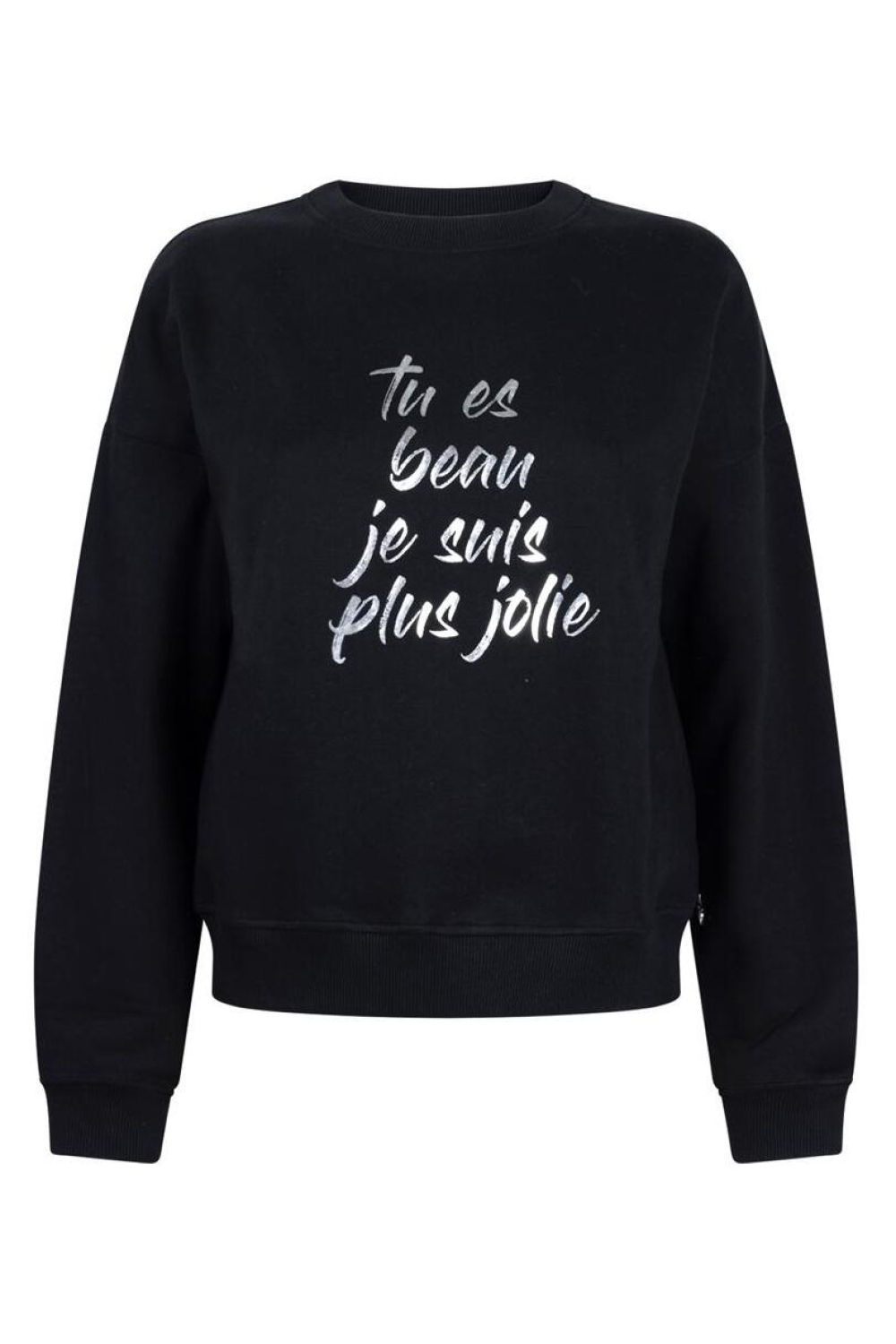 Deze stijlvolle sweater van Juffrouw Jansen is een perfecte aanvulling op je herfstgarderobe. De zwarte kleur met subtiele glitters en de speelse tekstprint "tu es beau, je suis plus jolie" zorgen voor een unieke uitstraling. Gemaakt van 70% katoen en 30% polyester, biedt deze sweater een comfortabele regular fit die ideaal is voor casual gelegenheden. De ronde hals en lange mouwen maken het draagcomfort compleet, wat hem perfect maakt voor een wandeling in het park of een ontspannen dag thuis. De Juffrouw Jansen sweater is veelzijdig en makkelijk te combineren met verschillende outfits. Draag hem met een jeans voor een casual look, of combineer met een rok voor een iets elegantere stijl. Dankzij de normale lengte valt hij mooi op de heupen, wat zorgt voor een flatterende pasvorm. Of je nu gaat voor een dagje shoppen of een relaxte lunch met vrienden, deze sweater biedt je de juiste mix van comfort en stijl.