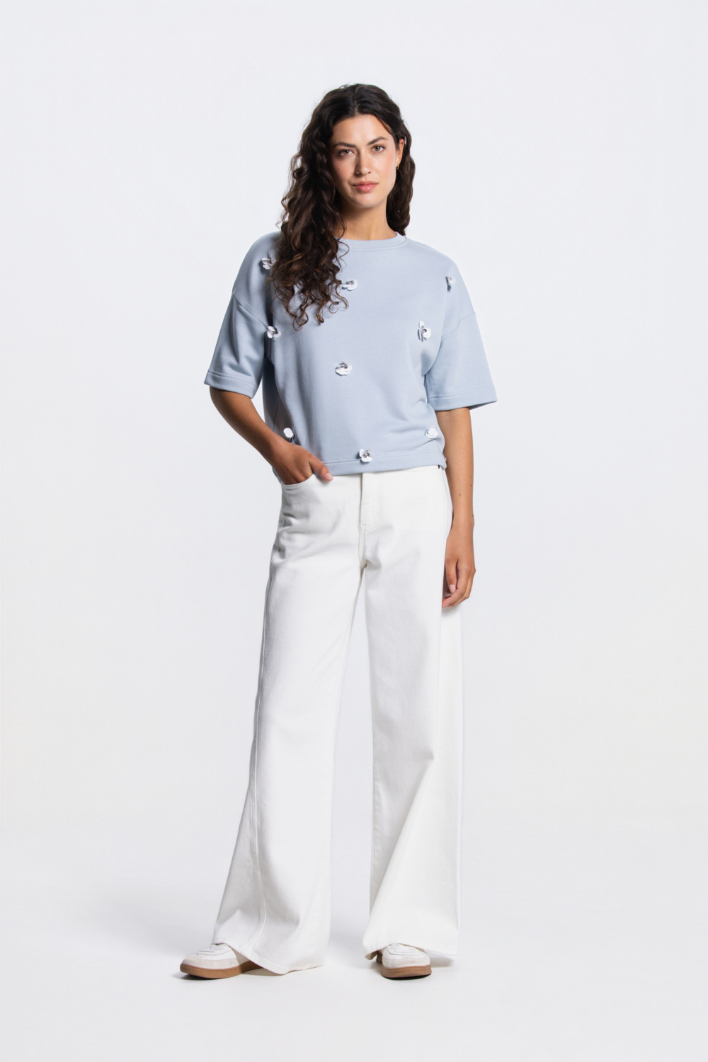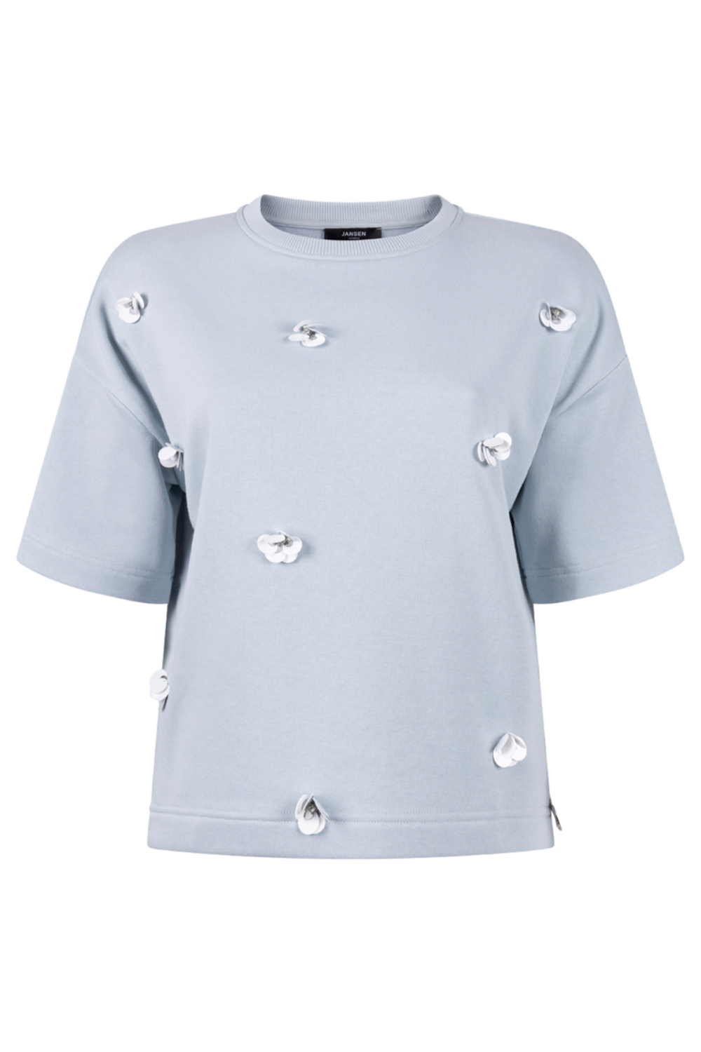 Deze lichtblauwe sweater van Juffrouw Jansen is een onmisbare toevoeging aan je casual garderobe. Gemaakt van een comfortabele mix van 70% katoen en 30% polyester, biedt deze oversized sweater een ontspannen pasvorm die je bewegingsvrijheid geeft zonder in te boeten op stijl. De subtiele structuur van de stof voegt een extra dimensie toe aan het design en de decoratieve details op de voorzijde maken het geheel speels en uniek. De korte mouwen en de ronde hals maken deze sweater perfect voor lente-uitjes of een relaxte middag met vrienden. De korte lengte zorgt ervoor dat je dit item moeiteloos kunt combineren met high-waisted jeans of een elegante rok voor een veelzijdige look die zowel modieus als functioneel is. Of je nu een dagje weg gaat of een rustige dag thuis plant, deze sweater is een stijlvolle en comfortabele keuze.