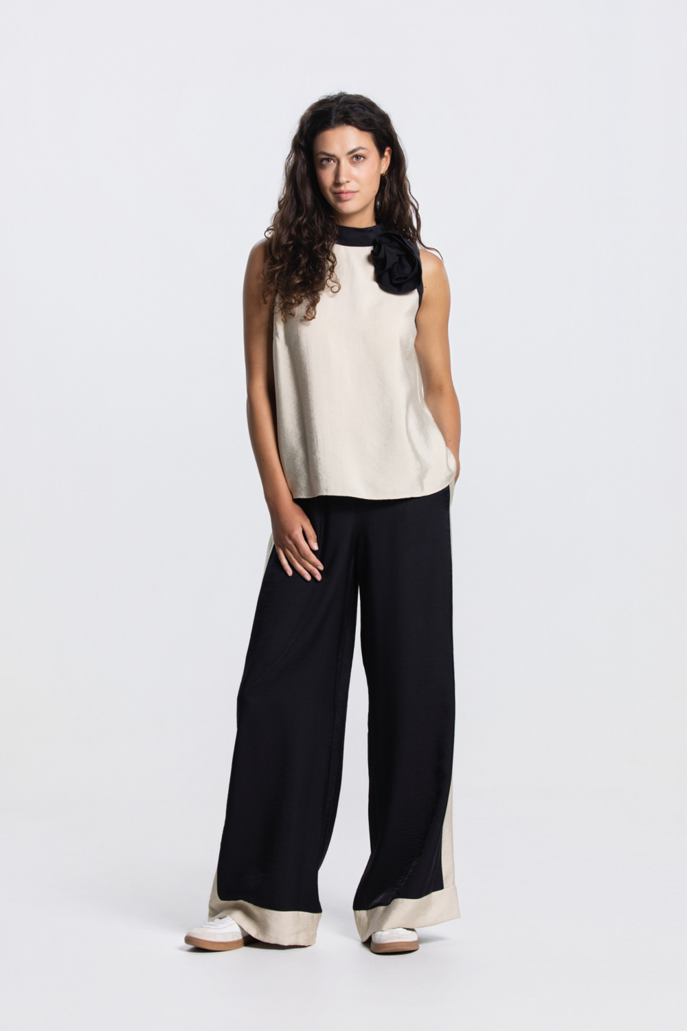Deze chique top van Juffrouw Jansen brengt een verfijnde touch aan je voorjaarsgarderobe. Met zijn stijlvolle high neck en het opvallende bloemdetail op de schouder is deze top een echte blikvanger. De combinatie van de neutrale crèmekleurige body en de contrasterende zwarte accenten zorgt voor een geraffineerde uitstraling. De regular fit en mouwloze snit maken het een comfortabele keuze voor zowel casual als formele gelegenheden. De top is perfect te dragen tijdens een stijlvolle lunch of een avondje uit, gecombineerd met een nette pantalon of een casual jeans. Het materiaal voelt licht aan, ideaal voor de mildere lentedagen, terwijl de knoopsluiting aan de achterkant een subtiele afwerking biedt. Deze dames top laat zich gemakkelijk combineren met diverse outfits, waardoor je steeds weer een unieke look kunt creëren. Voeg je persoonlijke stijl toe met accessoires, en je bent klaar voor elke gelegenheid.