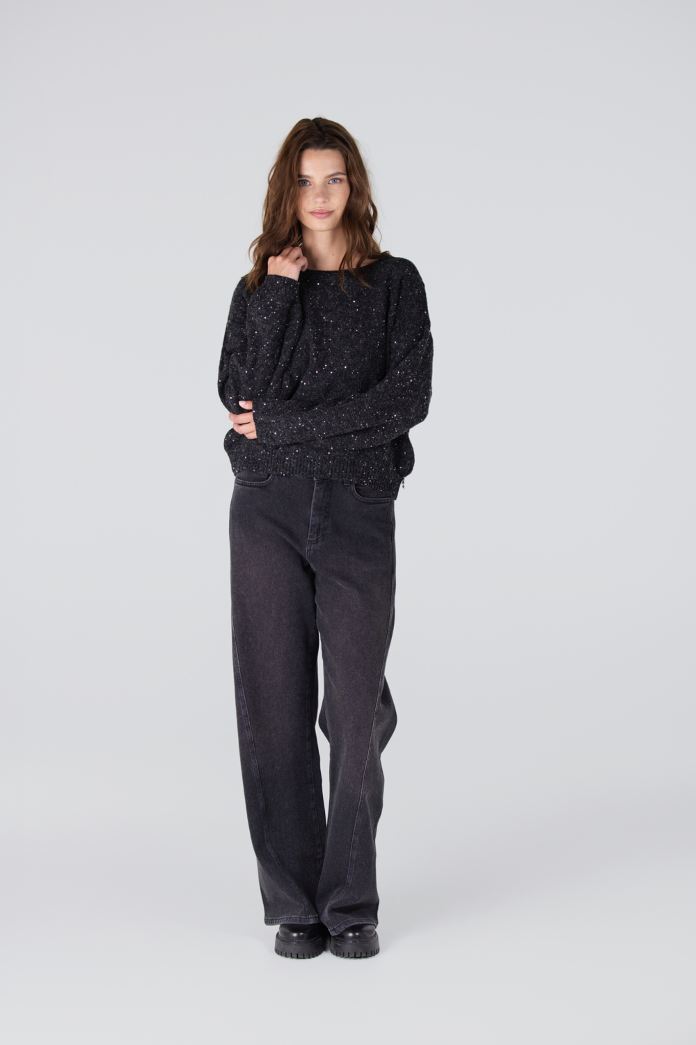 Deze antracietkleurige trui van Juffrouw Jansen is een prachtige toevoeging aan je herfstgarderobe. Het item, met een regular fit, is gemaakt van een mix van acryl, polyester en alpaca, die je het ultieme zachte draagcomfort biedt. De trui heeft een elegante ronde hals en is voorzien van glinsterende pailletten die een subtiele sprankeling toevoegen aan je dagelijkse look. Dankzij de normale lengte en lange mouwen is het een veelzijdig stuk dat stijl en warmte combineert. Met zijn verfijnde knitwear-stijl is deze trui ideaal voor diverse gelegenheden, van een casual dag op kantoor tot een diner met vrienden. Combineer het met een donkere jeans of een nette pantalon en je bent klaar om de dag met vertrouwen tegemoet te treden. Of je nu binnen of buiten bent, met deze trui blijf je moeiteloos stijlvol in het wisselende herfstweer.