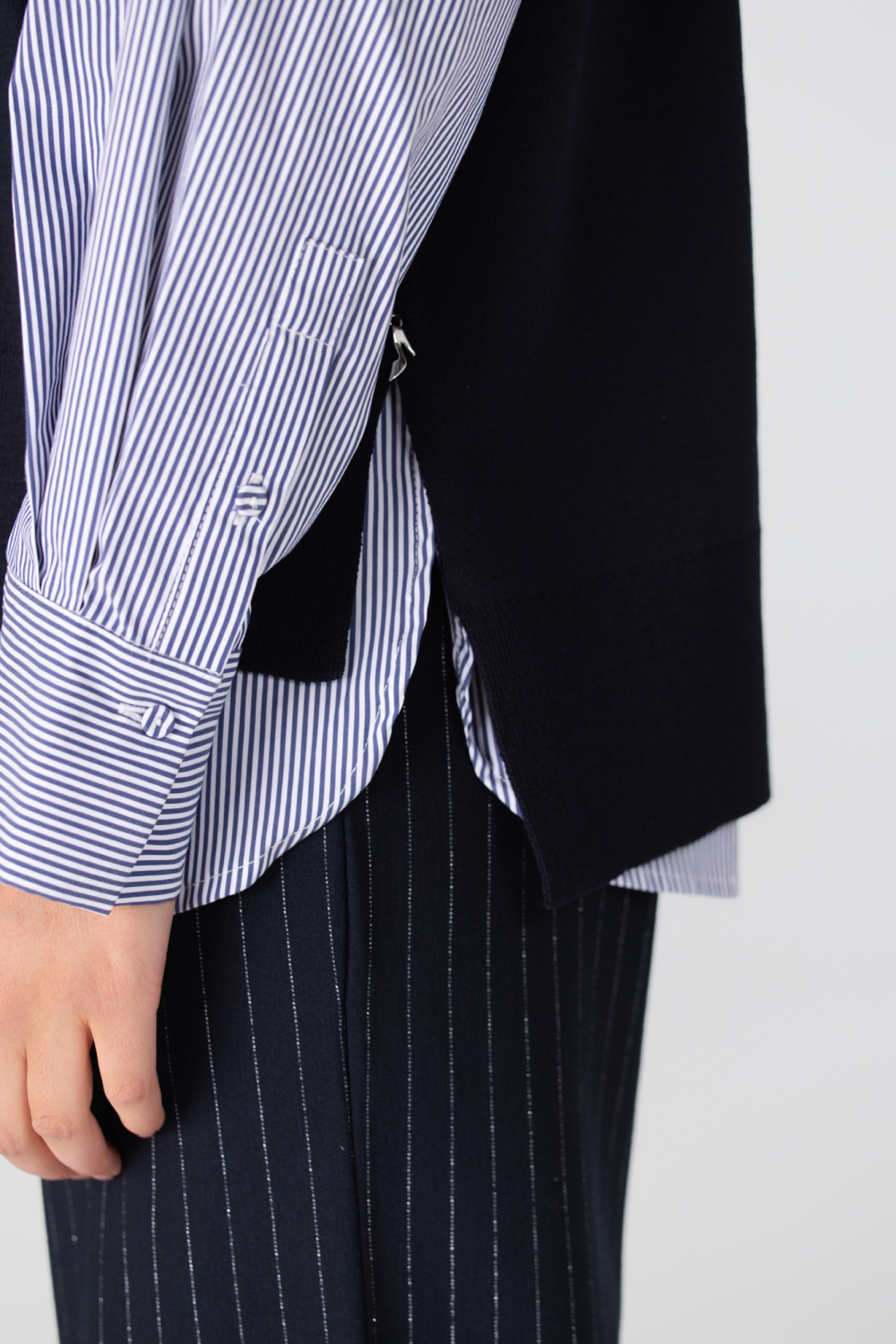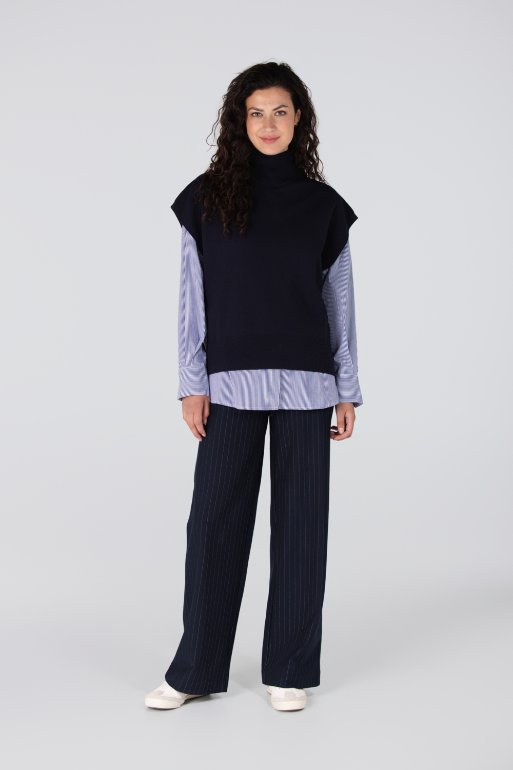 De mouwloze, oversized trui van Juffrouw Jansen in dark blue is een must-have voor jouw herfstgarderobe. De elegante hoge kraag en de soepele pasvorm geven je een moderne uitstraling zonder aan comfort in te boeten. Gemaakt van 78% viscose en 22% polyester, is deze trui zacht en licht. Dankzij de diepe kleur is het een veelzijdig stuk dat je eenvoudig kunt combineren met verschillende outfits. Dit item is ideaal voor casual dagen of om een stijlvolle laag over een blouse of overhemd te creëren. De normale lengte maakt het gemakkelijk te dragen met zowel jeans als nette broeken. Of je nu thuis ontspant of een afspraak in de stad hebt, deze trui biedt de juiste balans tussen stijl en comfort. Voeg een vleugje verfijning toe aan je dagelijkse look met dit prachtige knitwear stuk van Juffrouw Jansen.