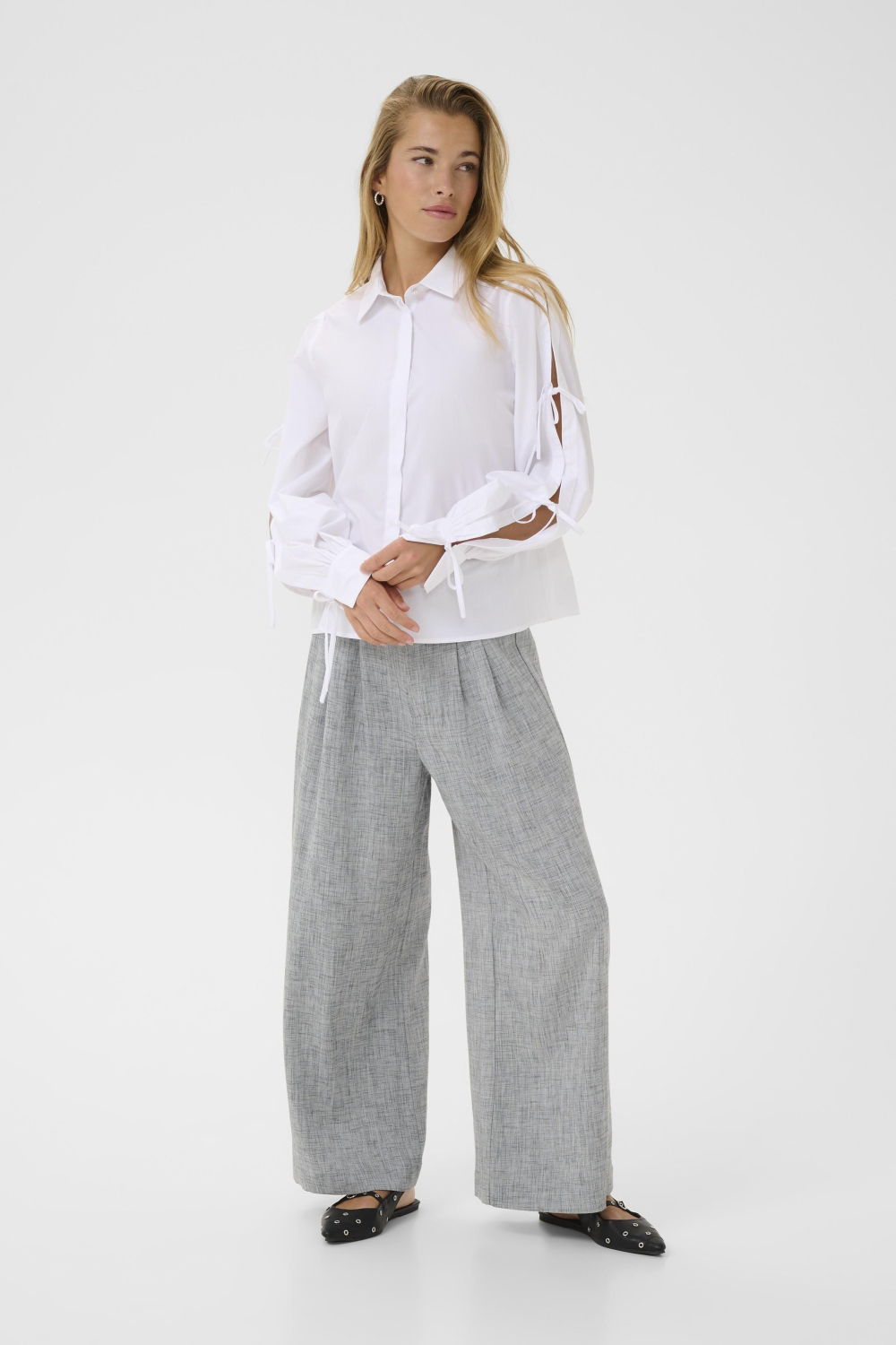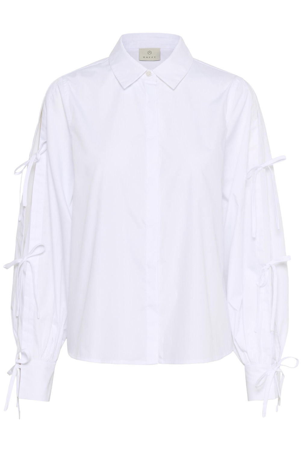 Deze elegante Kaffe blouse in de kleur Optical White is een veelzijdige keuze voor je najaarsgarderobe. Met een samenstelling van 80% polyester en 20% katoen biedt het een aangename mix van comfort en stijl. De blouse heeft een regular fit die zorgt voor een ontspannen pasvorm. De lange mouwen zijn voorzien van decoratieve strikdetails, wat een speelse twist geeft aan het verder klassieke ontwerp. De puntkraag en knoopsluiting maken het geheel af, waardoor deze blouse gemakkelijk te combineren is met zowel zakelijke als casual outfits.
