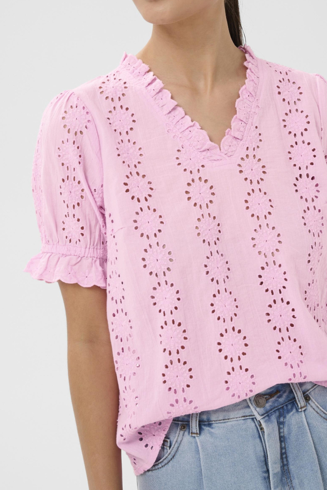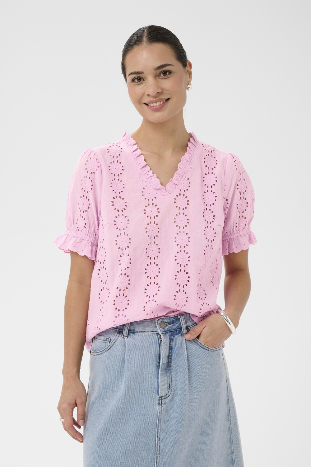 Dit casual Kaffe T-shirt voor dames is een must voor de lente. Het T-shirt heeft een stijlvolle V-hals en is vervaardigd met een prachtig kantpatroon dat een verfijnde uitstraling geeft. De zachte roze kleur is niet alleen trendy, maar maakt het ook makkelijk te combineren met diverse outfits. De regular fit zorgt voor een relaxte pasvorm, ideaal voor dagelijks gebruik of een ontspannen dagje uit. De korte mouwen met subtiele ruches voegen een speelse touch toe en maken het luchtig genoeg voor warmere dagen. Dankzij het tijdloze design is dit T-shirt de perfecte aanvulling op je lente-garderobe. Combineer het met een denim rok of een lichte pantalon voor een frisse, casual look. Of je nu een dagje gaat shoppen met vriendinnen of geniet van een zonnige picknick in het park, dit T-shirt biedt comfort en stijl in één. Met zijn normale lengte kun je het gemakkelijk zowel in als uit de broek dragen, afhankelijk van je stijlvoorkeur. Voeg een vleugje elegantie toe aan je dagelijkse outfits met dit veelzijdige Kaffe T-shirt.
