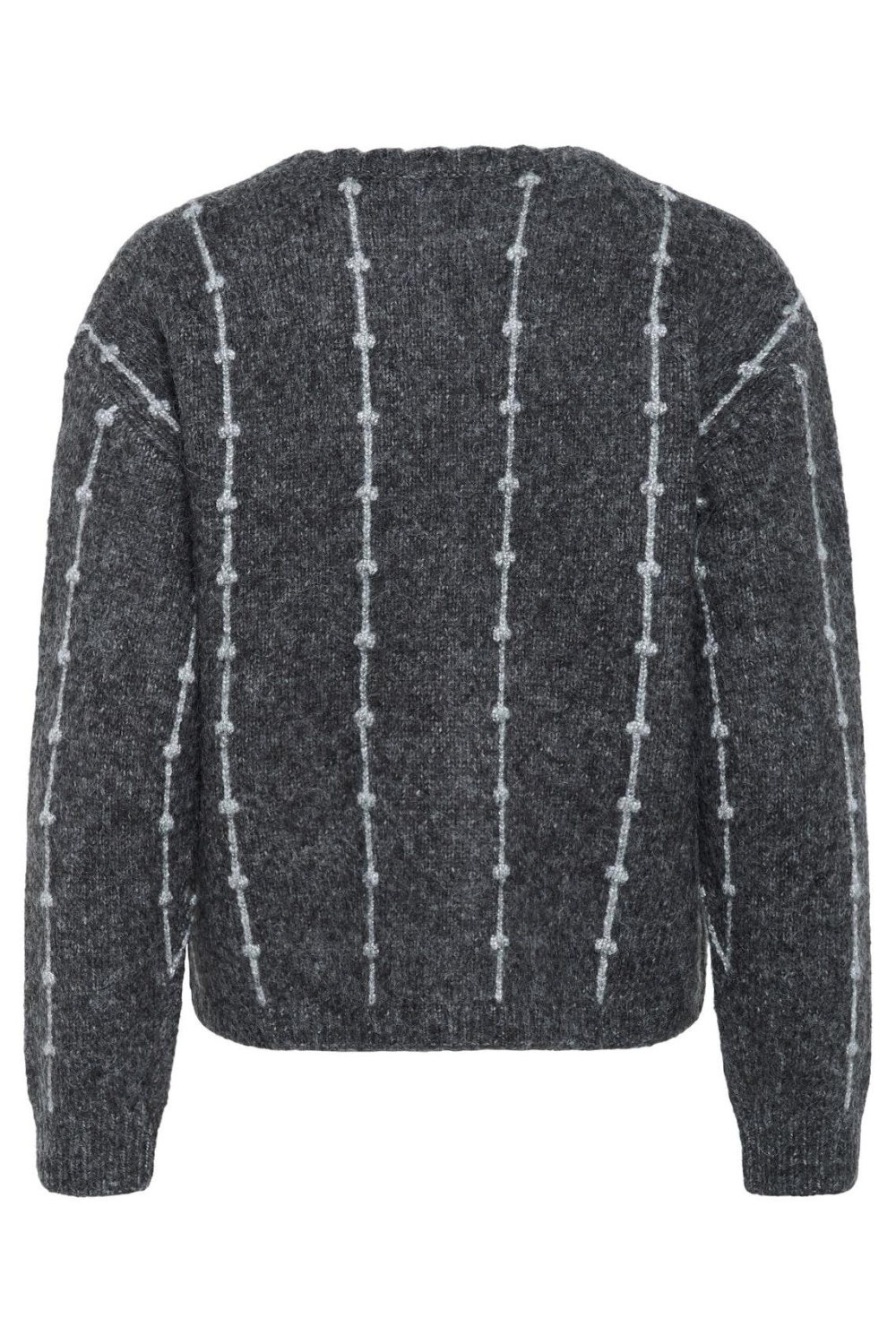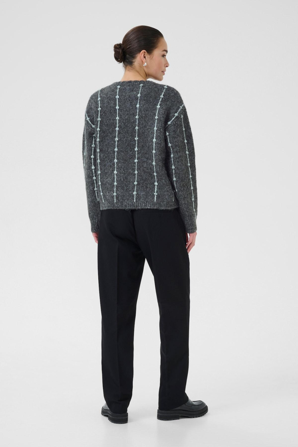 De Kaffe trui in 100125 DARK GREY MELANGE is een stijlvolle toevoeging aan je herfstgarderobe. Dit knitwear-design met een regular fit combineert gemak en elegantie. De trui heeft een ronde hals die voor een comfortabele en ontspannen pasvorm zorgt. De speelse glitterdetails in het patroon voegen een subtiele flair toe aan de klassieke donkere kleur. Geschikt voor zowel informele als nettere gelegenheden, kun je deze trui makkelijk combineren met een casual jeans of een nette broek.