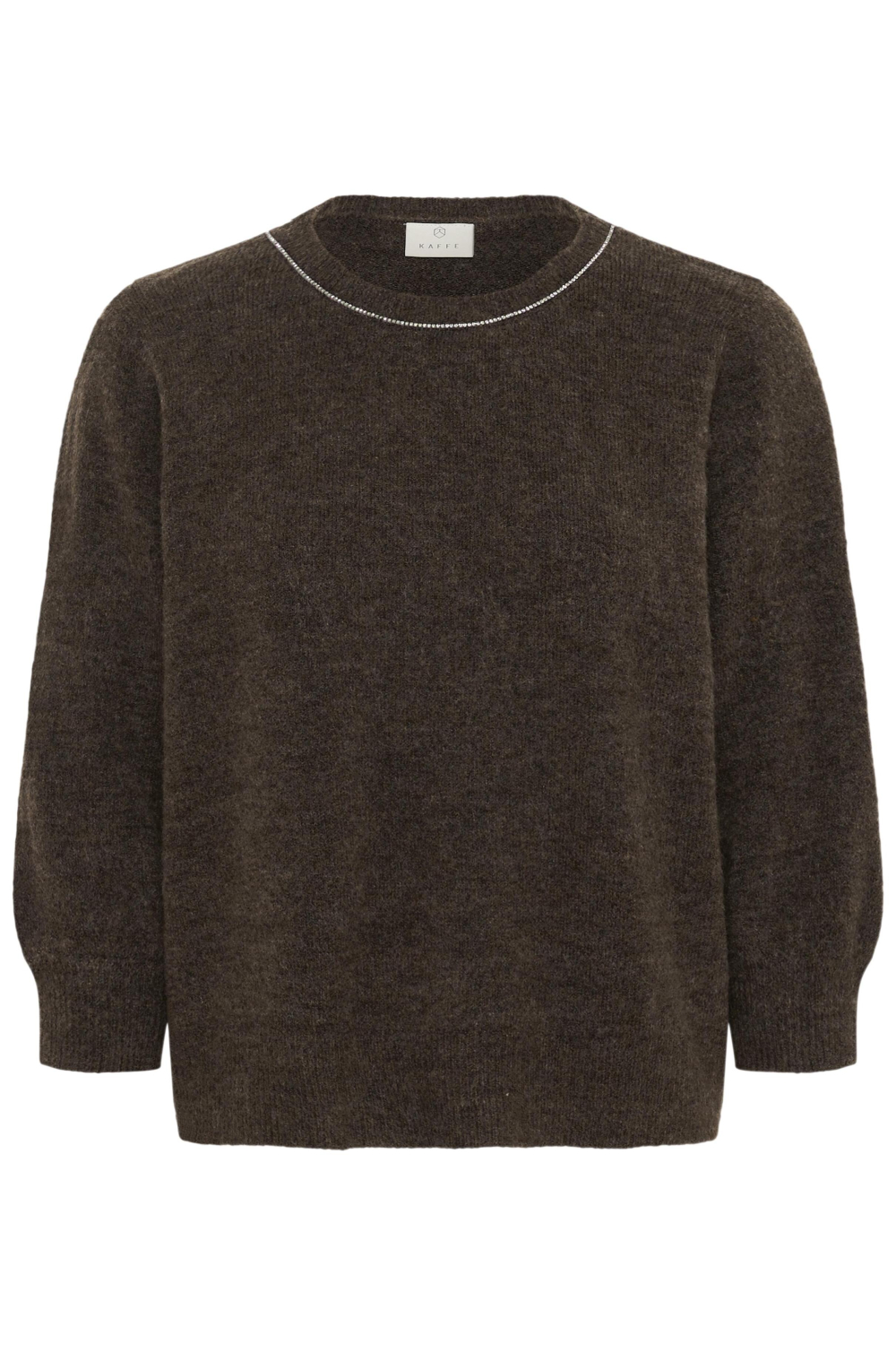 Deze stijlvolle trui van Kaffe is een perfecte aanvulling voor je wintergarderobe. Het item heeft een regular fit pasvorm en is gemaakt van een zachte mix van acryl, polyester en elastaan, waardoor je comfortabel warm blijft op koude dagen. De diepe bruine kleur en het subtiele strass-patroon rond de ronde hals geven de trui een elegante uitstraling. Met de driekwart mouwen kun je makkelijk lagen combineren, ideaal voor zowel casual als iets formelere gelegenheden. Dankzij het tijdloze design en de veelzijdige kleur past deze Kaffe trui moeiteloos bij je favoriete jeans of een nette rok. De normale lengte zorgt voor een klassieke look die je zowel thuis als op kantoor kunt dragen. Voor een gezellige dag buiten of een ontspannen avond binnen, biedt deze knitwear zeker een stijlvolle en comfortabele keuze. Moeiteloos te combineren, deze trui is een waardevolle aanvulling op je garderobe.