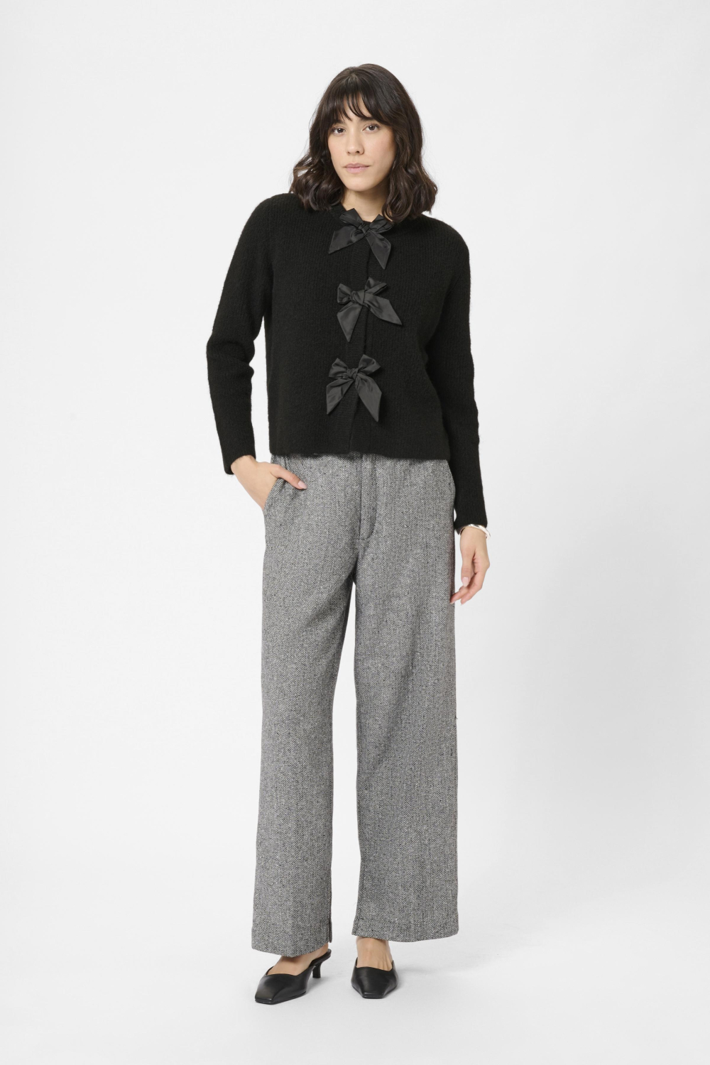 Deze stijlvolle zwarte knitwear trui van Kaffe, met de fabrikant kleur Black Deep, is een prachtige toevoeging aan jouw wintergarderobe. De ronde hals en lange mouwen zorgen voor een tijdloze uitstraling, terwijl de unieke drukknoopsluiting verrijkt is met mooie satijnen strikken. De structuur van de stof geeft het vest een chique uitstraling die moeiteloos combineert met verschillende stijlen. Ondanks het ontbreken van zakken, compenseert de trui dit meer dan voldoende met zijn fraaie design en hoogwaardige afwerking.Dit Kaffe vest is veelzijdig en geschikt voor vele gelegenheden. Of je nu een dag op kantoor hebt of een casual uitje plant, het vest biedt de perfecte mix van comfort en stijl. Dankzij de regular fit pasvorm zit het vest altijd goed en comfortabel. Combineer het met een elegante pantalon voor een zakelijke look of draag het casual met een jeans voor een relaxte avond. Het duurzame karakter van de trui maakt het niet alleen mooi maar ook een bewuste keuze voor je kledingcollectie.